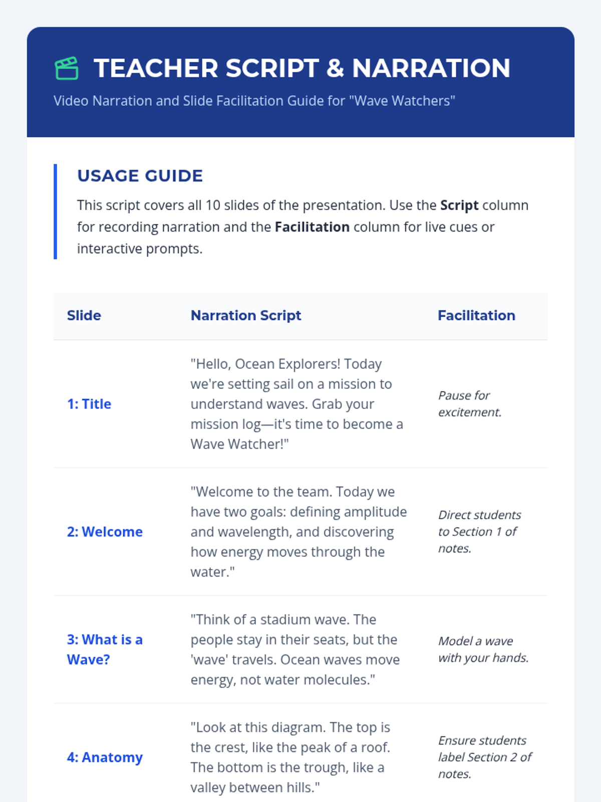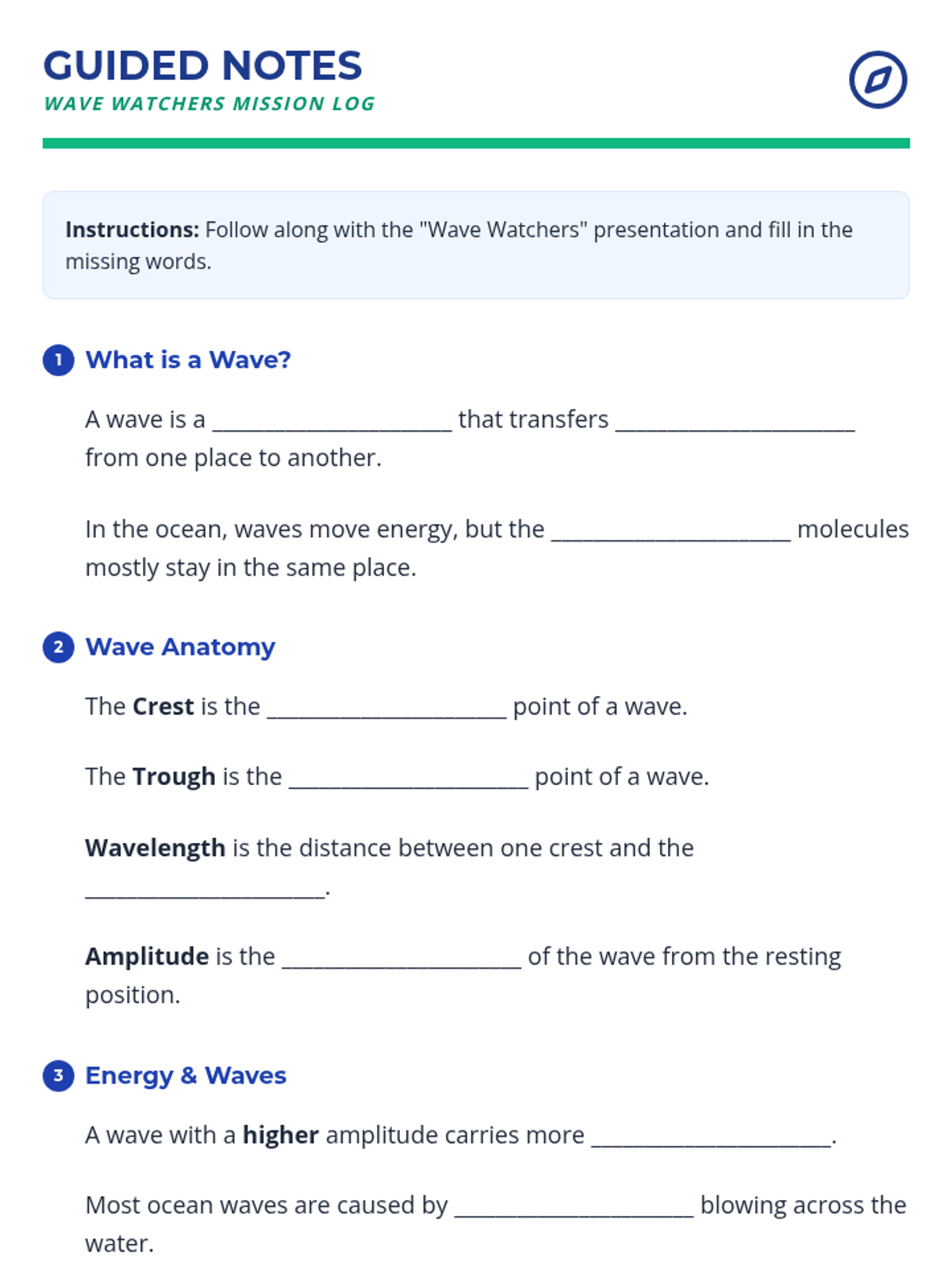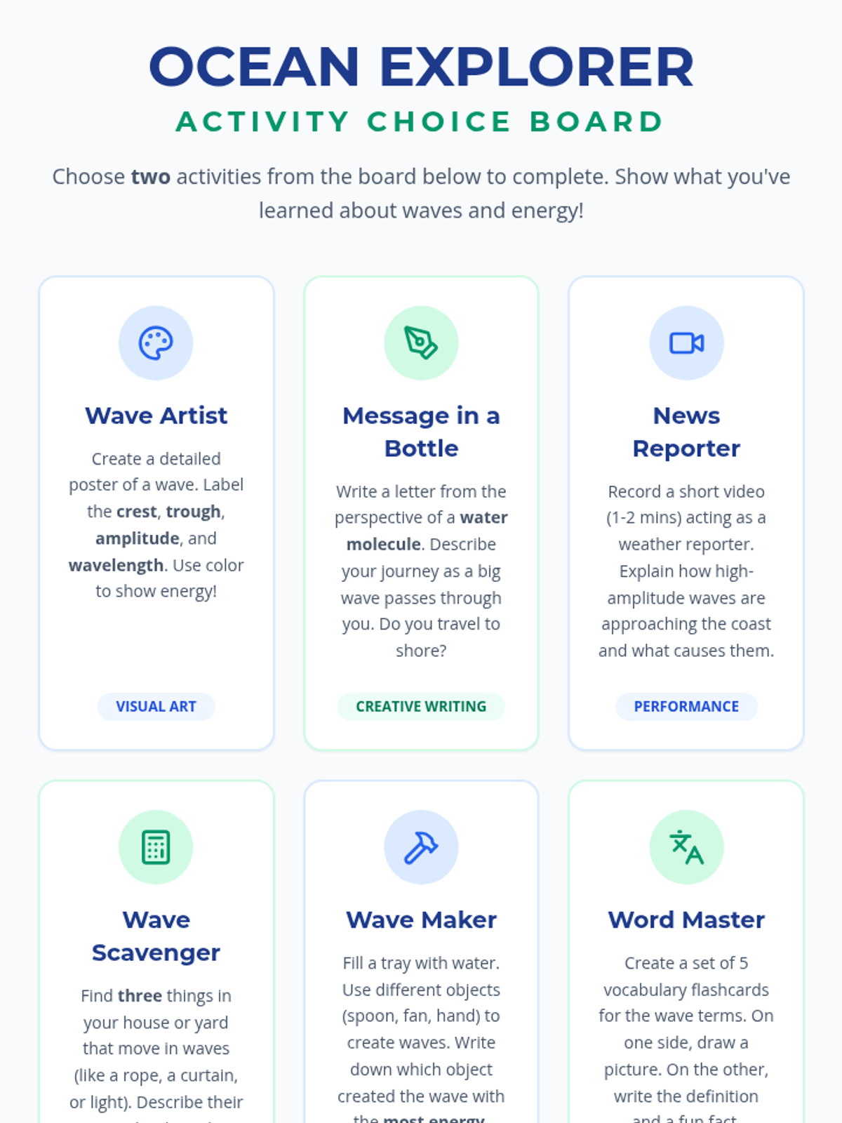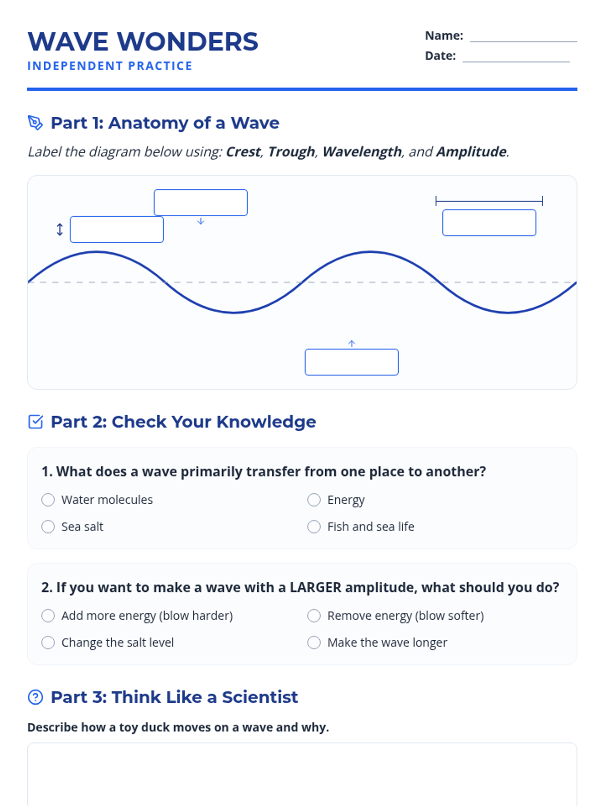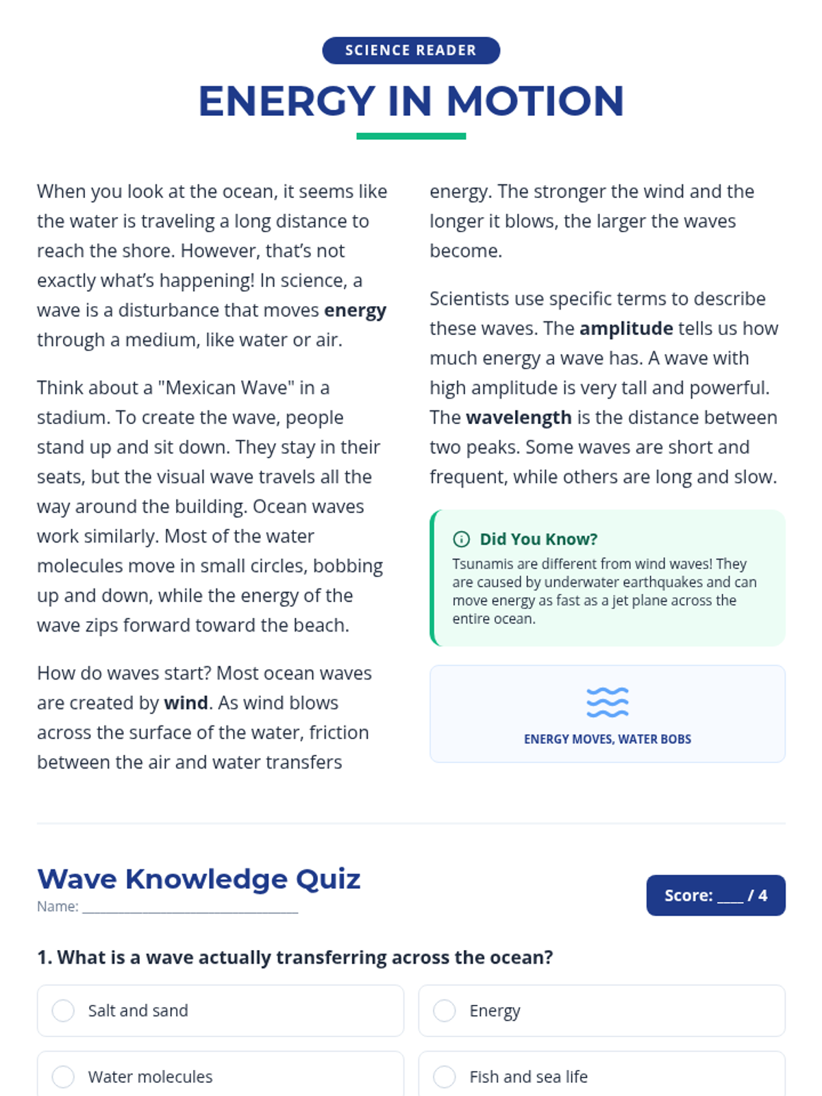 An asynchronous lesson for fourth graders exploring the properties of ocean waves, specifically amplitude and wavelength, and how they transfer energy across the sea.