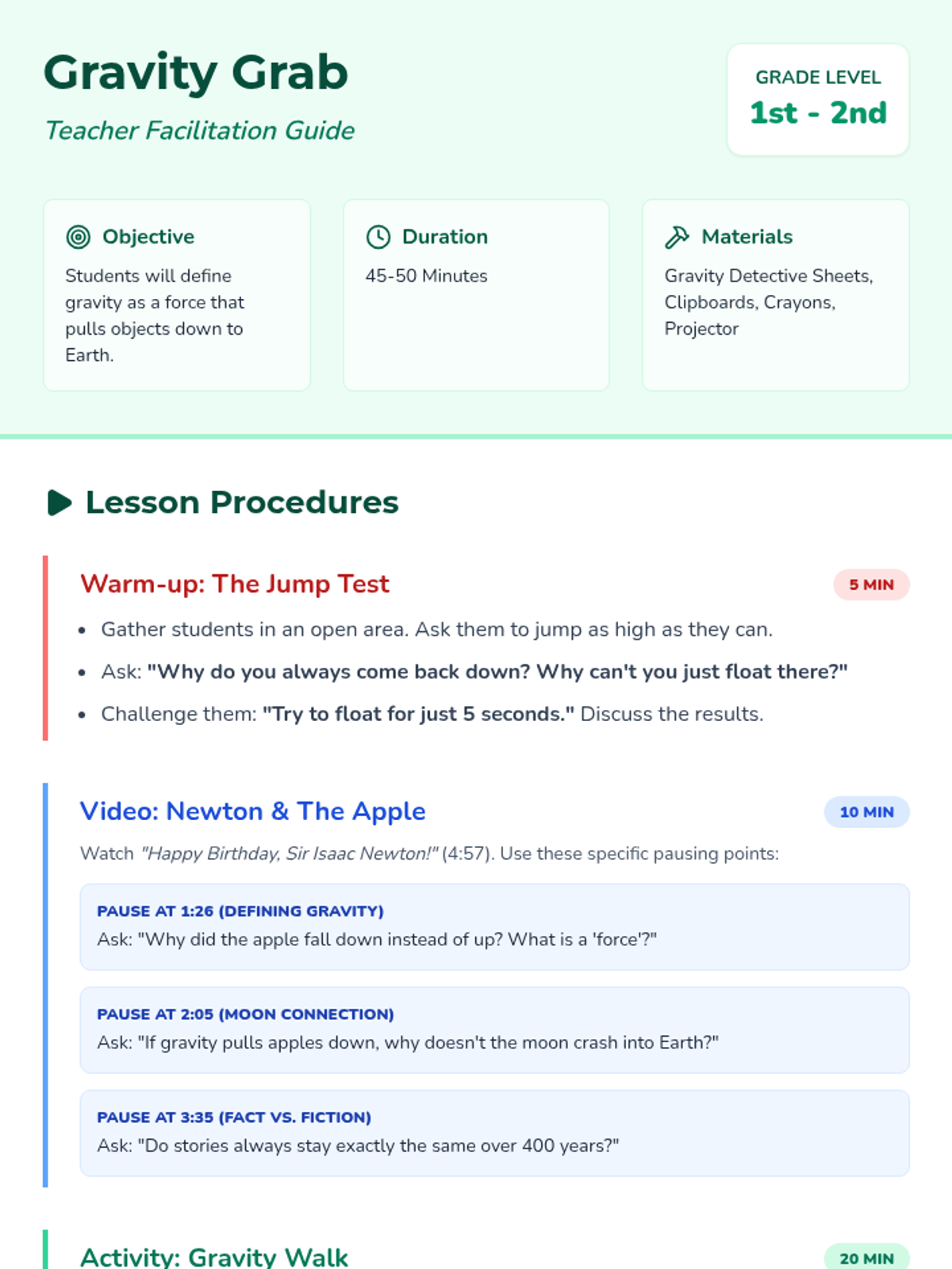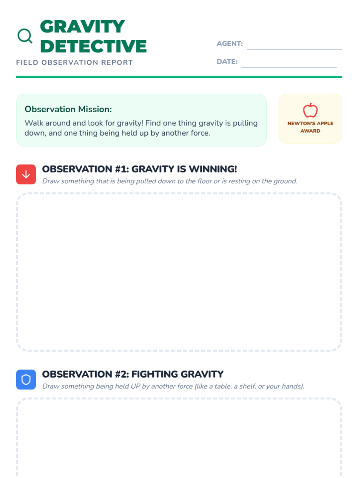 Students explore the concept of gravity through movement and observation, defining it as a force that pulls everything toward Earth, inspired by Sir Isaac Newton's apple story.