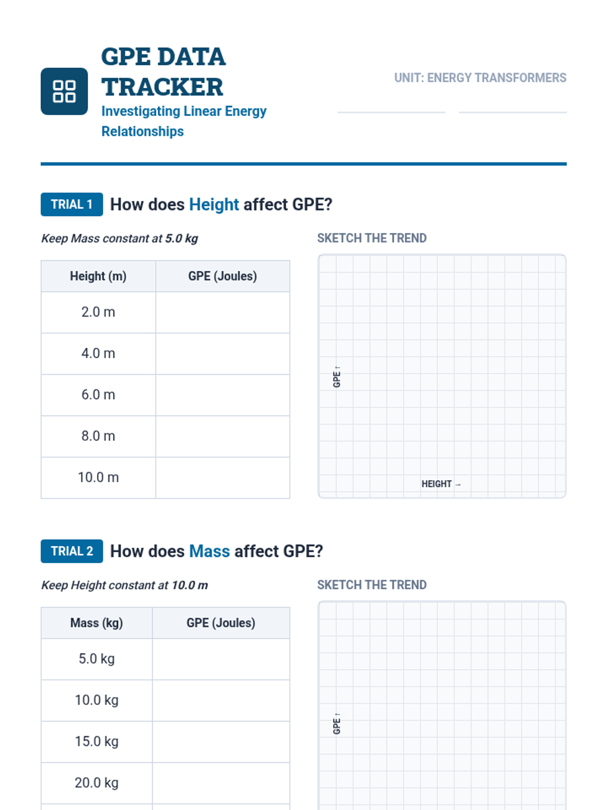 Students use virtual simulations to collect data on how mass and height affect Gravitational Potential Energy (GPE), then graph their results to identify linear relationships.