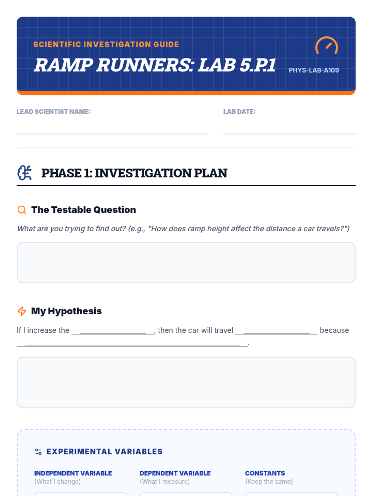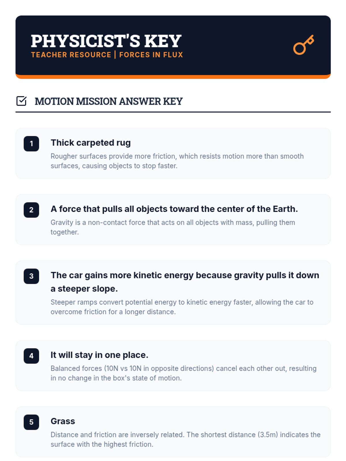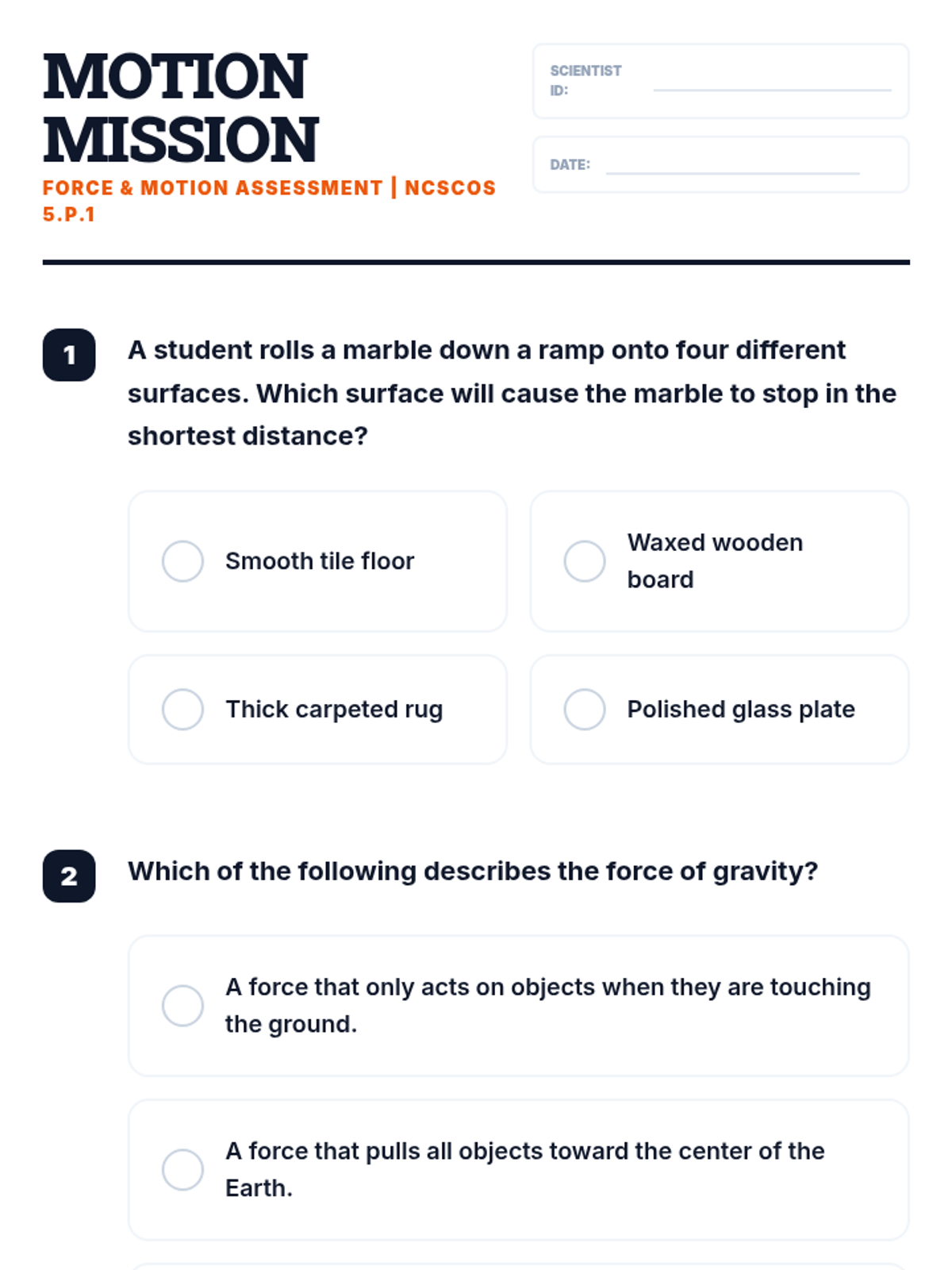 A comprehensive Grade 5 science lesson exploring the forces of gravity, friction, and applied force on the motion of objects, including a hands-on ramp investigation and EOG-style assessment.