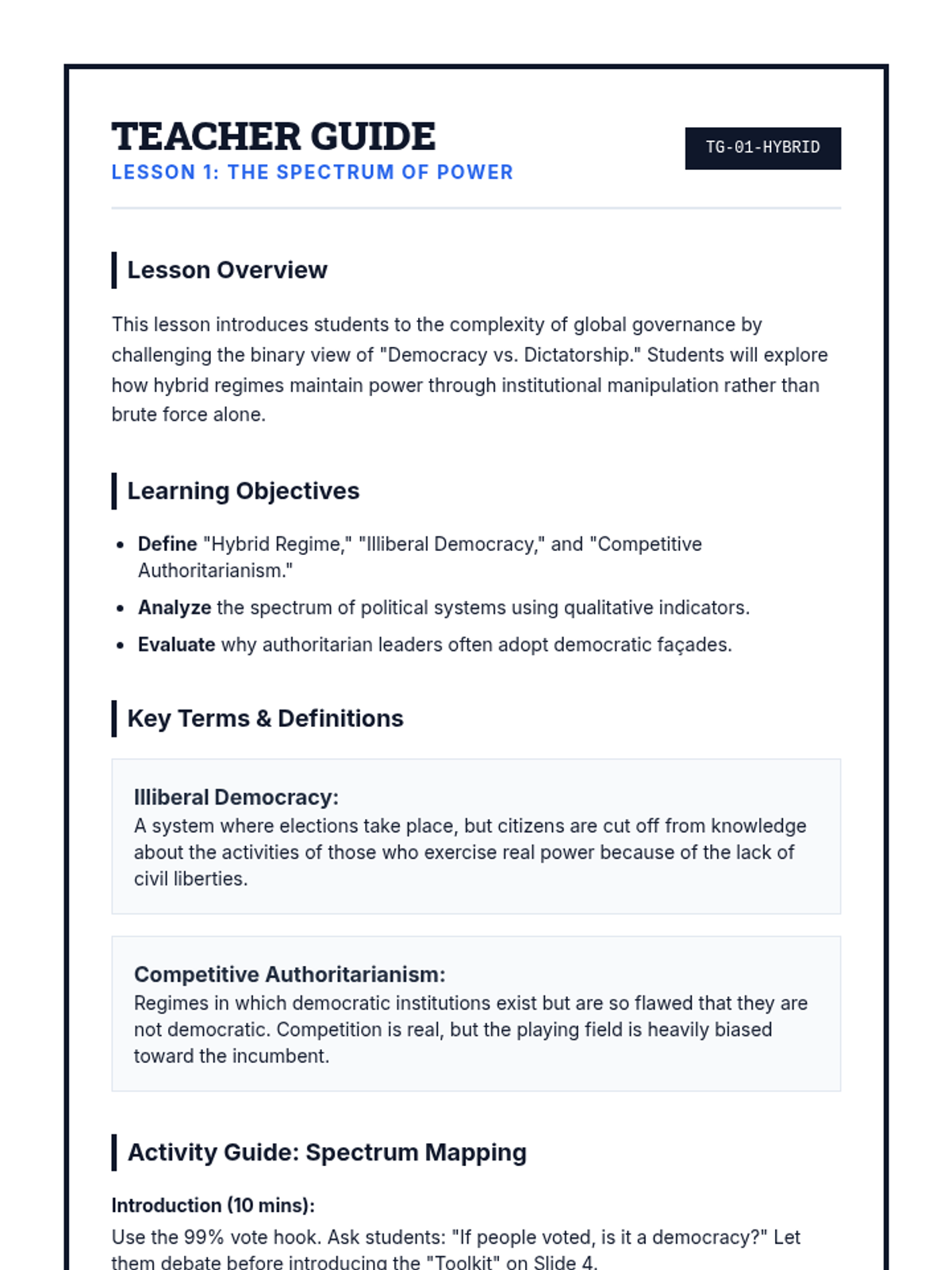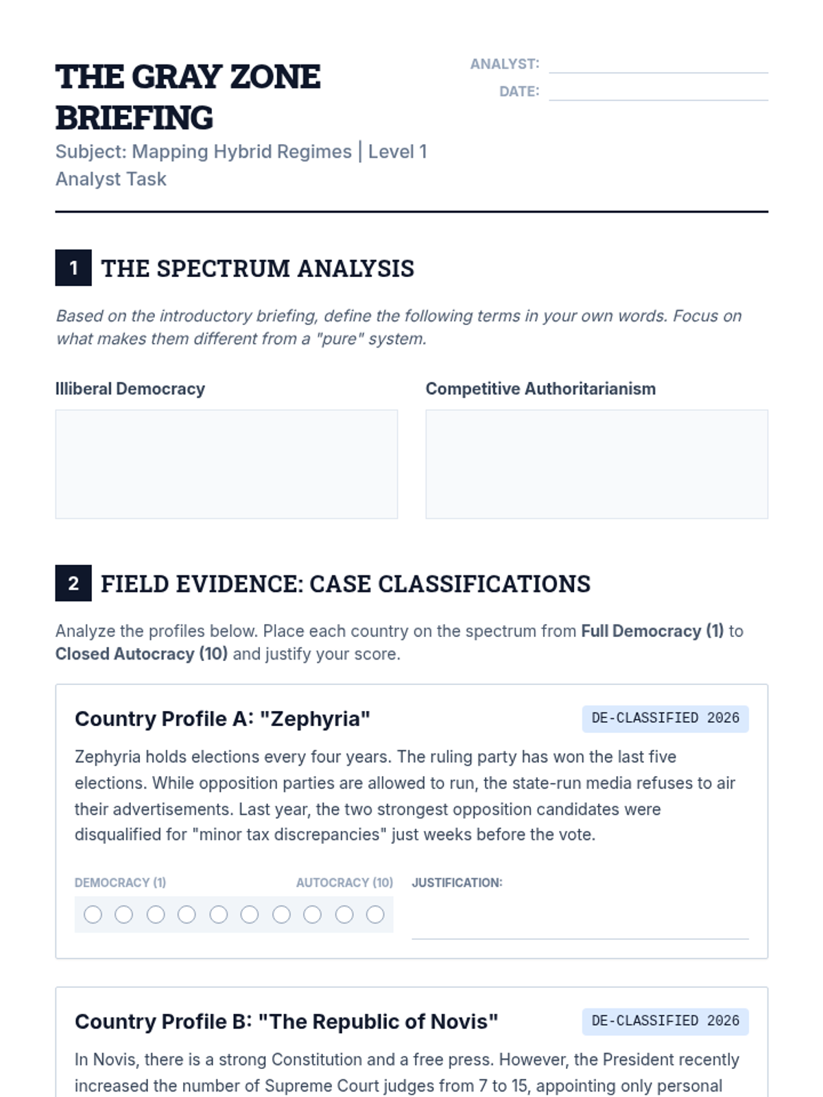 Students define hybrid regimes and explore the spectrum between democracy and autocracy using global data and case studies.