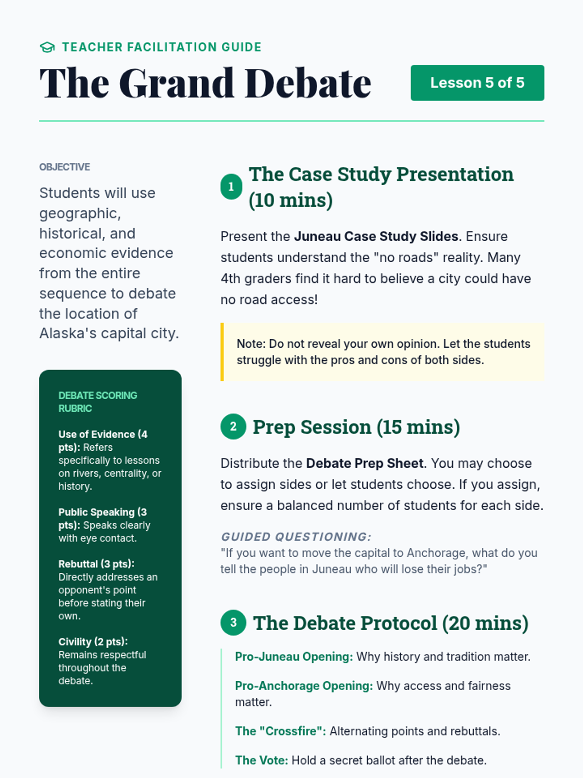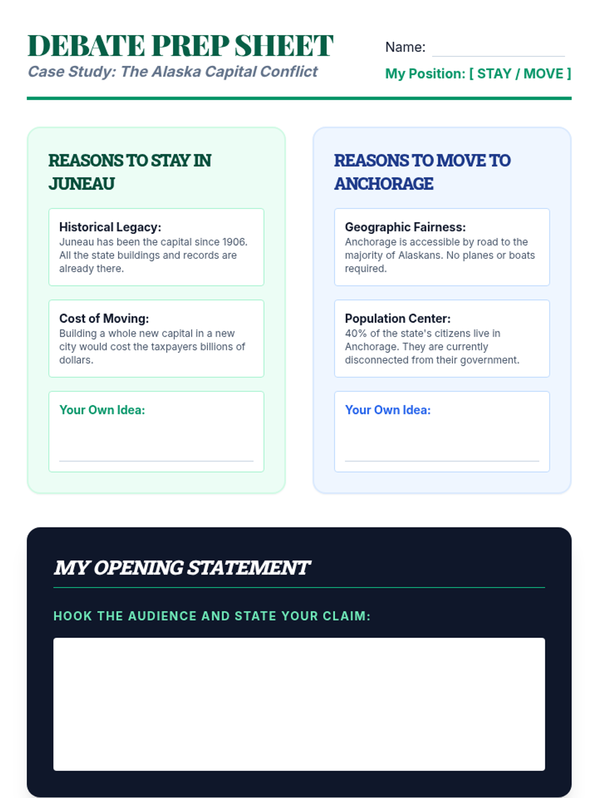 Students use evidence to debate whether modern states should move their capitals, focusing on a case study of Juneau, Alaska.