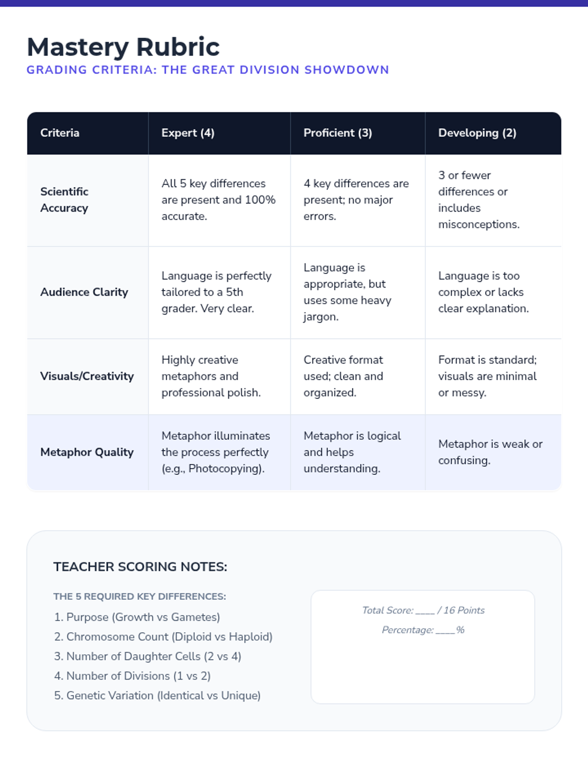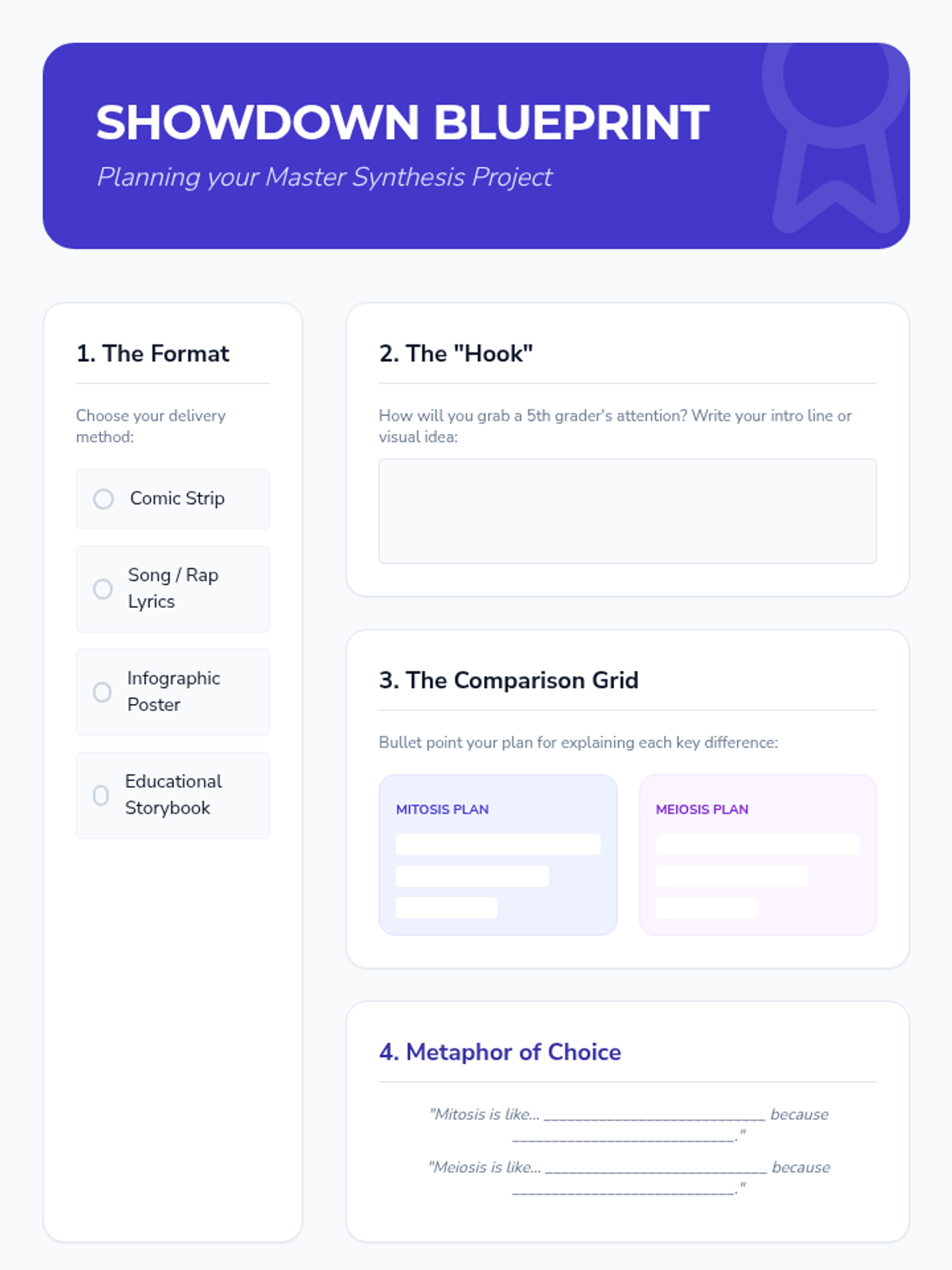 Students synthesize their learning by creating a final creative project that explains the differences between mitosis and meiosis to a younger audience.