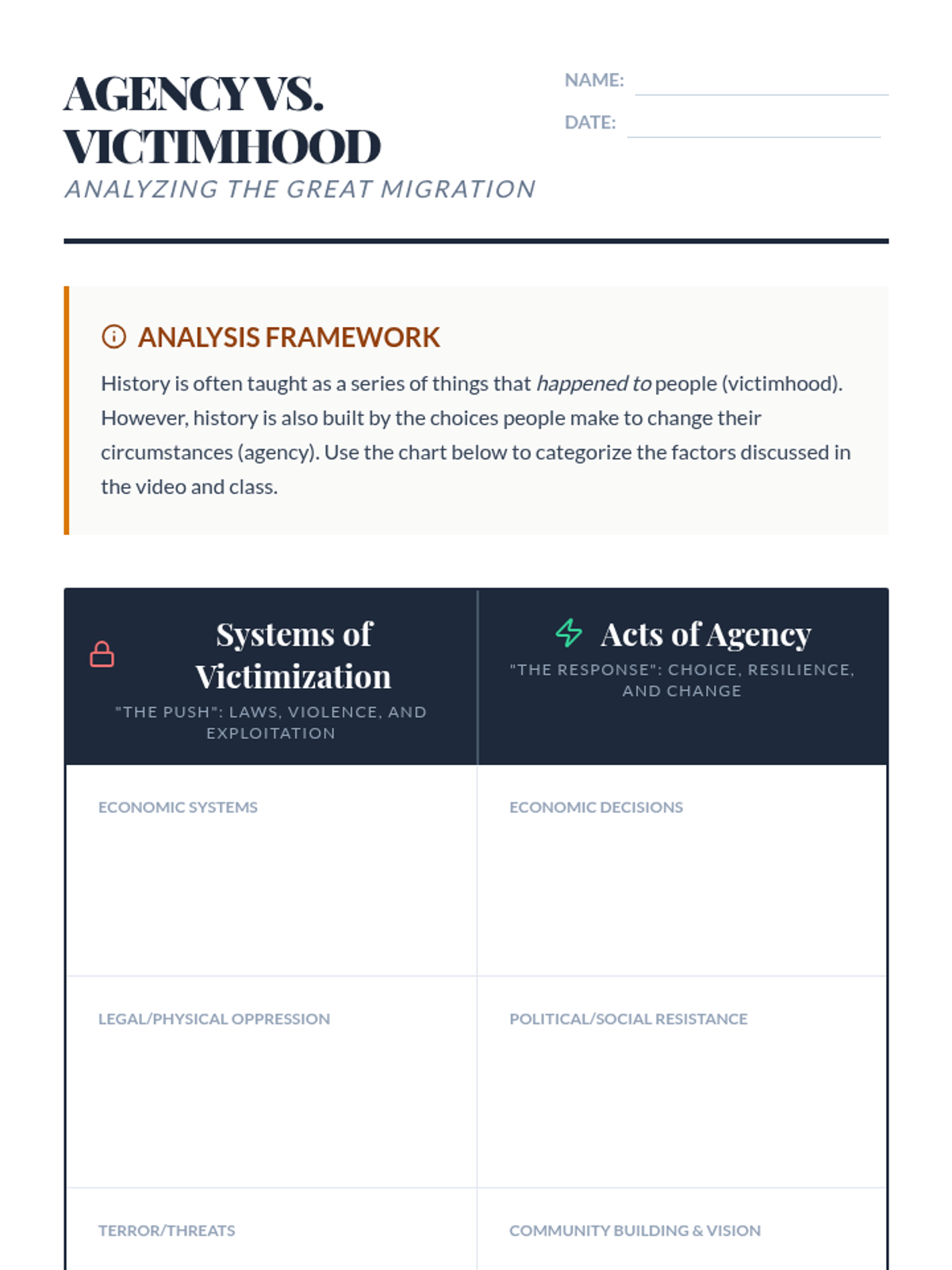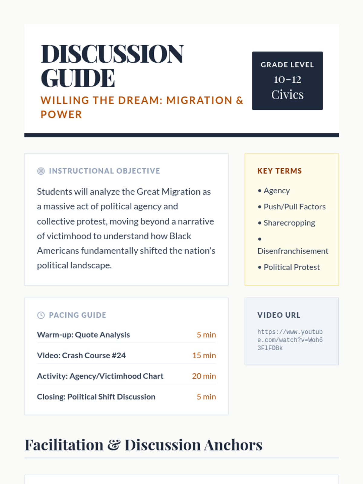 A high school Civics and Social Justice lesson that reframes the Great Migration as a massive act of political agency and resistance. Students analyze how millions of Black Americans 'voted with their feet' to escape domestic terrorism and economic exploitation, fundamentally shifting American political power.