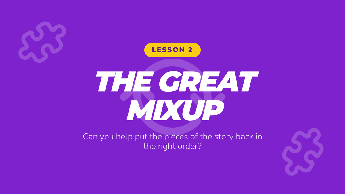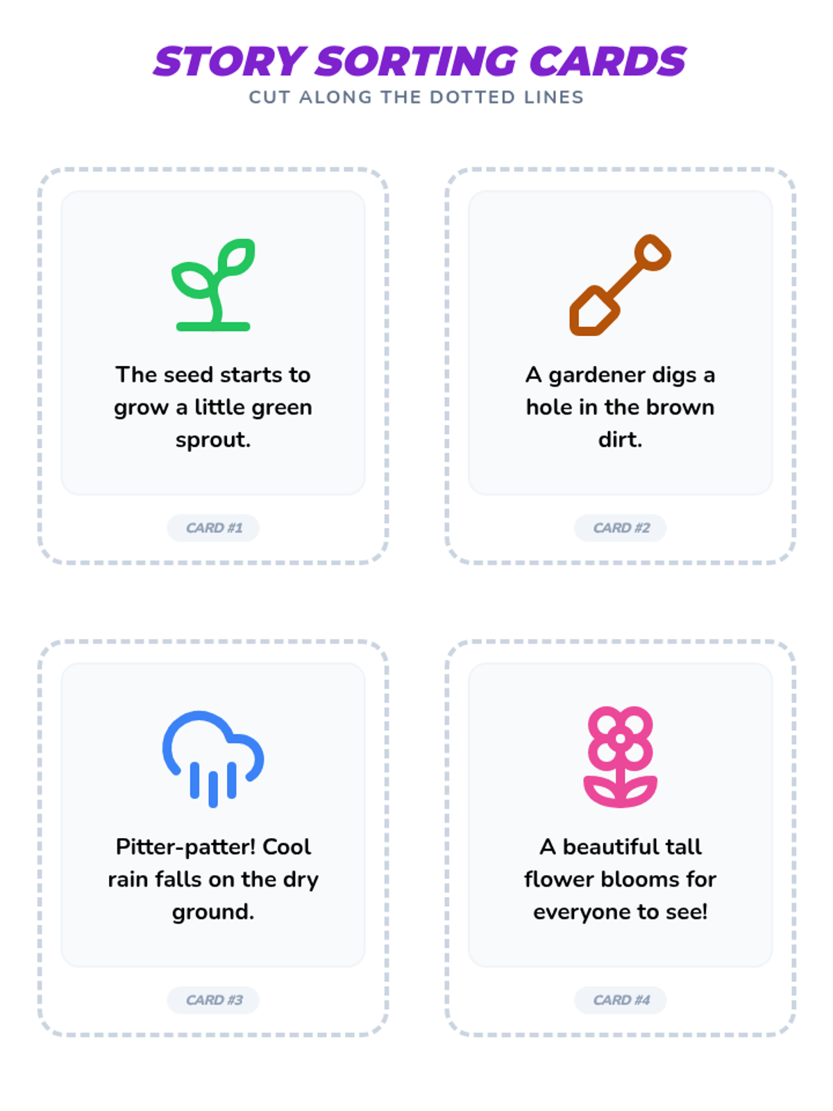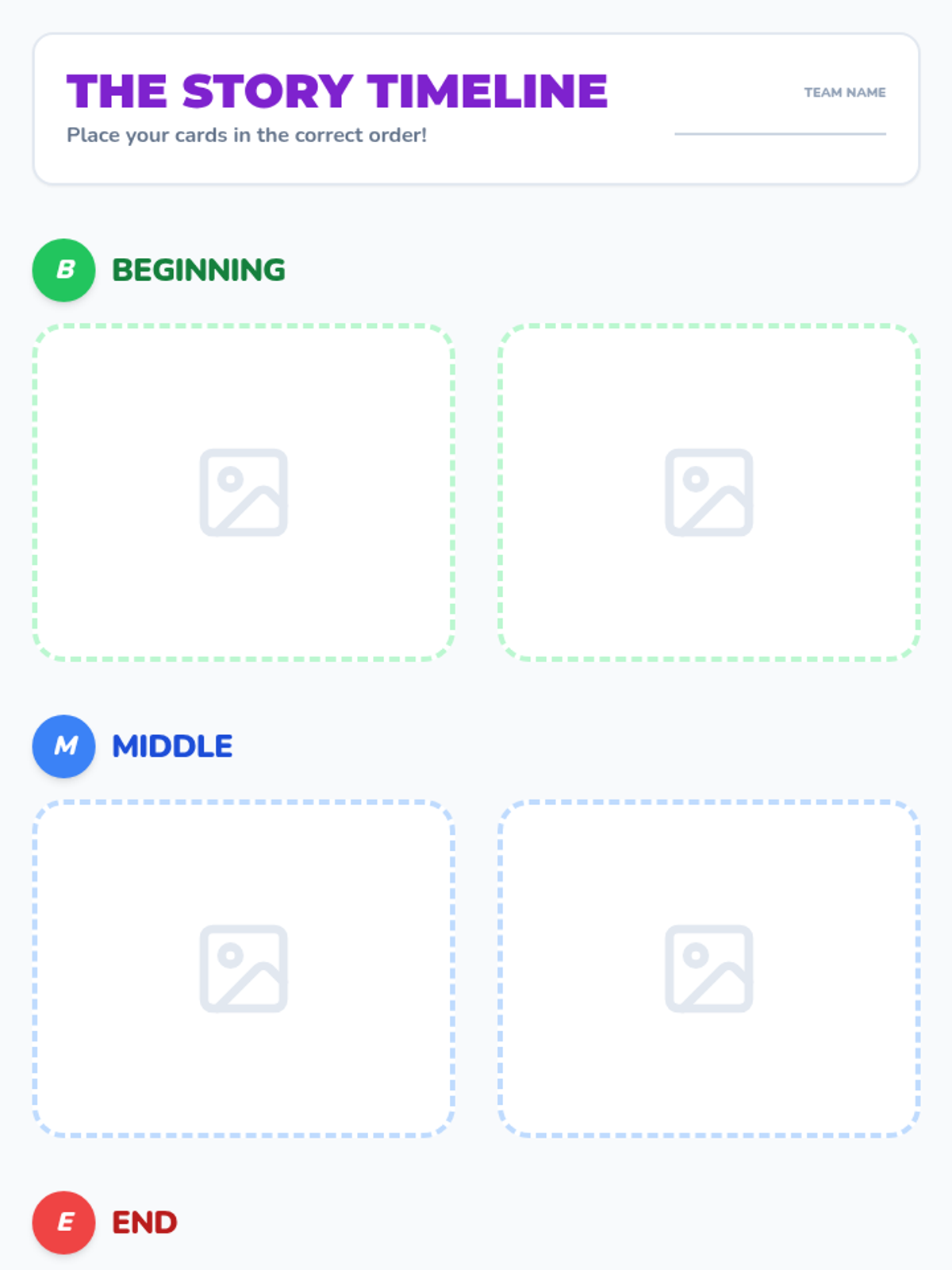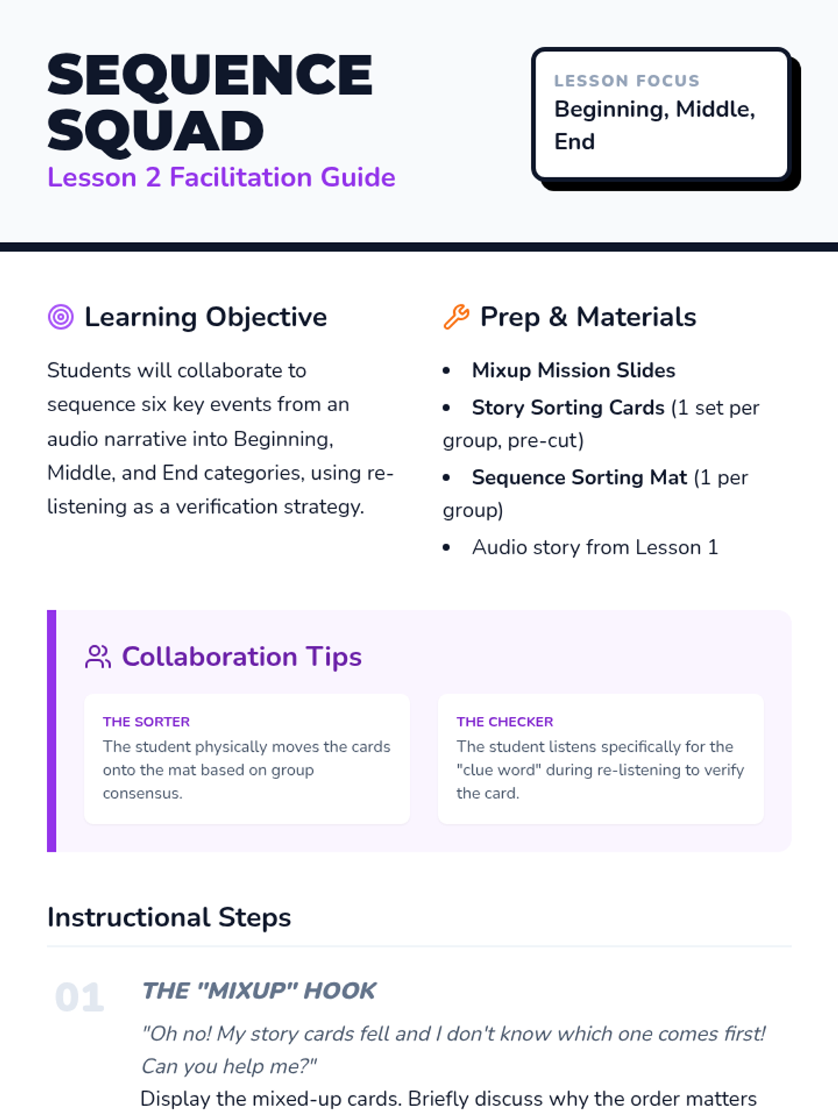 Students practice sequencing story events from a narrative audio by sorting picture cards into a beginning, middle, and end timeline.