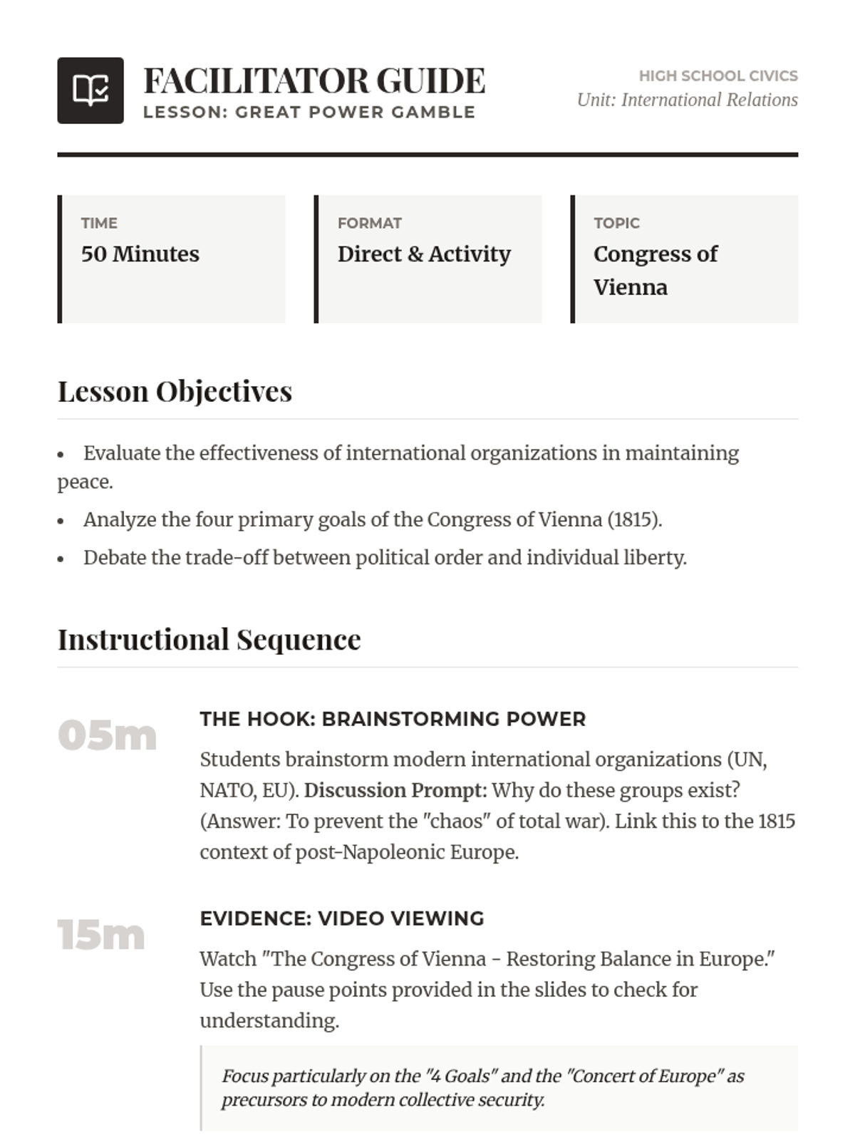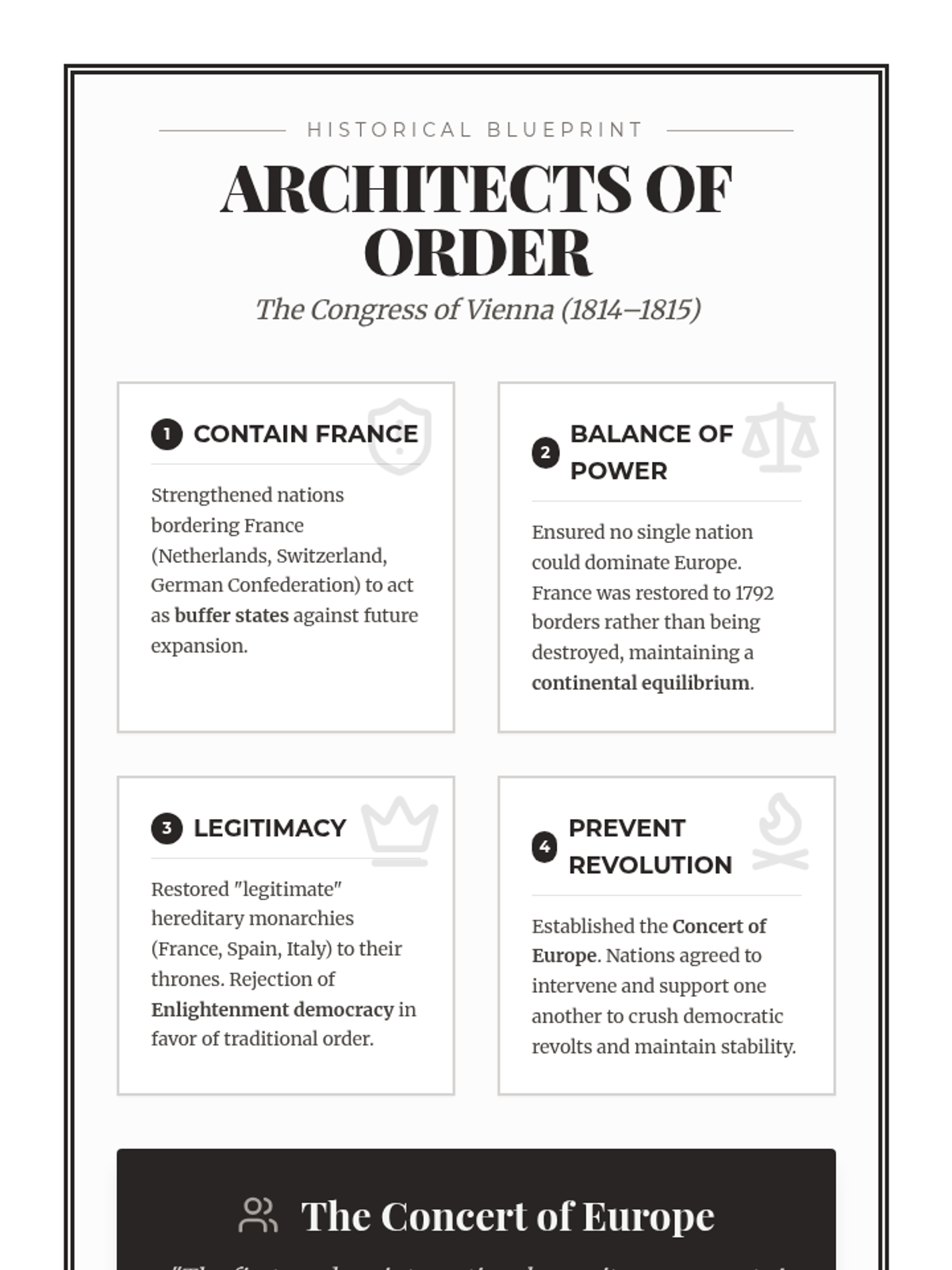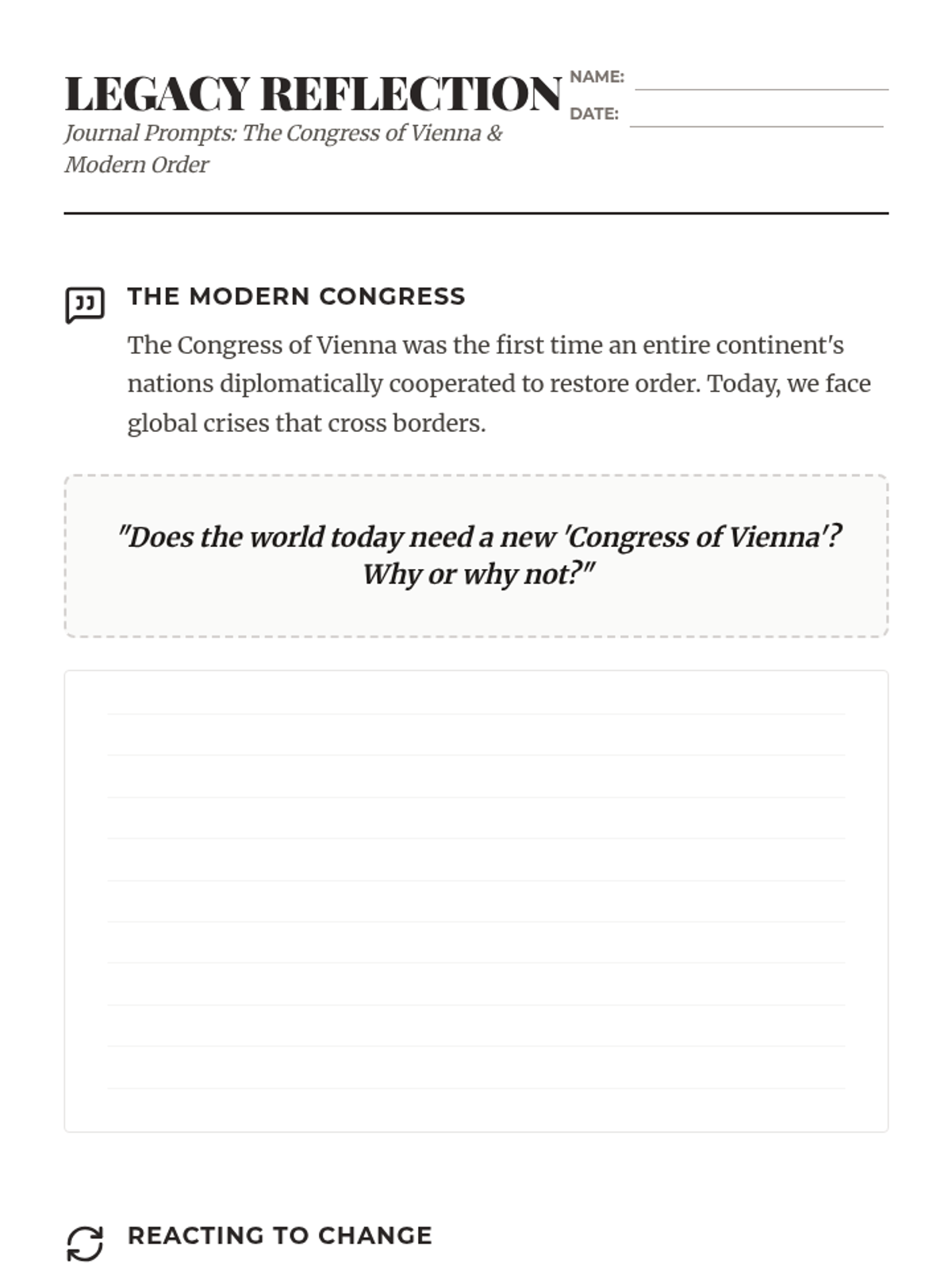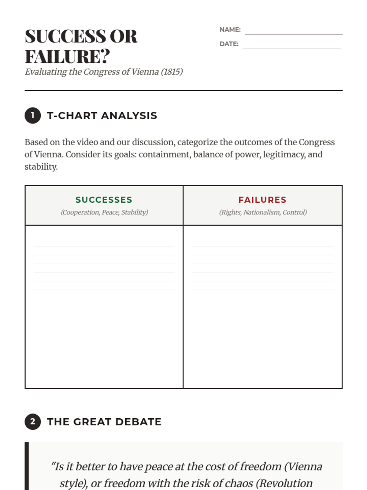 Students will evaluate the Congress of Vienna's impact on European stability, weighing the success of a 40-year peace against the suppression of democratic rights and rising nationalism. The lesson connects historical diplomatic efforts to modern international organizations like the UN and NATO.