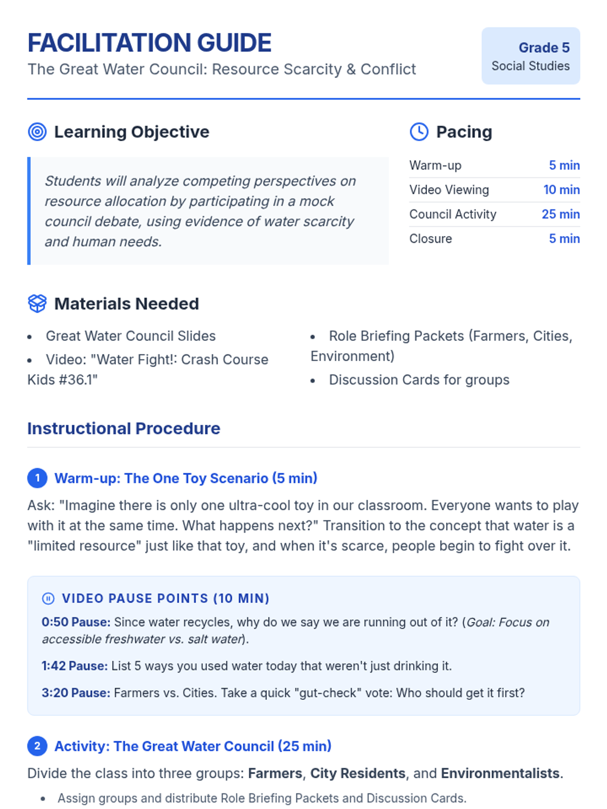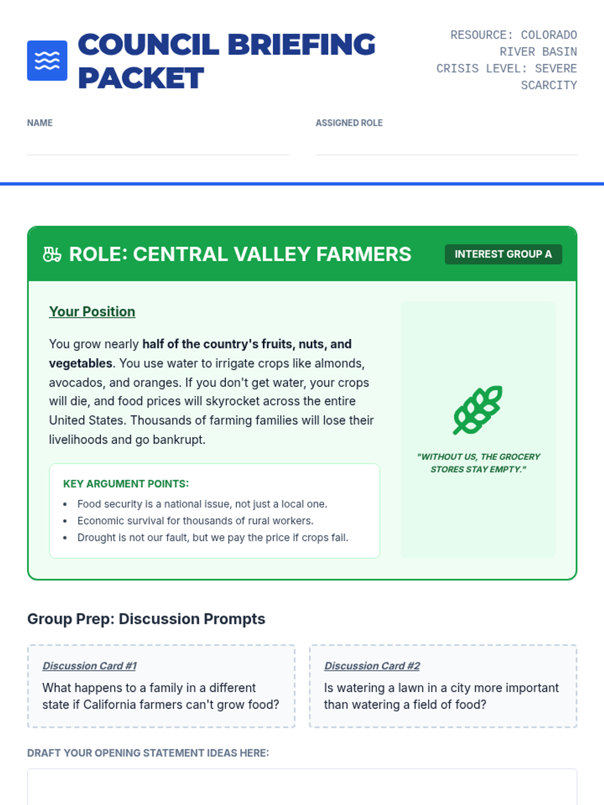 A 5th-grade social studies lesson where students role-play competing interest groups to debate water rights during a drought. Students explore the concept of resource scarcity through a Crash Course Kids video and a mock 'Great Water Council' debate.