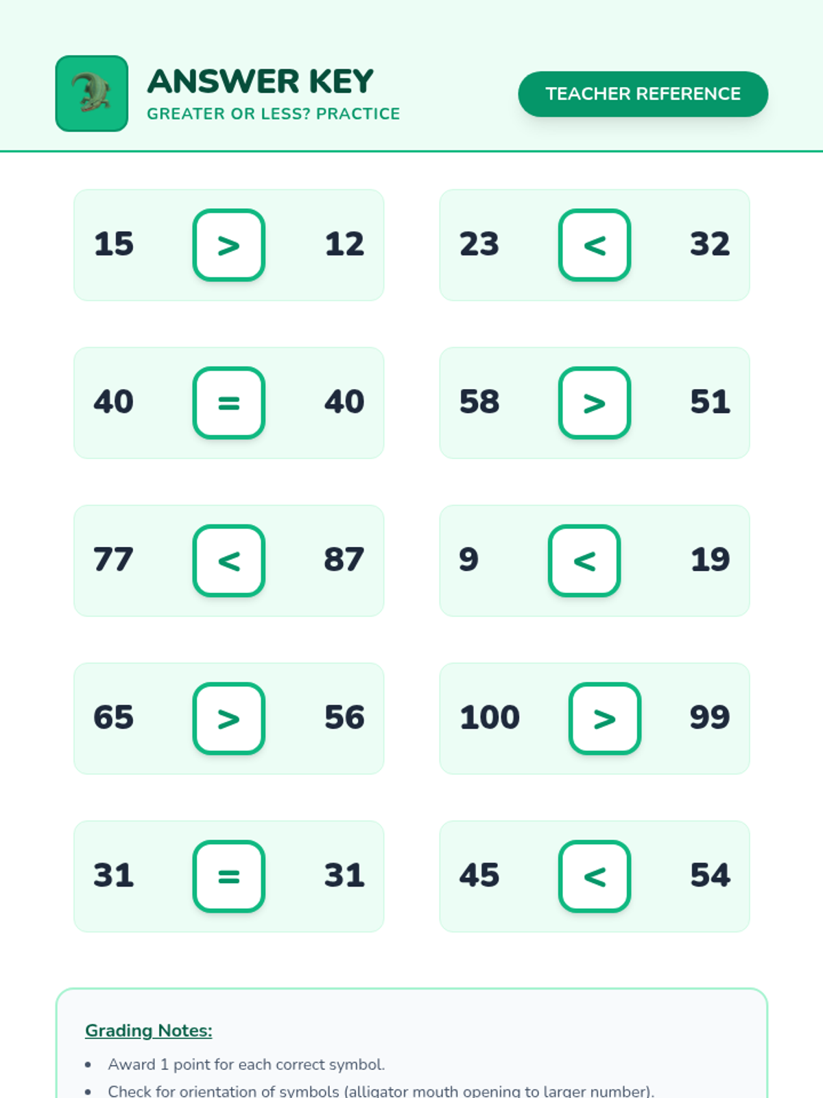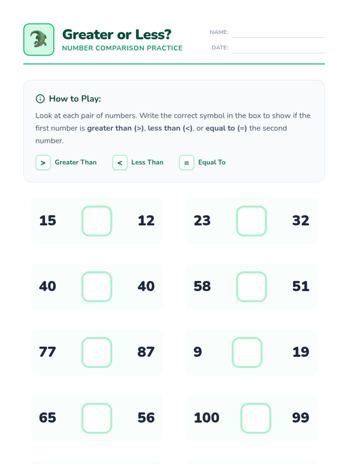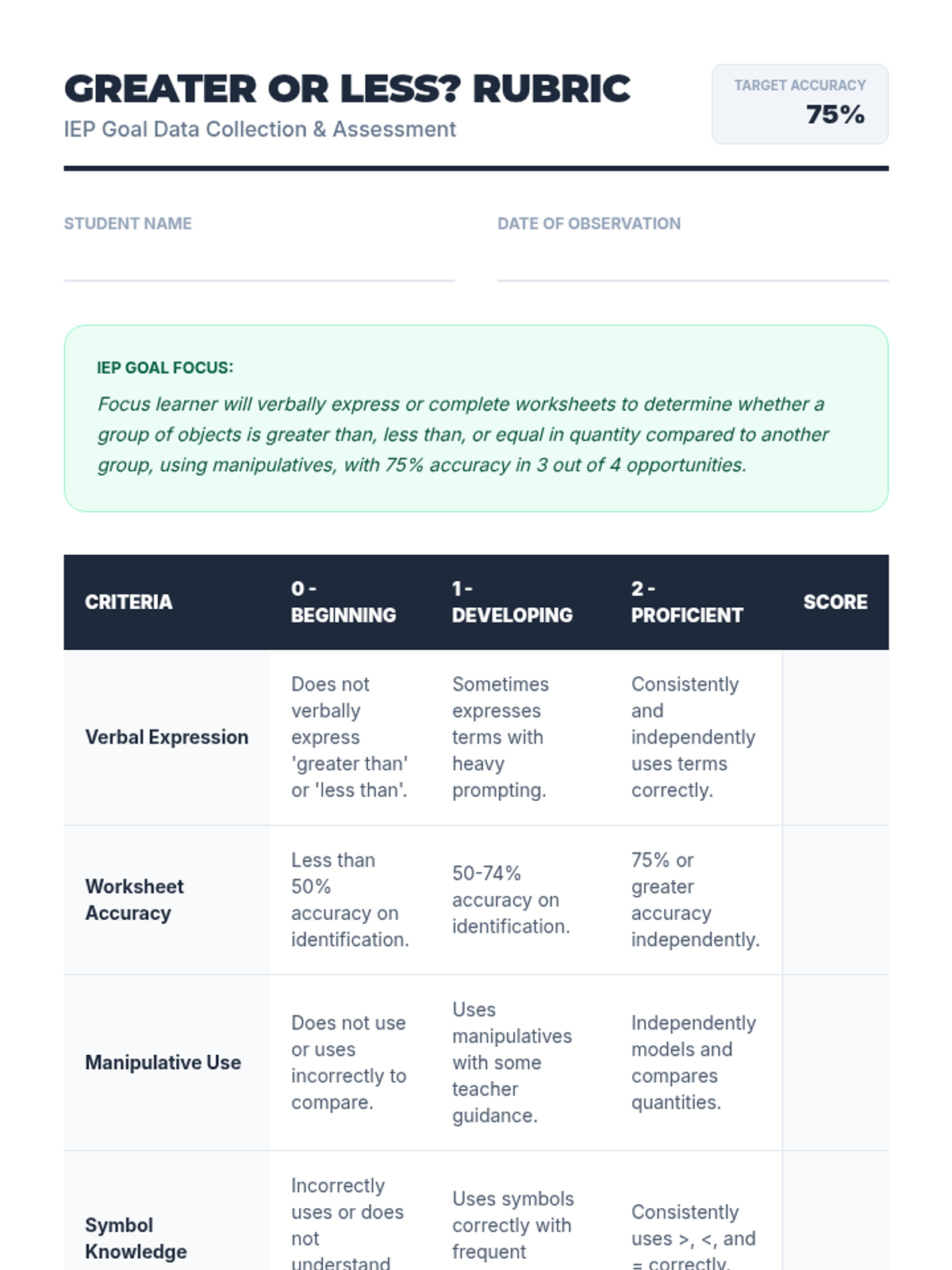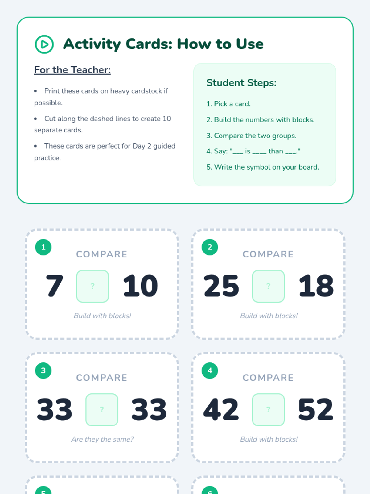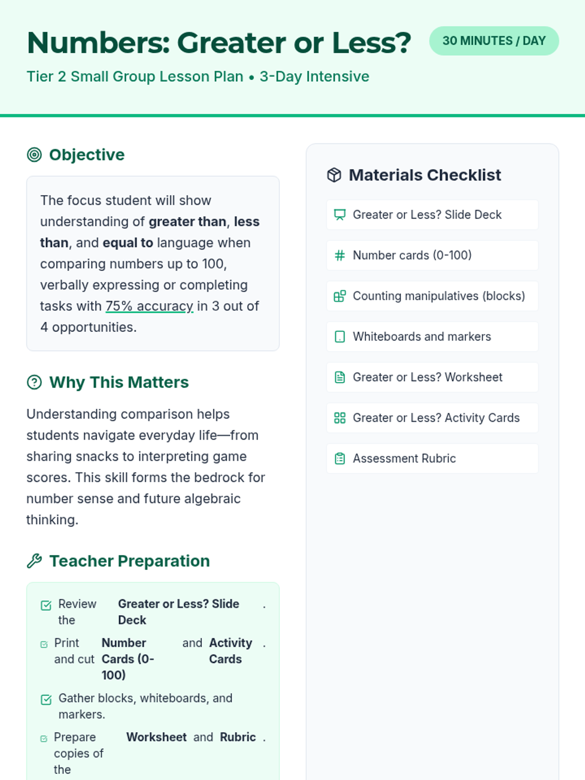 A 3-day Tier 2 small group lesson for special education students focusing on comparing numbers up to 100 using 'greater than', 'less than', and 'equal to' language and symbols.