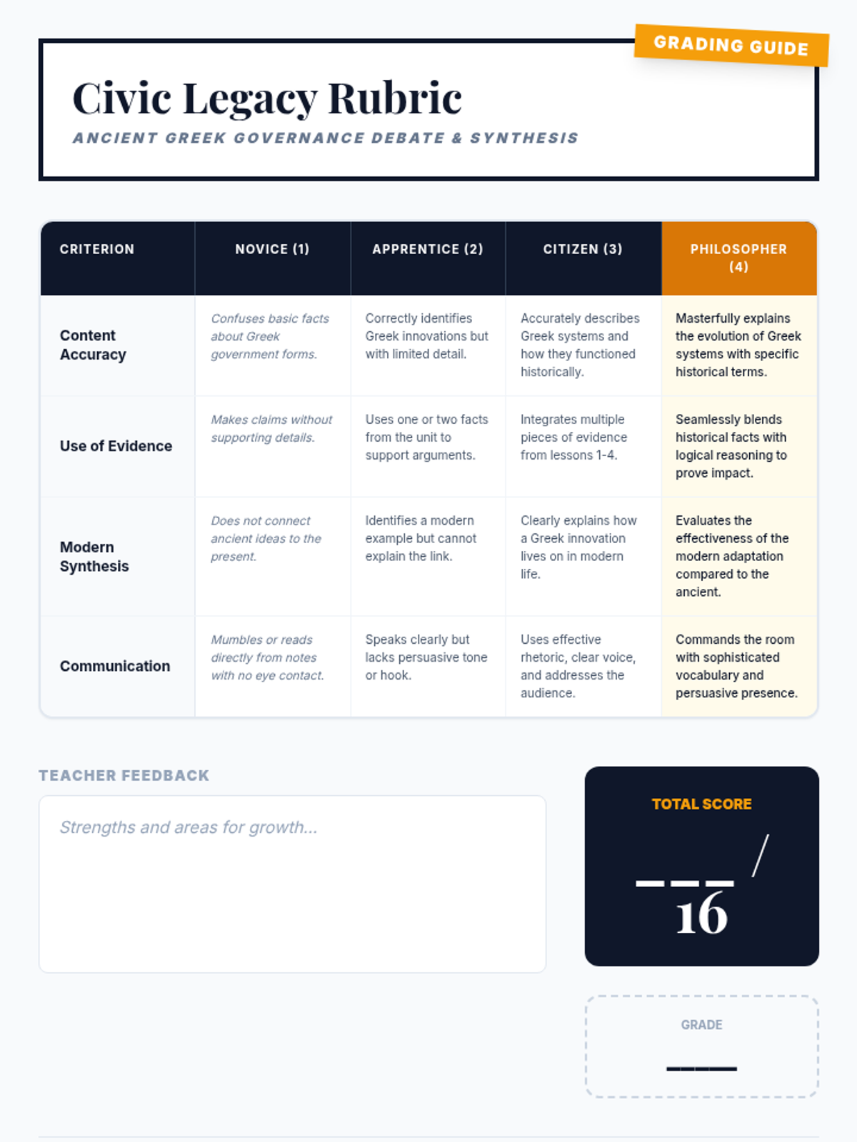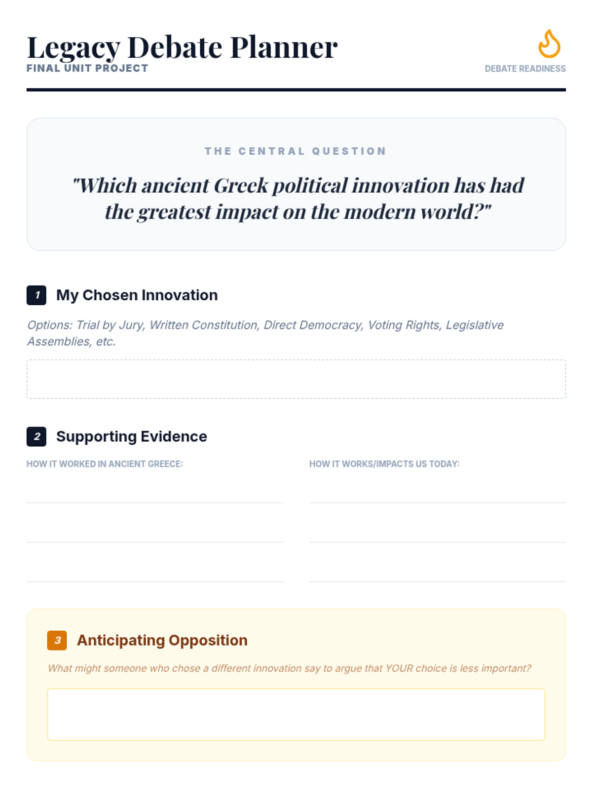 Students evaluate the long-term impact of Greek political innovations on modern democracy. The lesson culminates in a debate about which Greek contribution—from trial by jury to legislative assemblies—is most significant today.