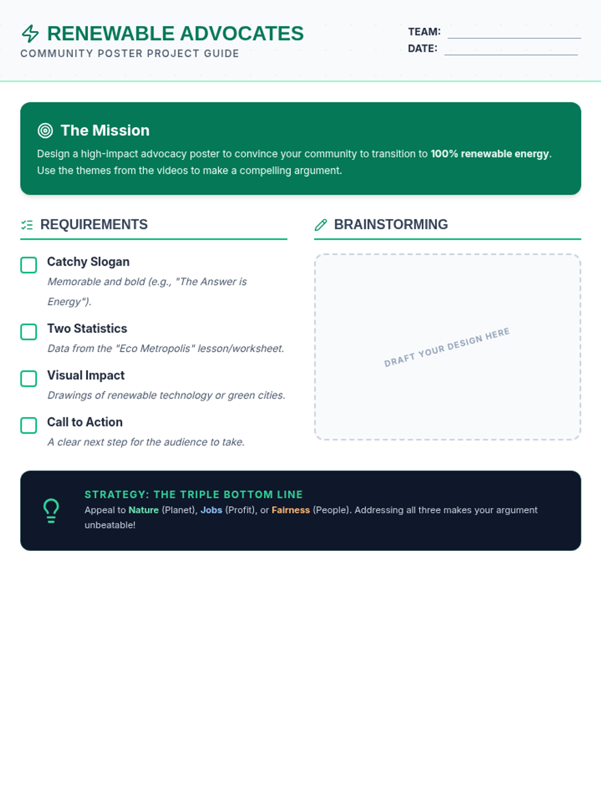 A culminating interactive lesson where students analyze informational texts about renewable energy using Z-chart graphic organizers to synthesize their learning.
