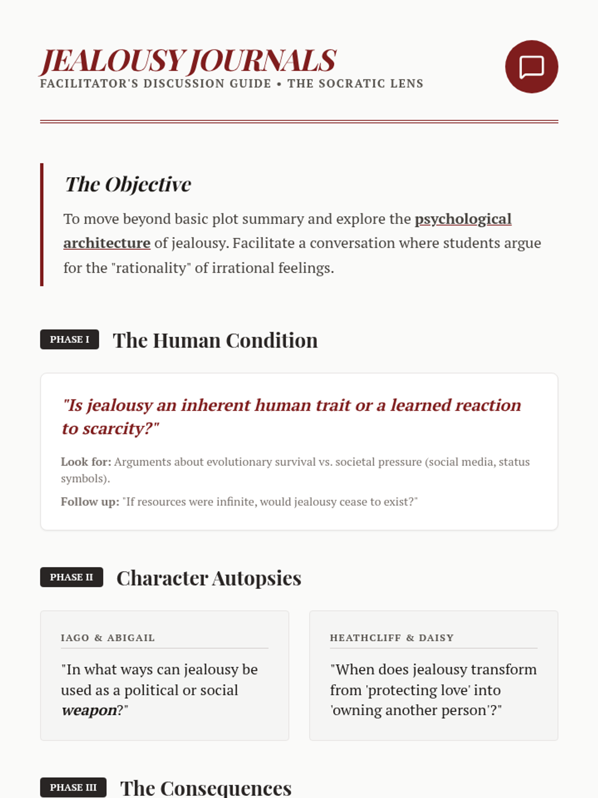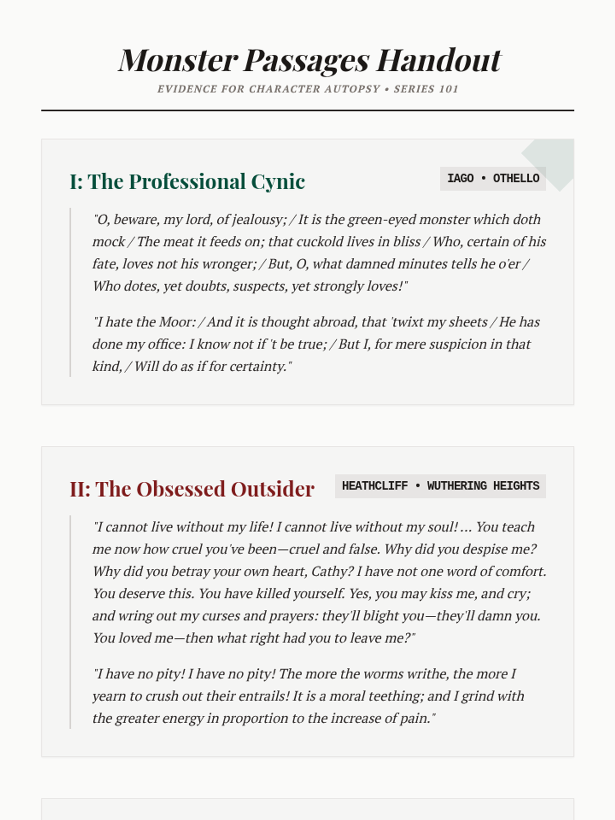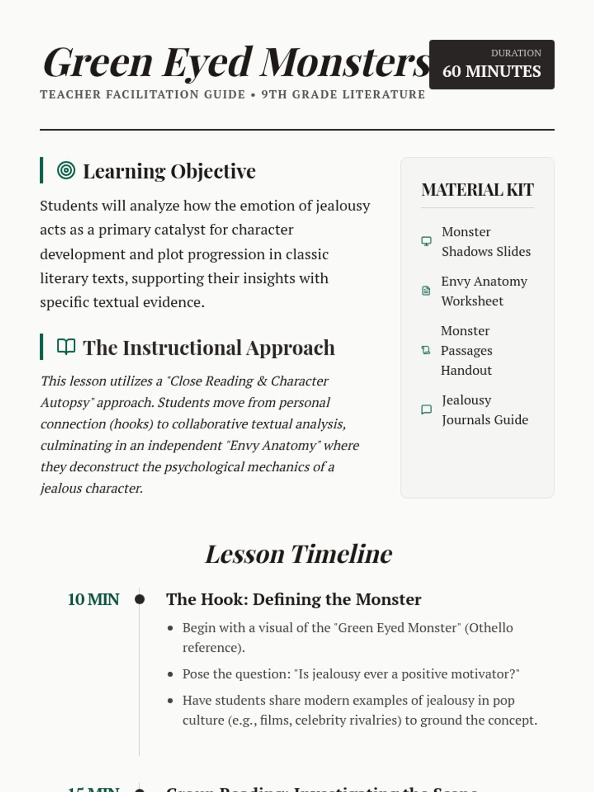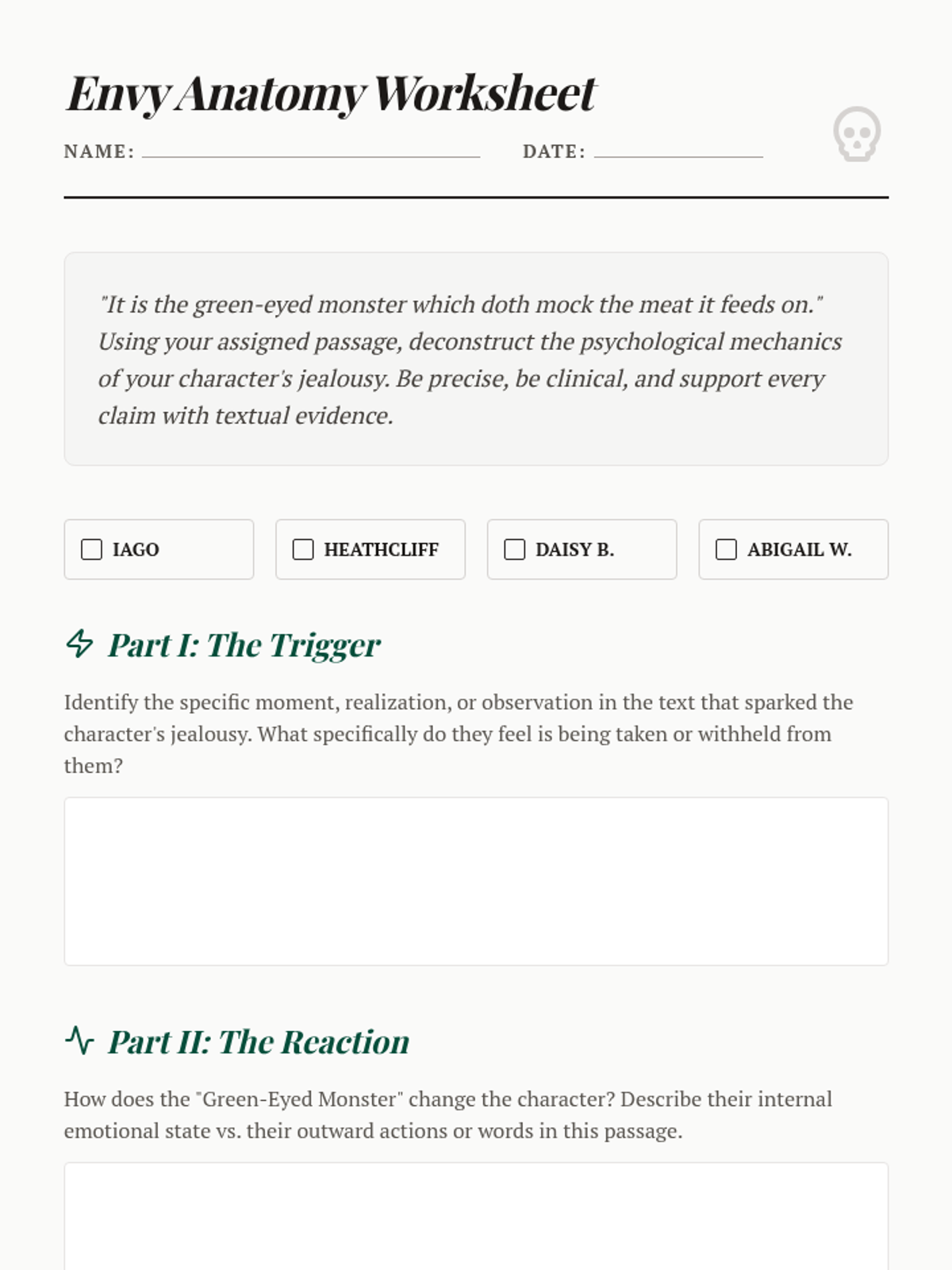 Students explore the destructive power of jealousy in classic literature, analyzing how this "green-eyed monster" drives character development and plot in works by Shakespeare, Brontë, and Fitzgerald.