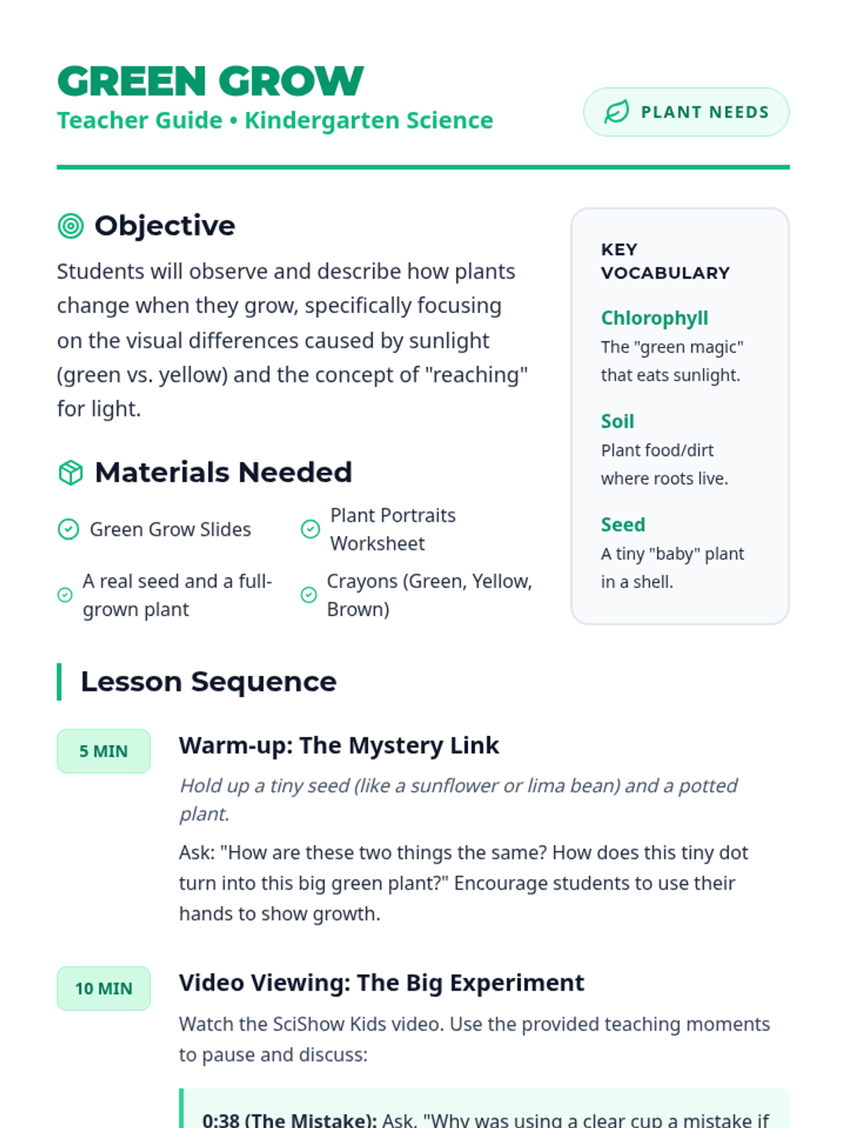 A Kindergarten lesson exploring how plants change as they grow, focusing on the essential needs of sunlight, water, and soil through a scientific experiment video and movement-based learning.