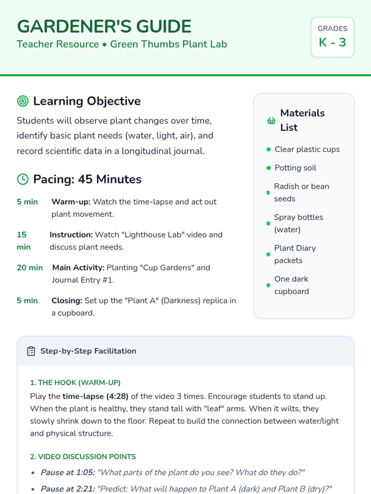 A hands-on primary science lesson where students explore plant anatomy, photosynthesis, and growth by starting their own cup gardens and keeping an observation journal. Based on the 'Lighthouse Lab' video experiment, students will also conduct a class-wide variable test to see what happens when plants are kept in the dark.