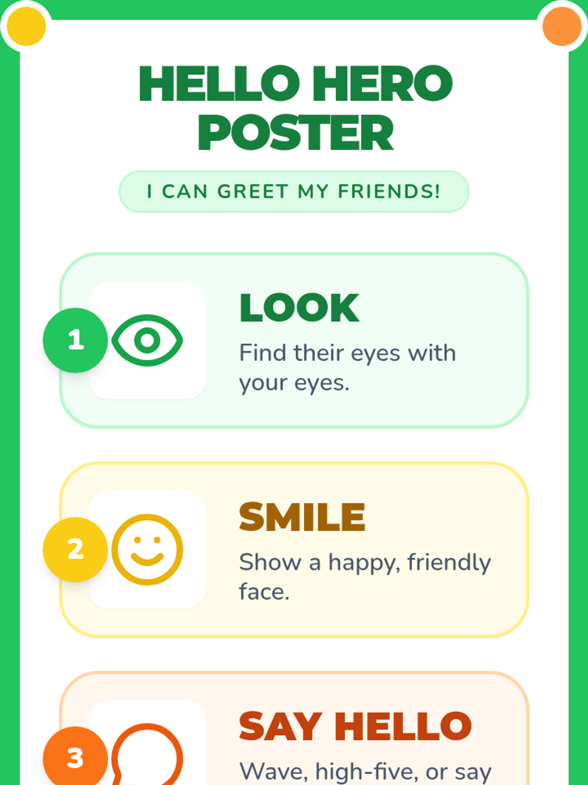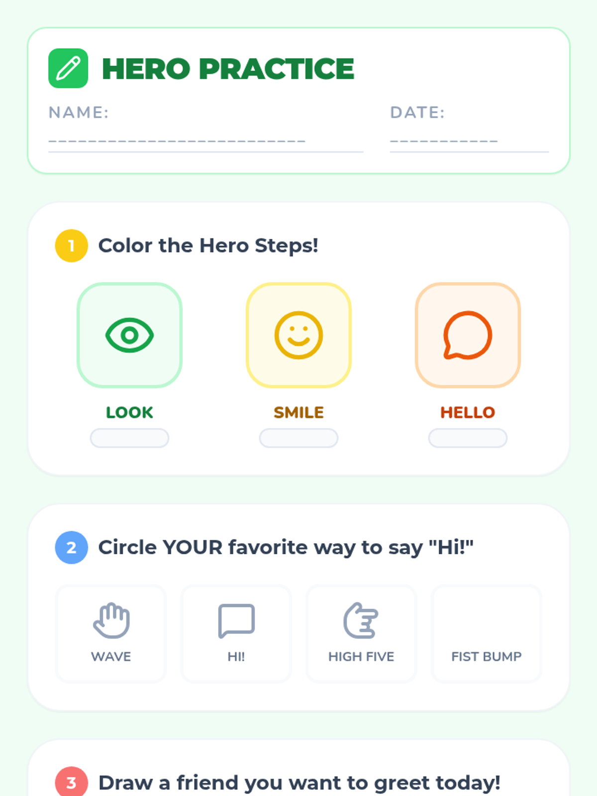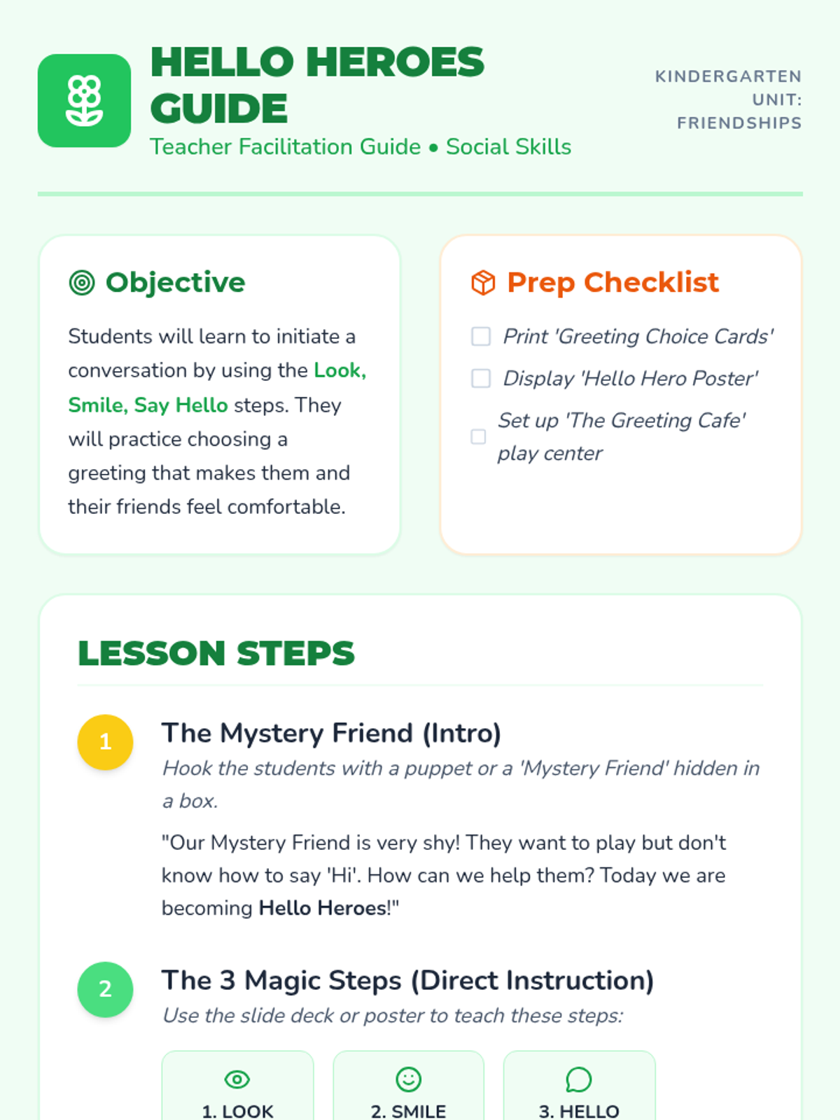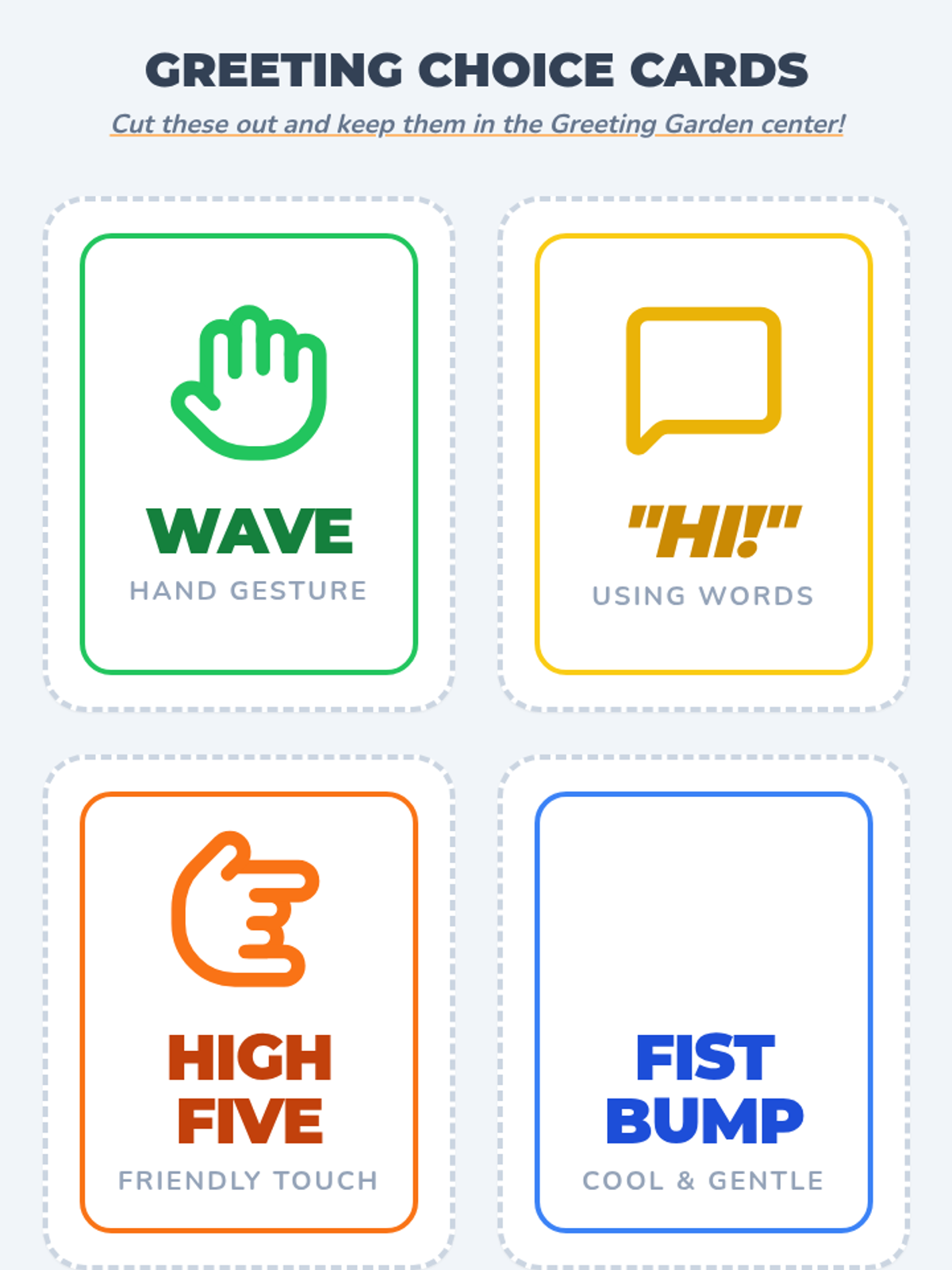 A play-based lesson for kindergartners to learn and practice initiating conversations through friendly greetings like waves, high-fives, and verbal 'hellos'.