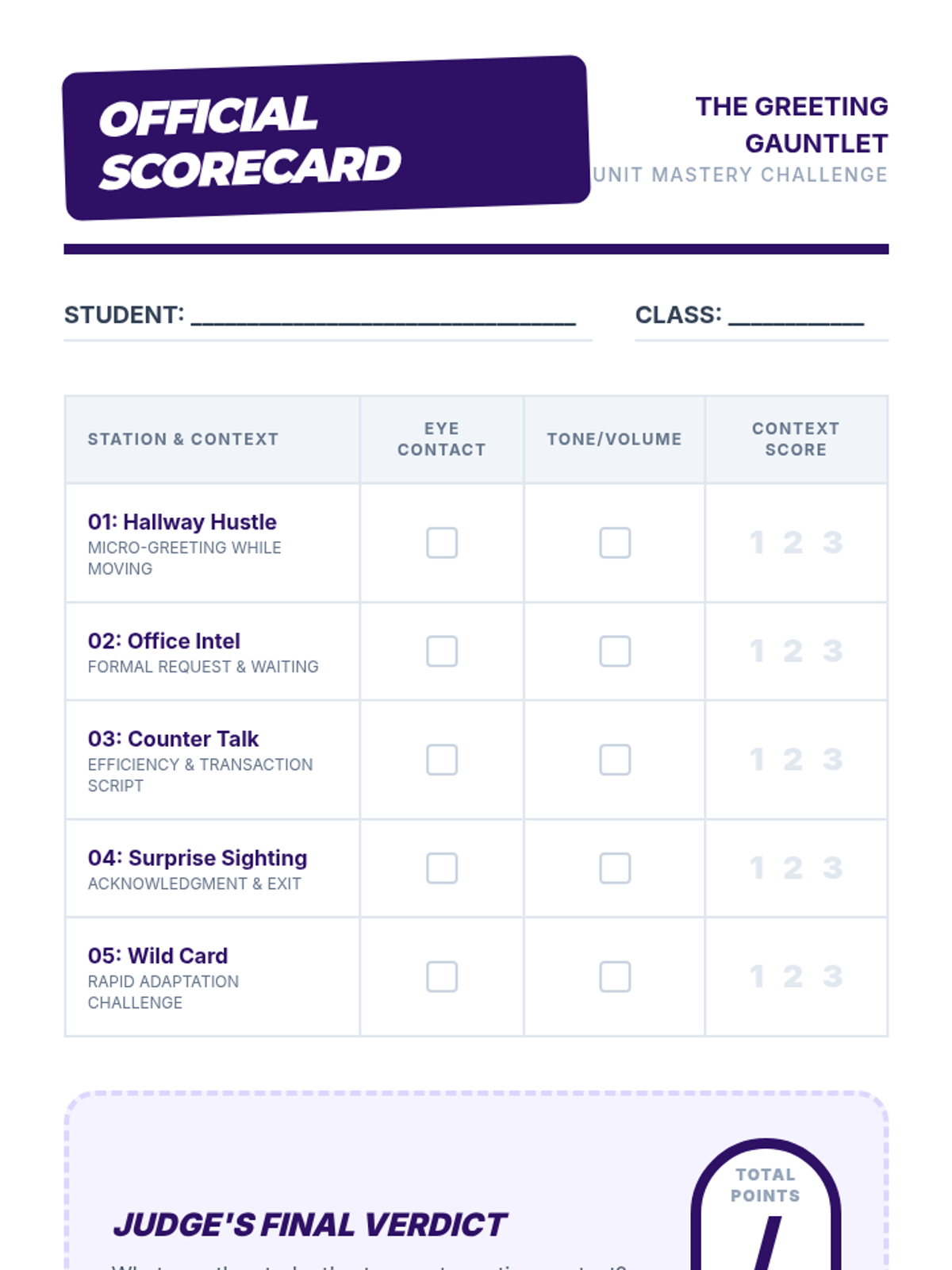A cumulative assessment where students rotate through various greeting stations to demonstrate mastery of different social contexts in real-time.