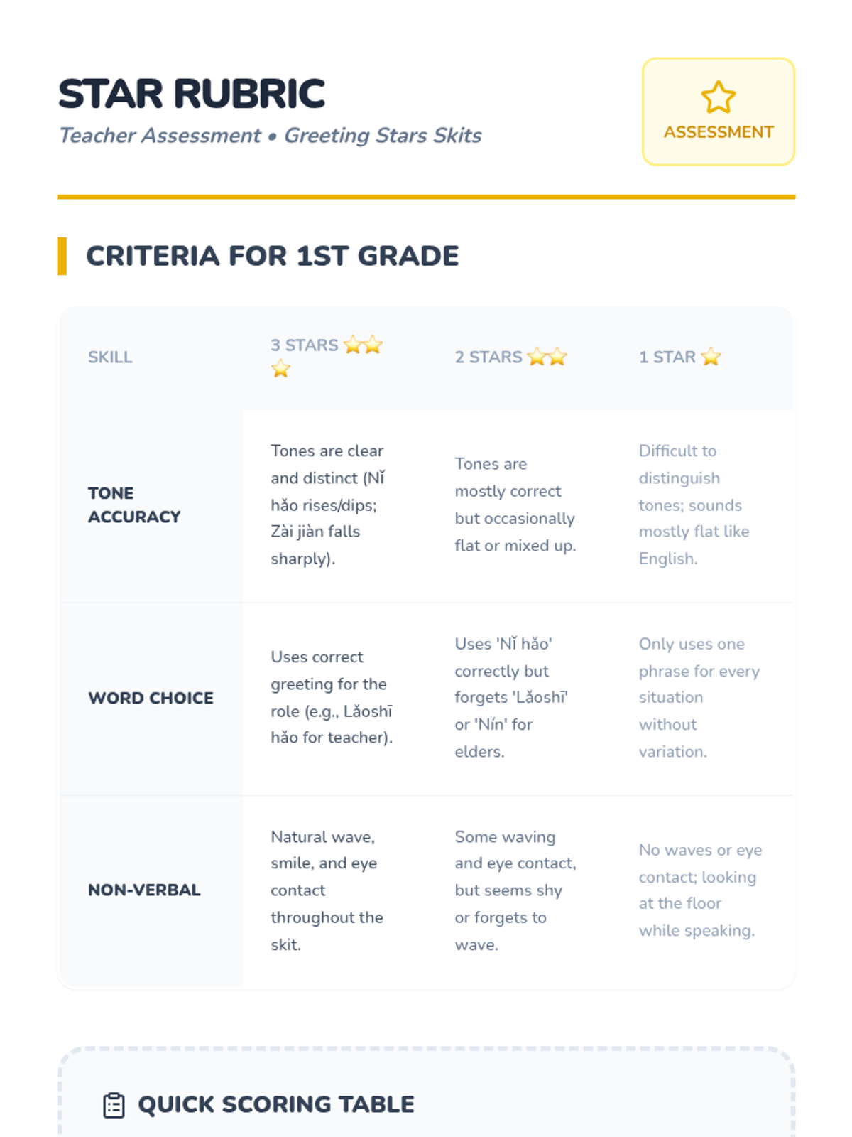 Students perform short greeting skits in pairs, demonstrating their mastery of tones and basic communication.