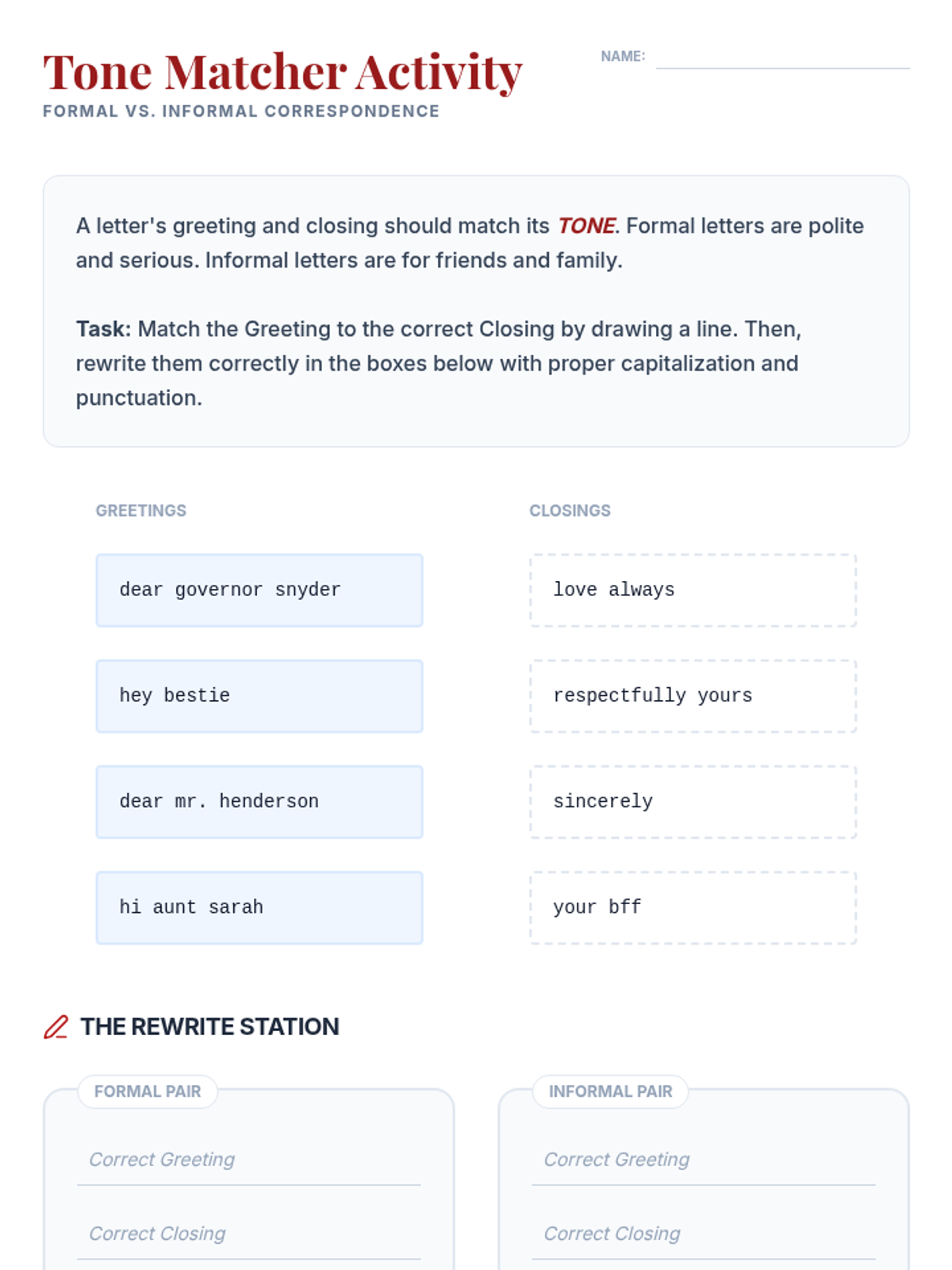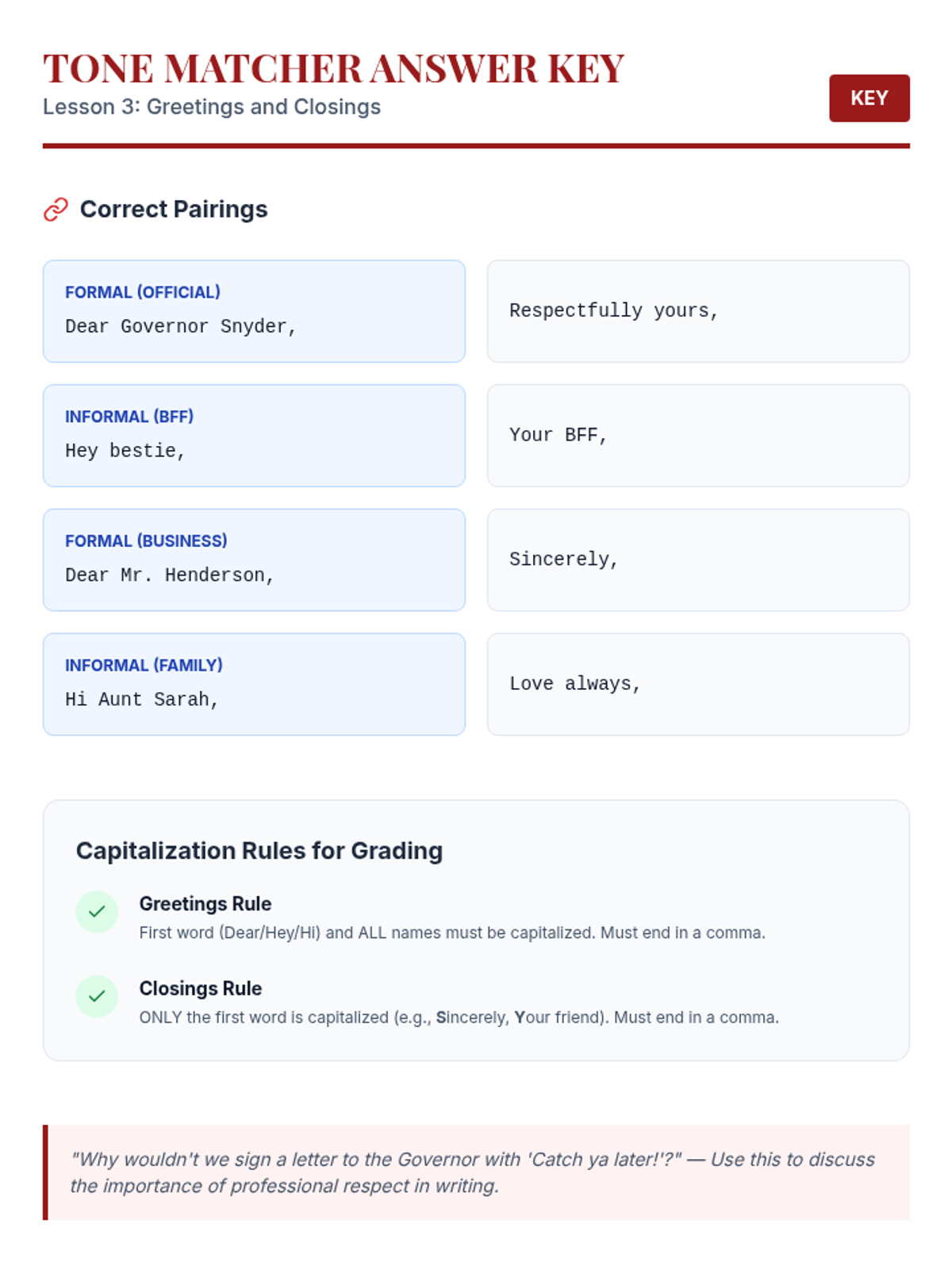 Explores capitalization and punctuation rules for greetings and closings in formal and informal letters.