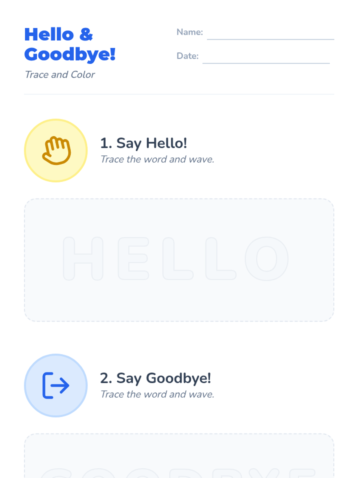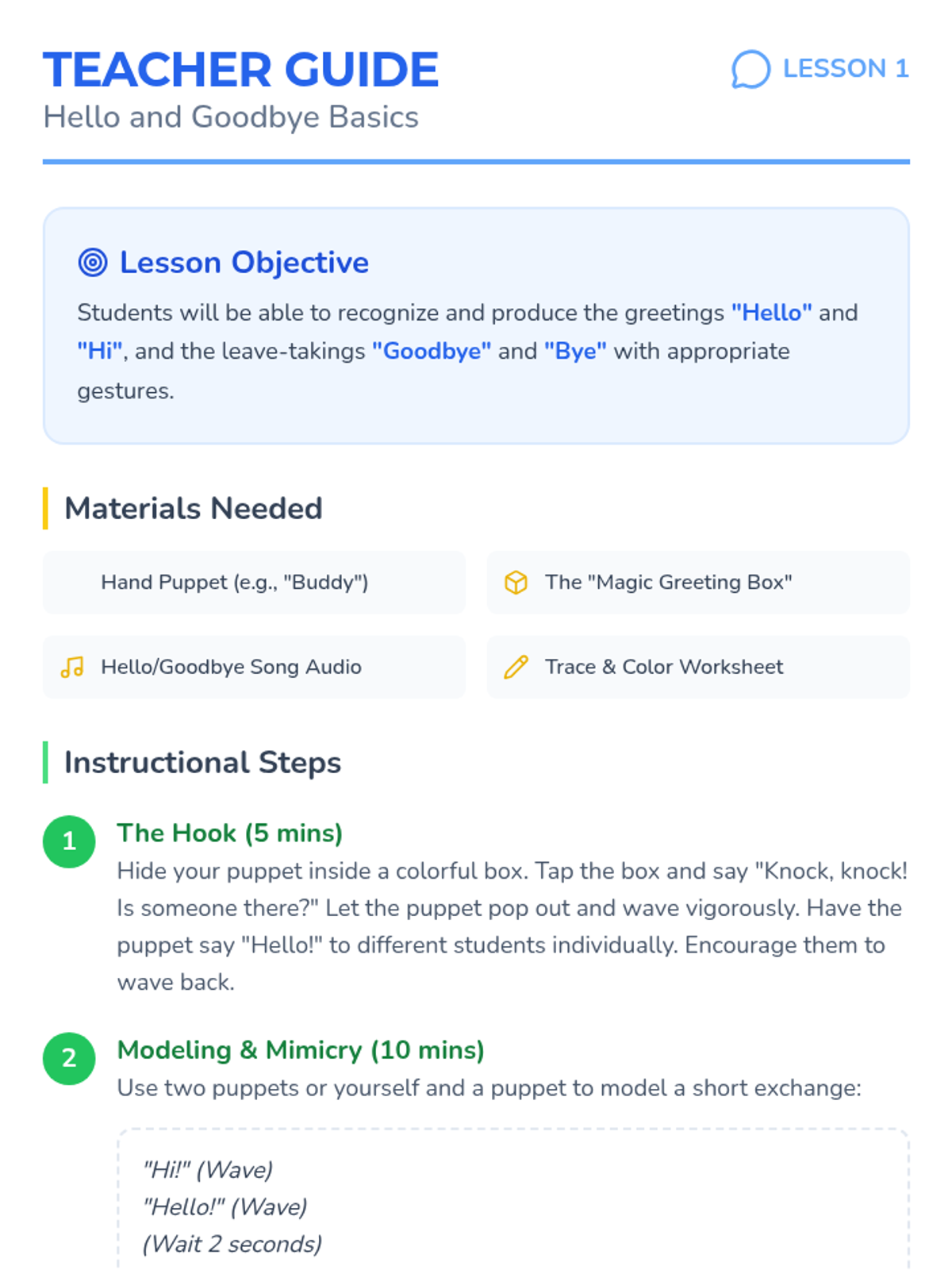 Students learn to recognize and produce basic greetings (Hello/Hi) and leave-takings (Goodbye/Bye) through songs and interactive puppet play.