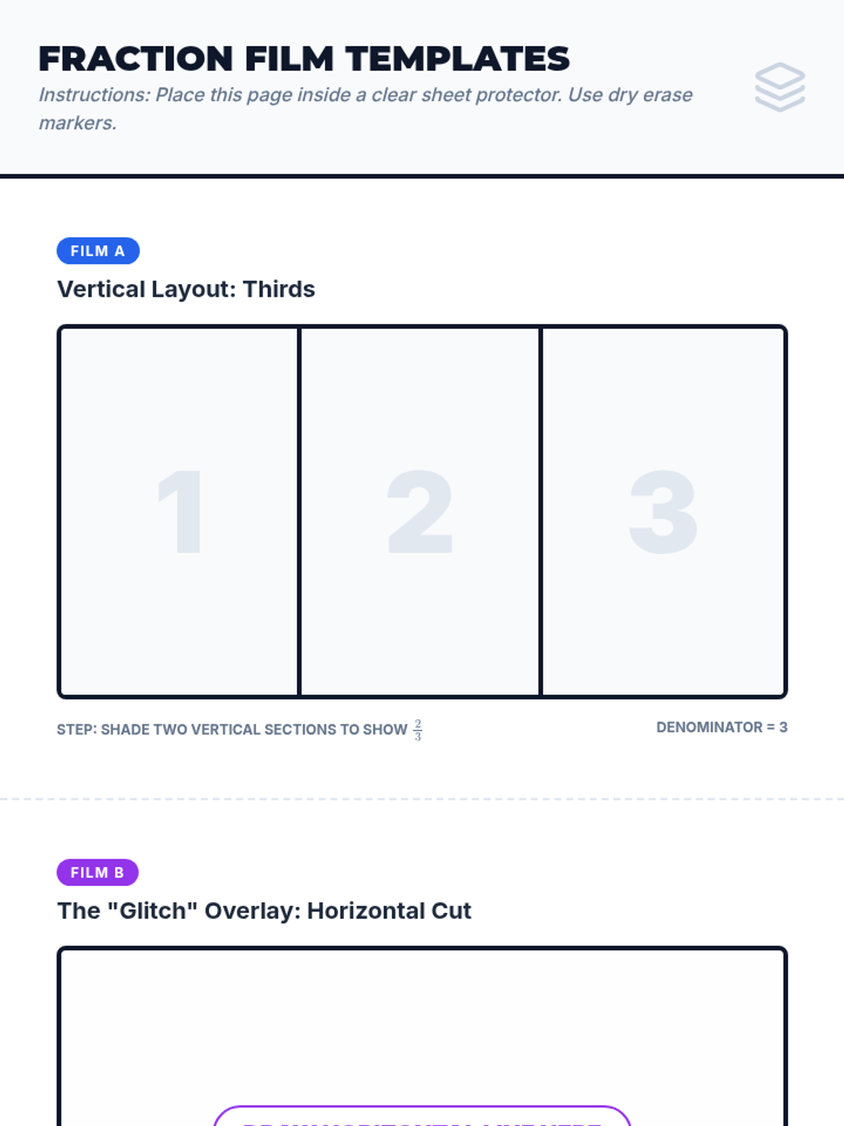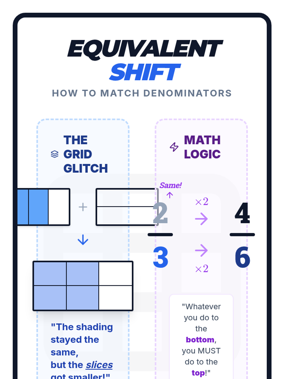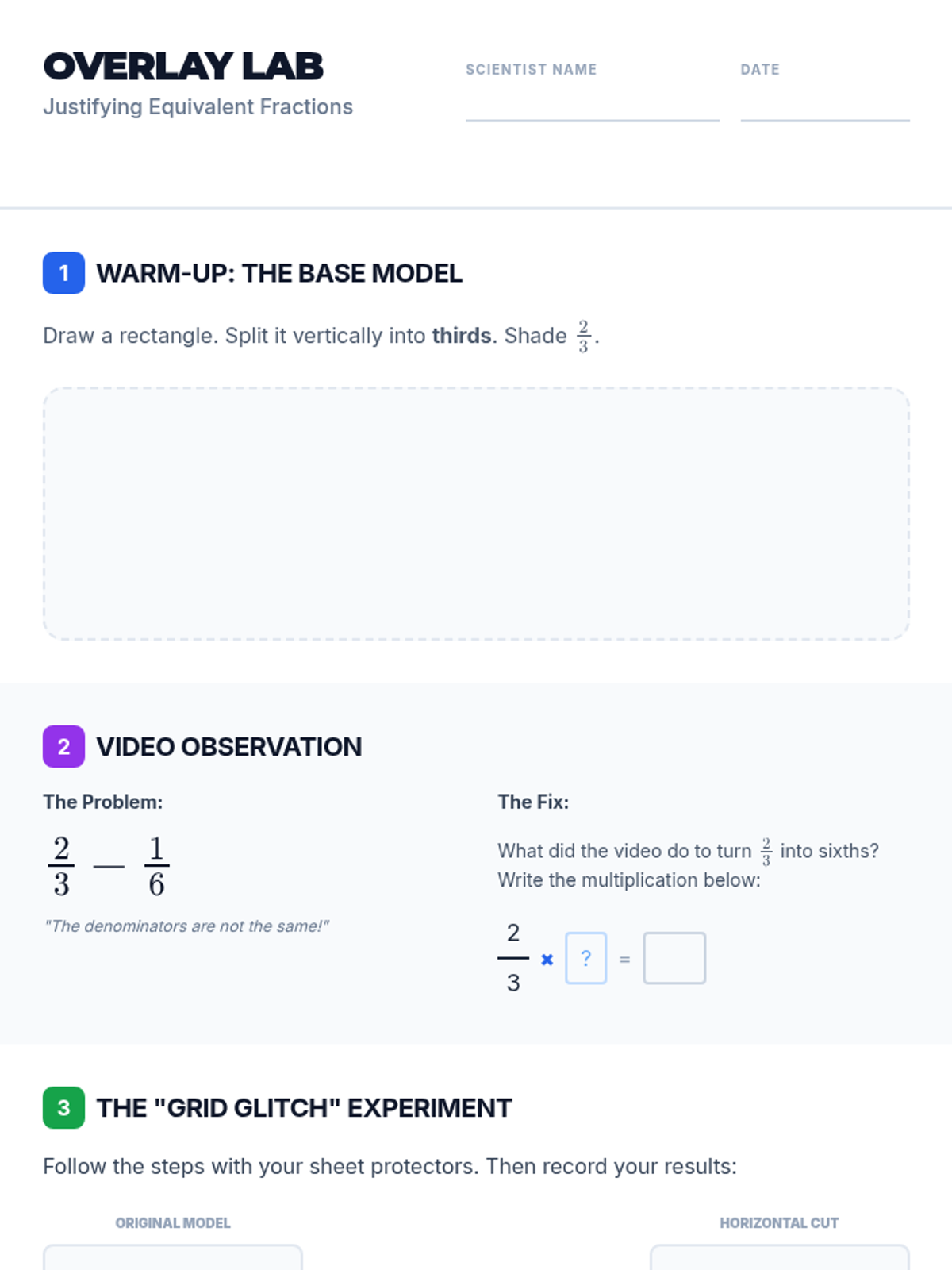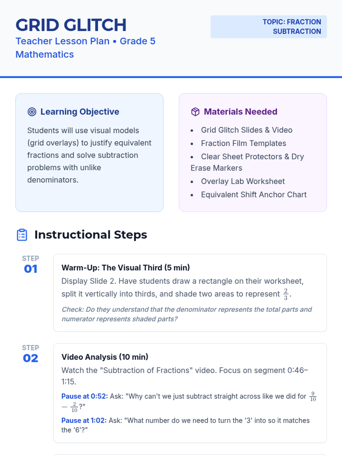 A 5th-grade math lesson focusing on using visual grid overlays to justify why multiplying the numerator and denominator creates equivalent fractions for subtraction. Includes hands-on modeling with 'fraction films' and a video-guided discussion.