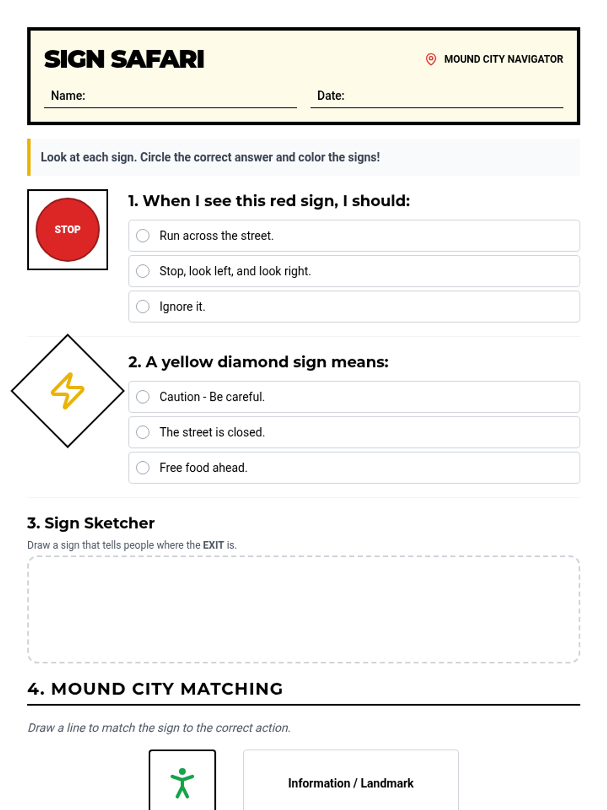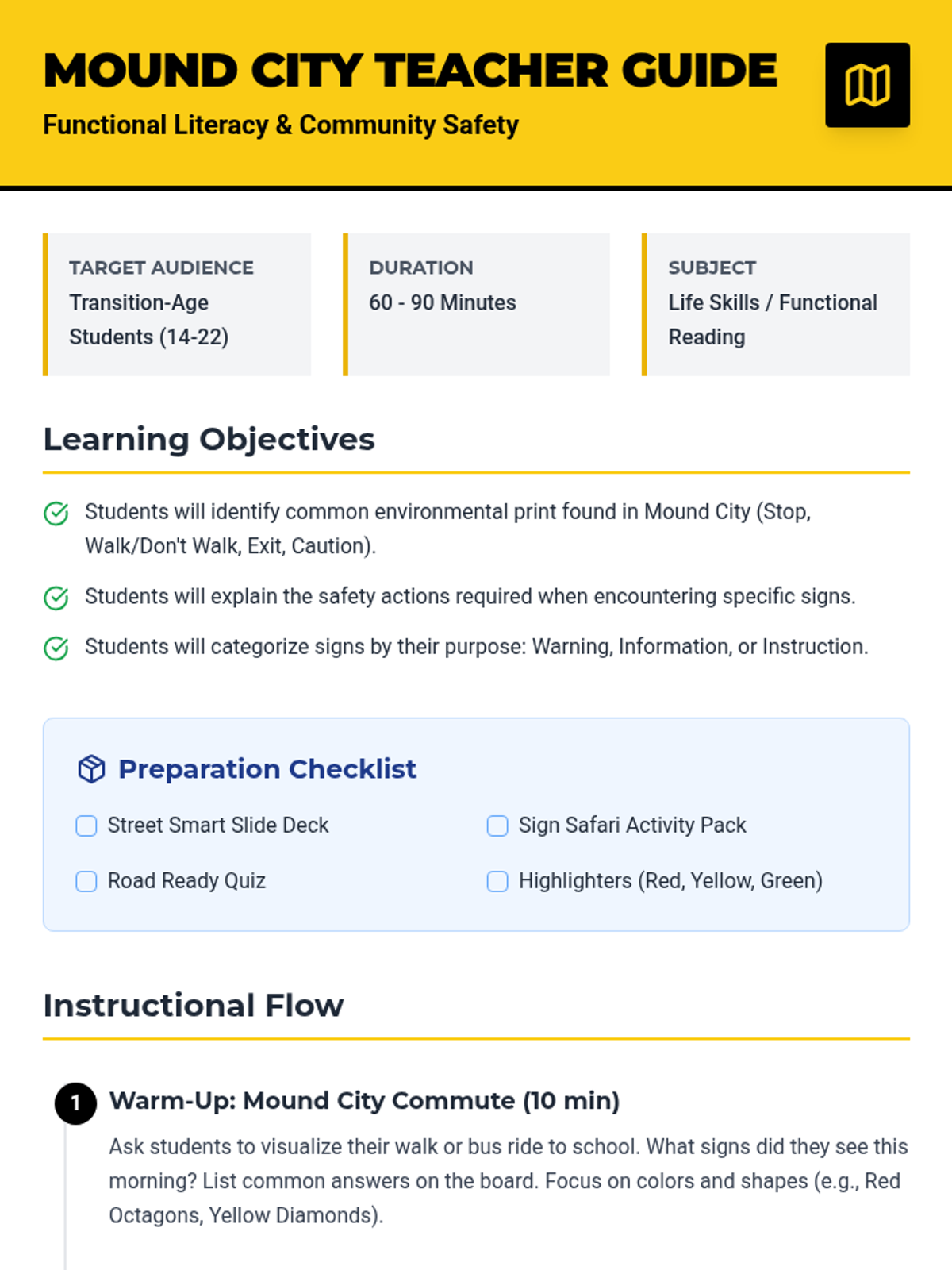 A functional literacy lesson for transition-age students focused on identifying and interpreting environmental print and safety signs in the Mound City community. Students build real-world independence through sign recognition and situational awareness.