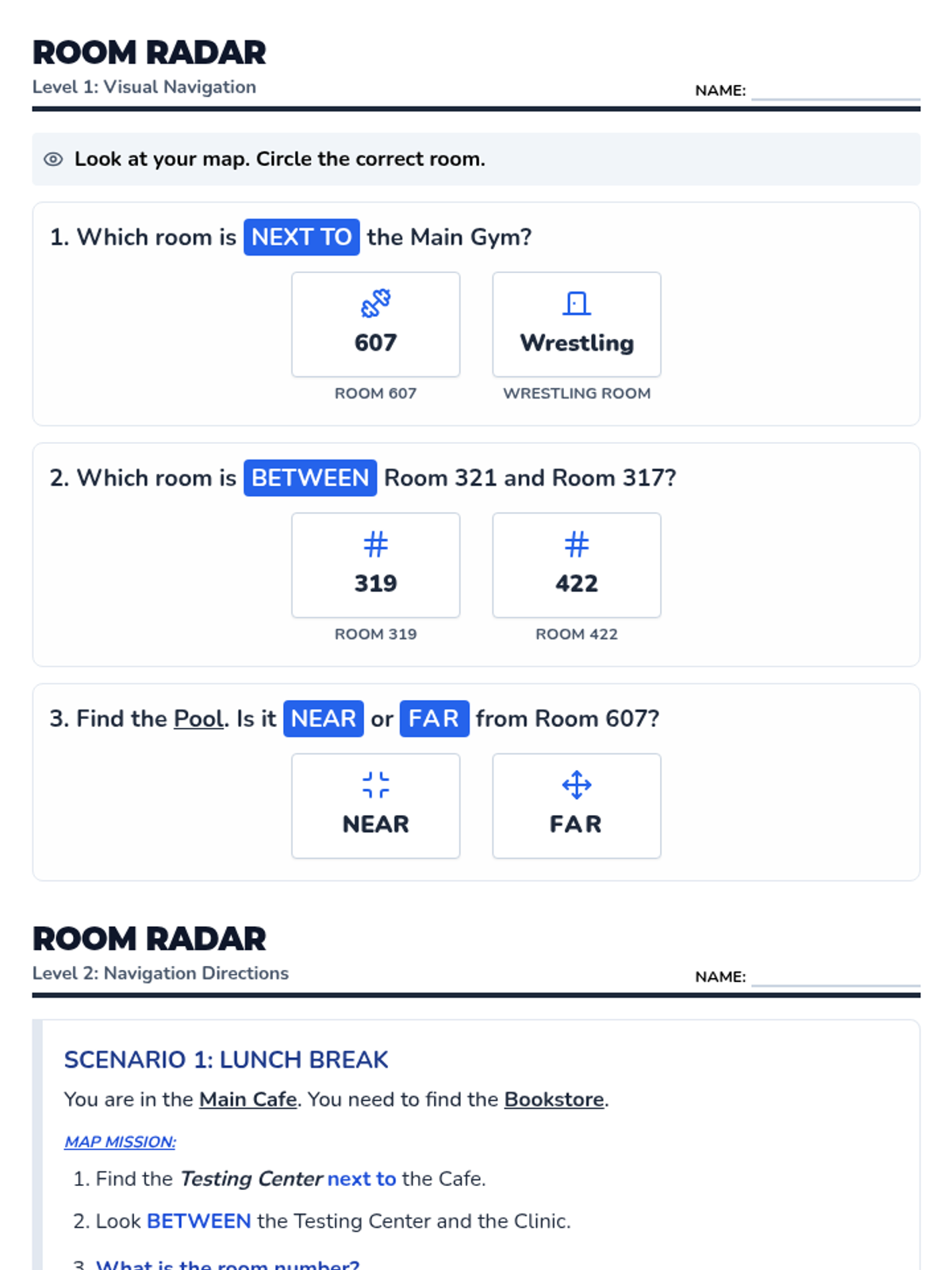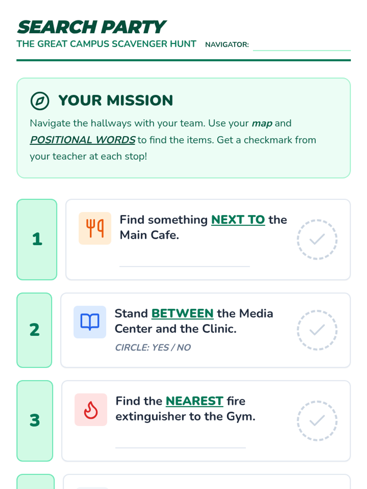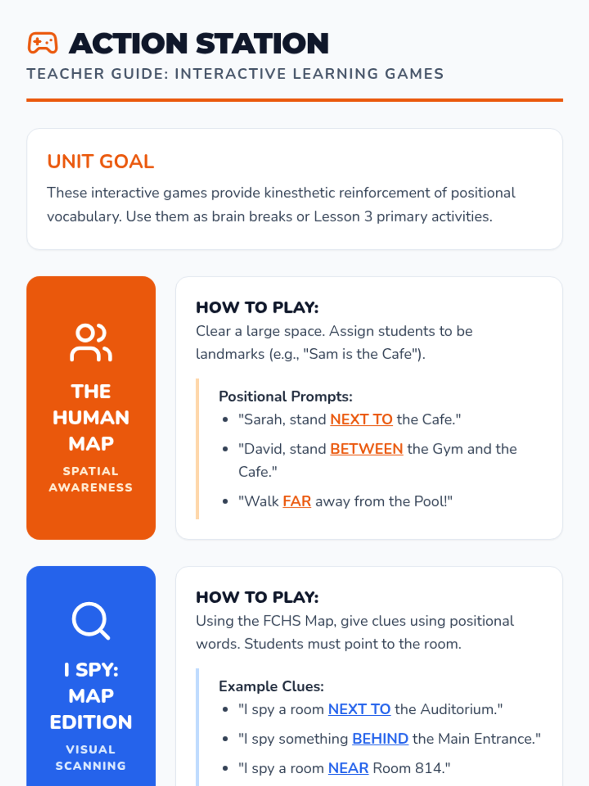Hands-on application of spatial skills through school-wide scavenger hunts and interactive physical games.