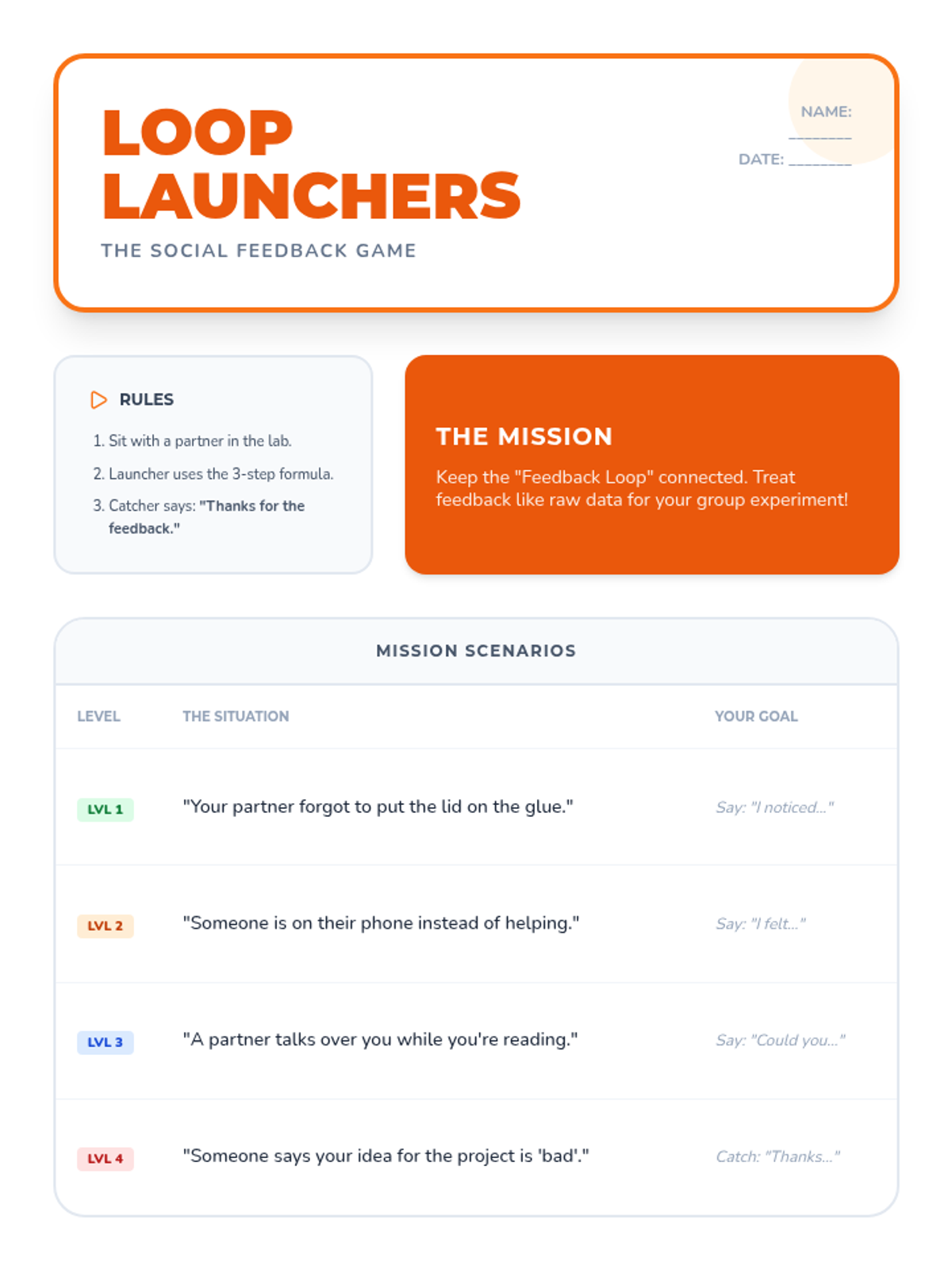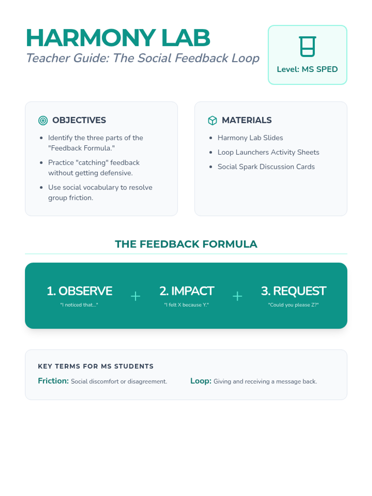 A social-emotional learning lesson designed for middle school special education students to master the 'Feedback Formula.' Students will explore group dynamics through the lens of a scientific laboratory, practicing how to give and receive constructive feedback to maintain positive peer relationships.