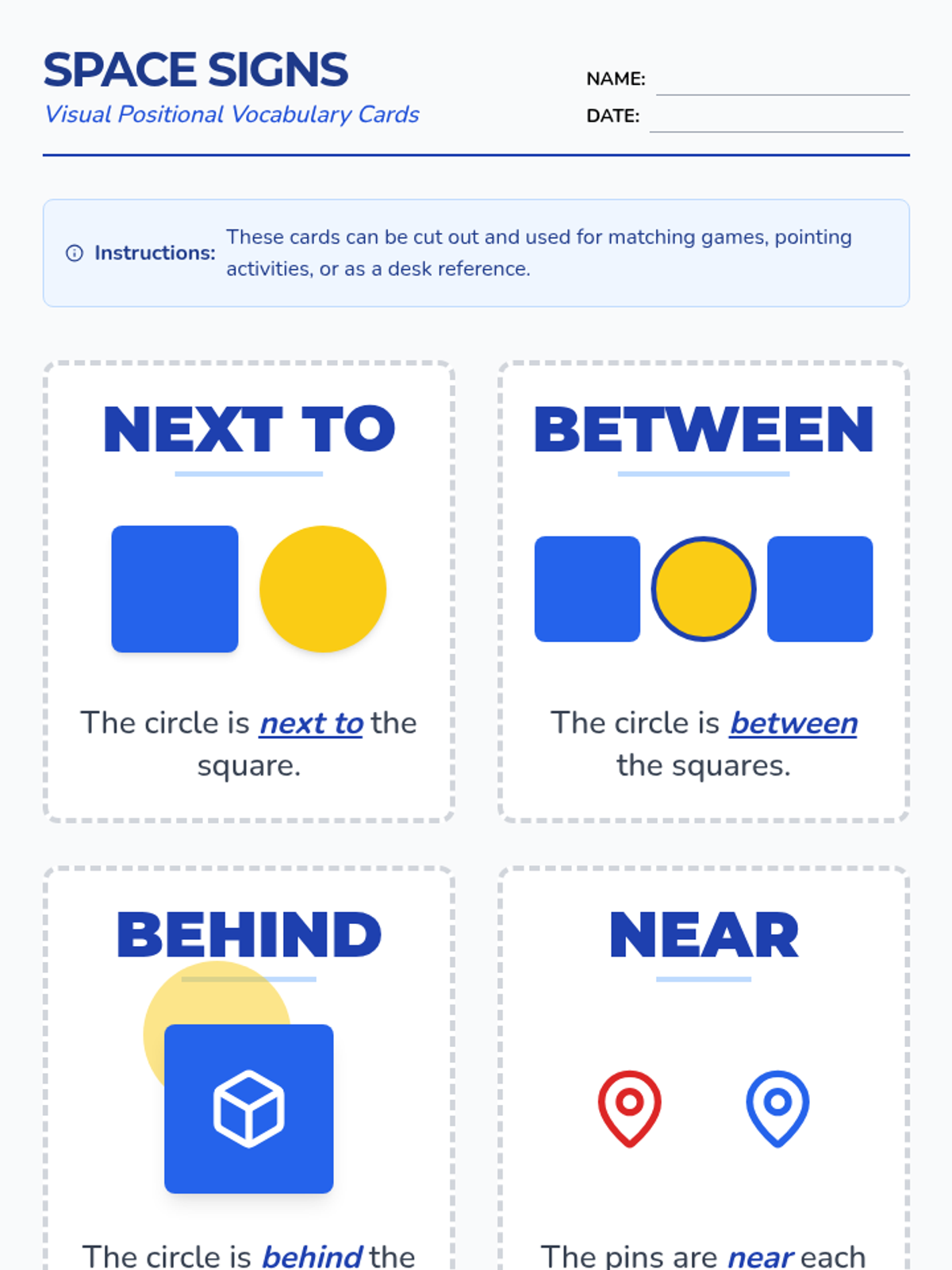 Introduction to positional vocabulary (near, far, next to, behind, between) using visual supports and simple classroom objects.