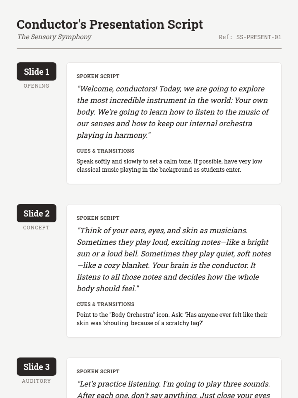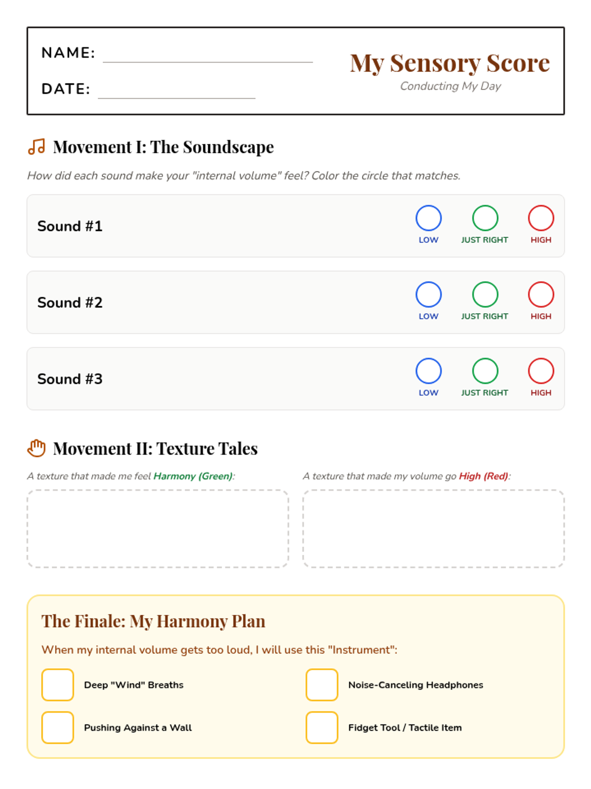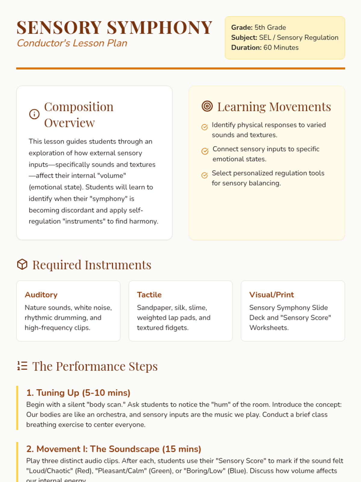 A multi-sensory lesson for 5th graders with sensory processing needs, focusing on the connection between external stimuli (sound/texture) and internal emotional states to build self-regulation skills.