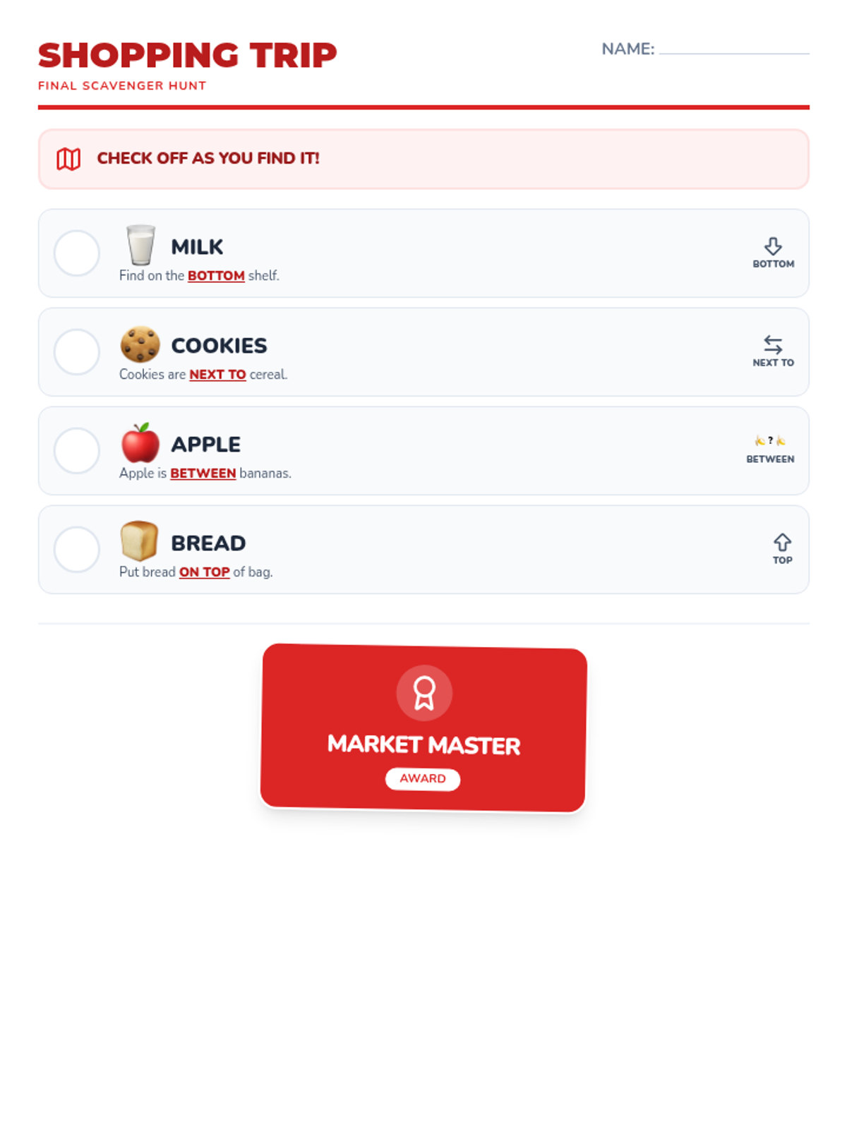 A cumulative review lesson applying all positional words to a full shopping trip simulation.