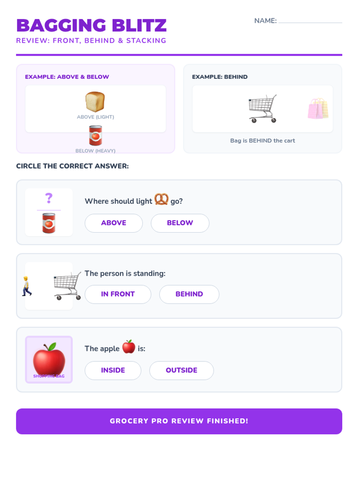 Explores 'in front of' and 'behind' through bagging groceries and cart organization.