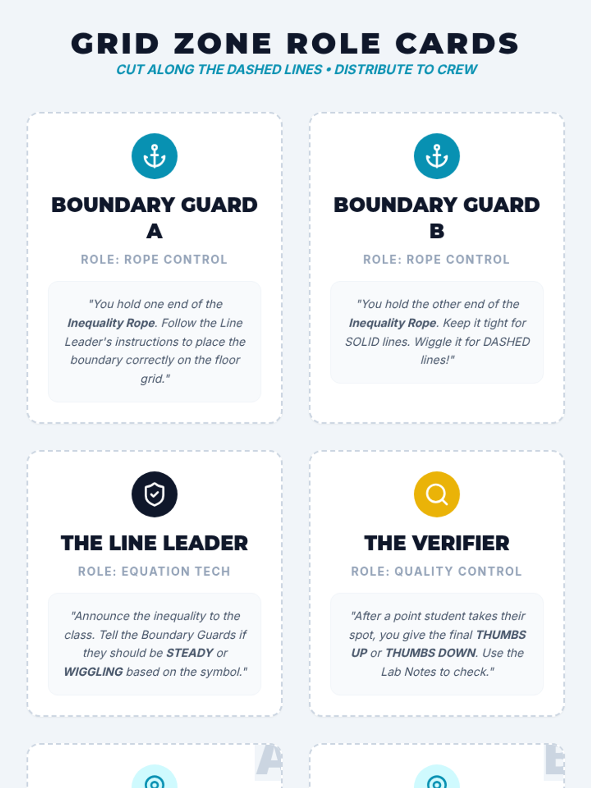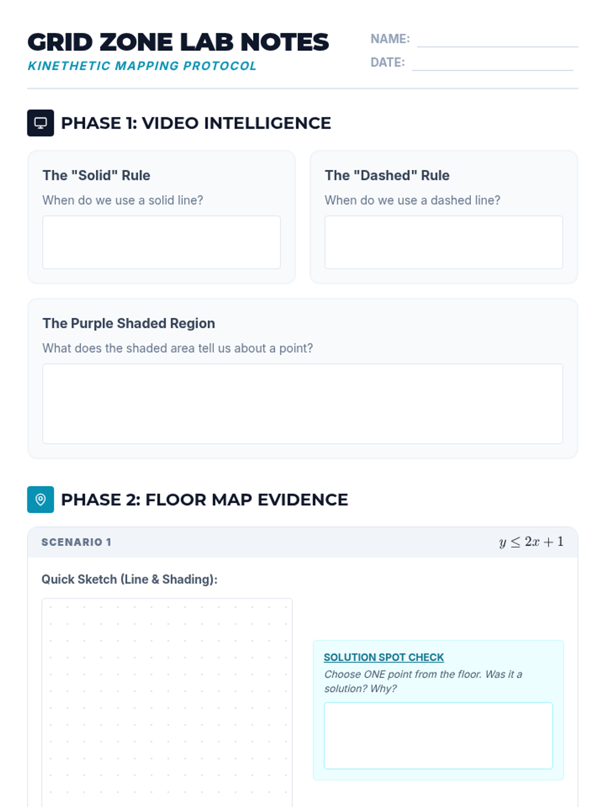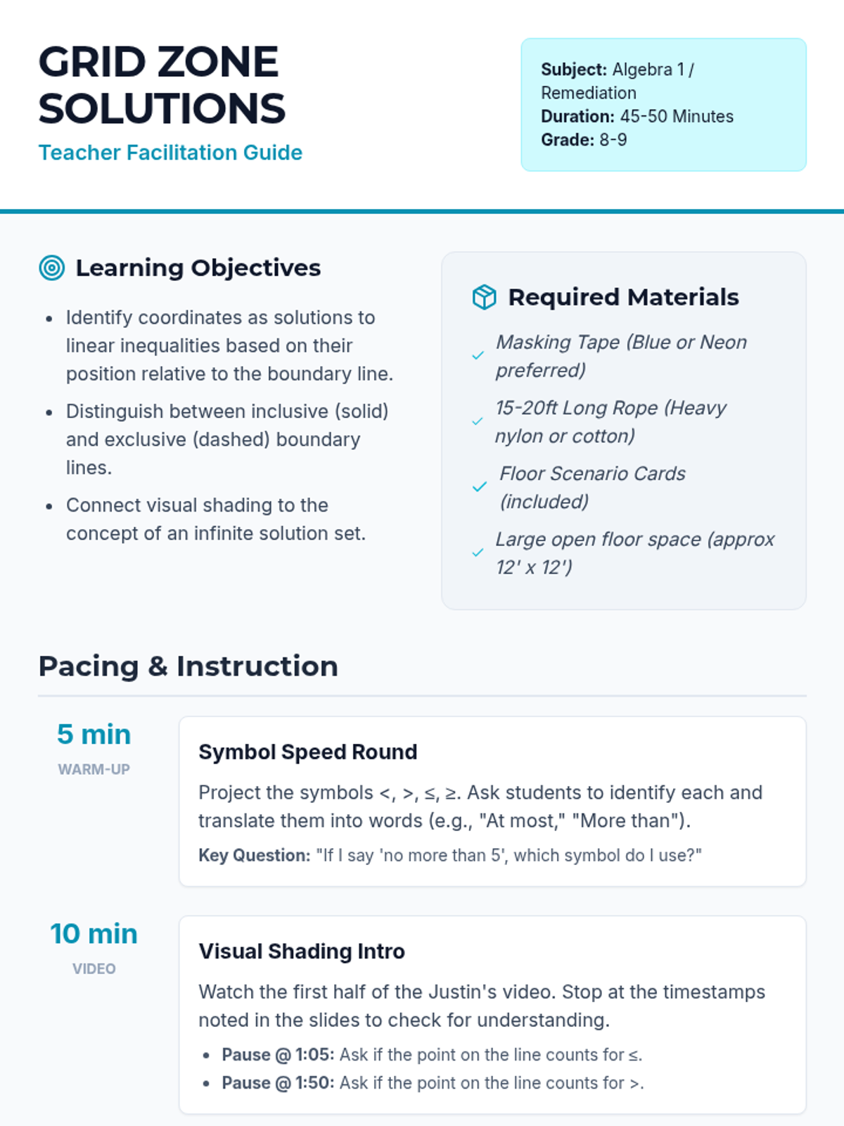 A kinesthetic lesson where students physically map solution sets for linear inequalities on a life-sized floor coordinate plane. Students use a rope to represent boundary lines and their own positions to verify solutions based on shading and line type.