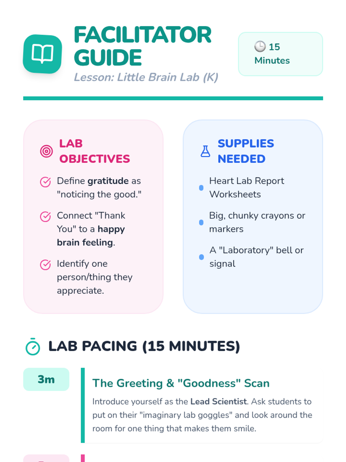 A simplified introduction to gratitude for kindergarteners, focusing on identifying feelings of happiness and practicing 'thank you' through a playful 'Happy Brain' science theme.