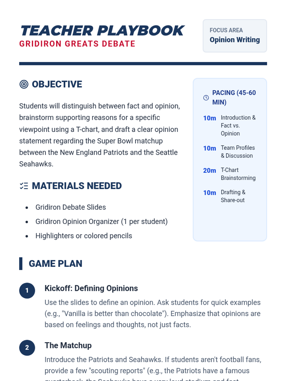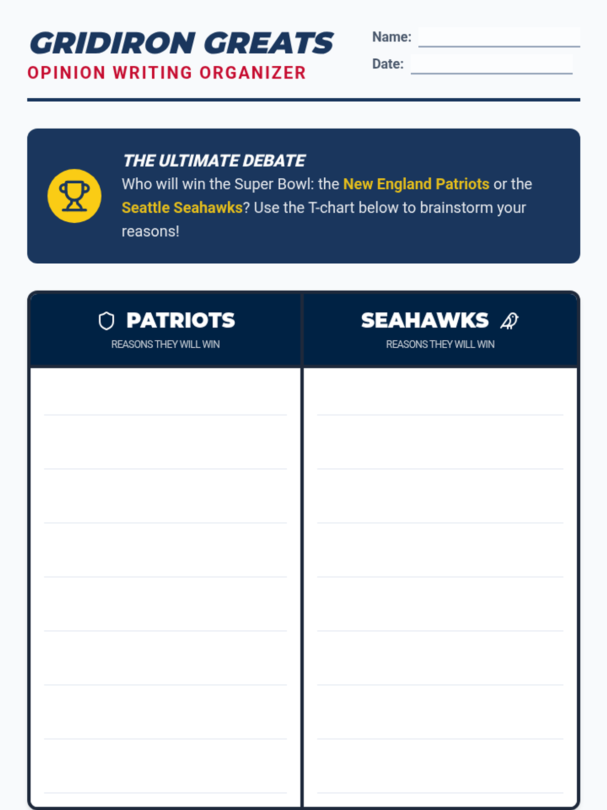 A lesson on opinion writing using the classic Super Bowl matchup between the Patriots and the Seahawks as a debate prompt. Students will practice brainstorming reasons and organizing their thoughts using a T-chart.