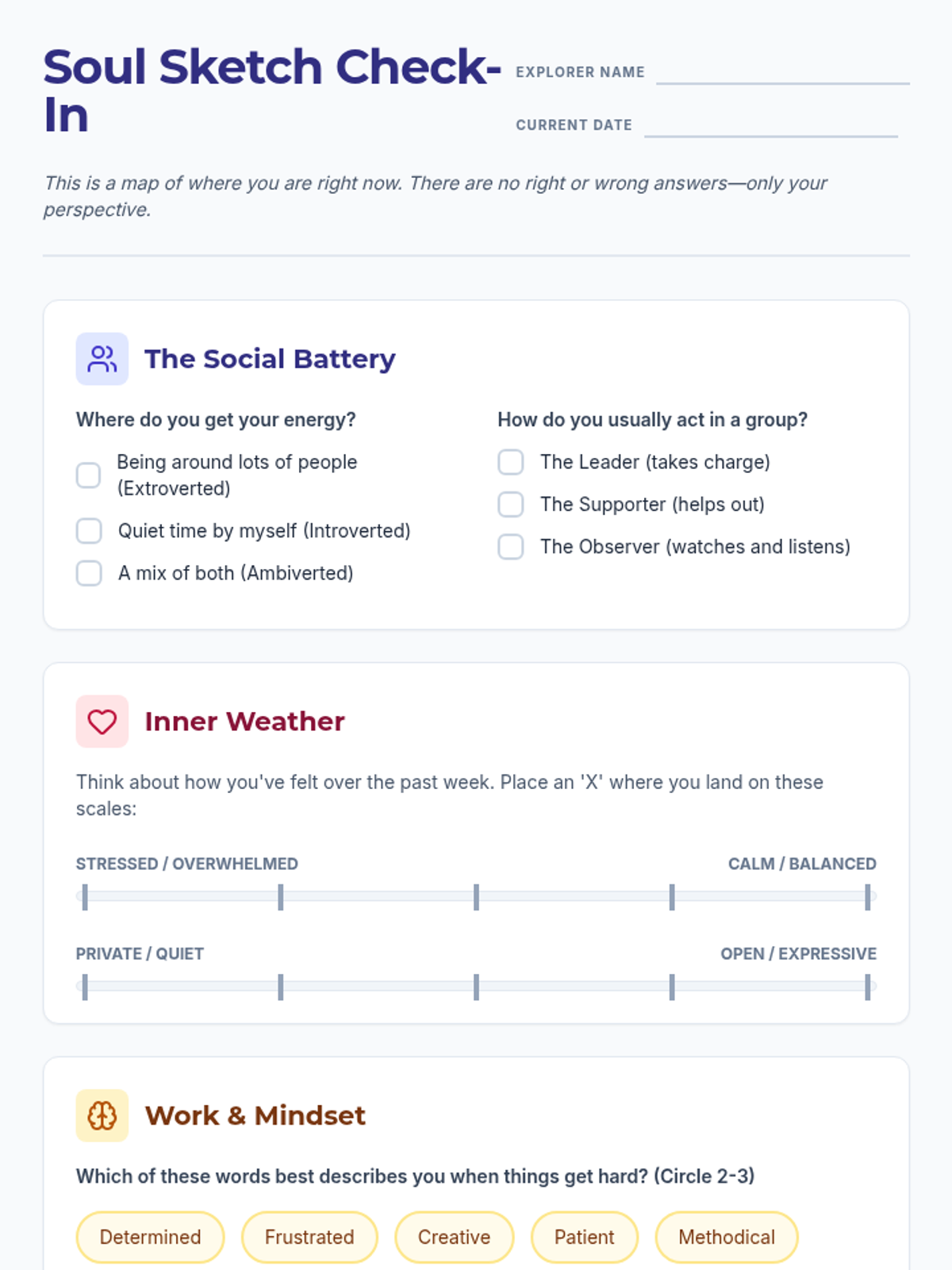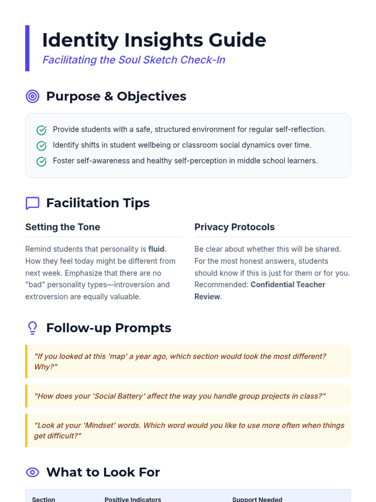 A guided self-reflection lesson for middle schoolers to explore their personality traits, emotional landscape, and social dynamics. This lesson provides students with a structured way to check in with themselves and their personal growth.