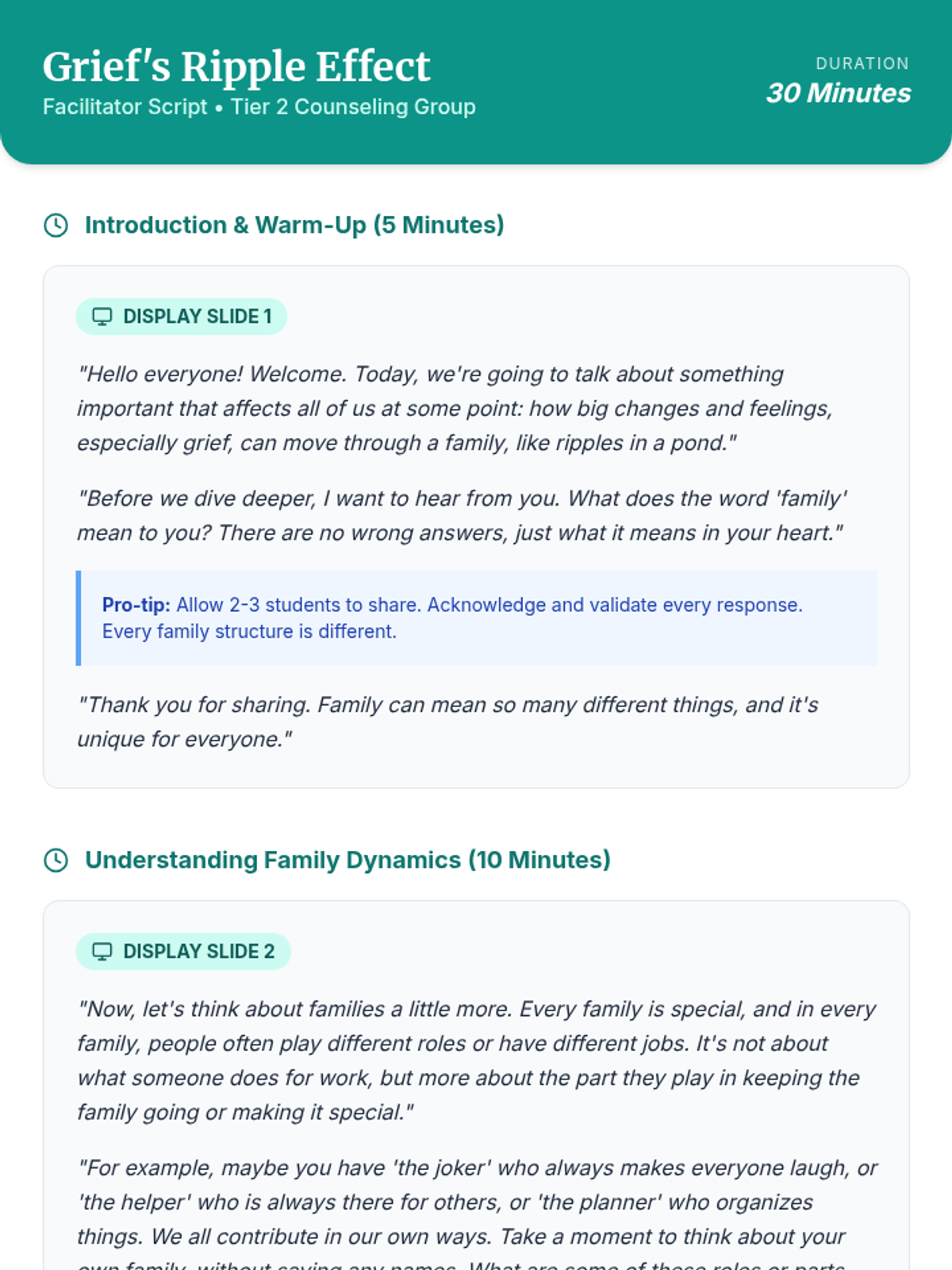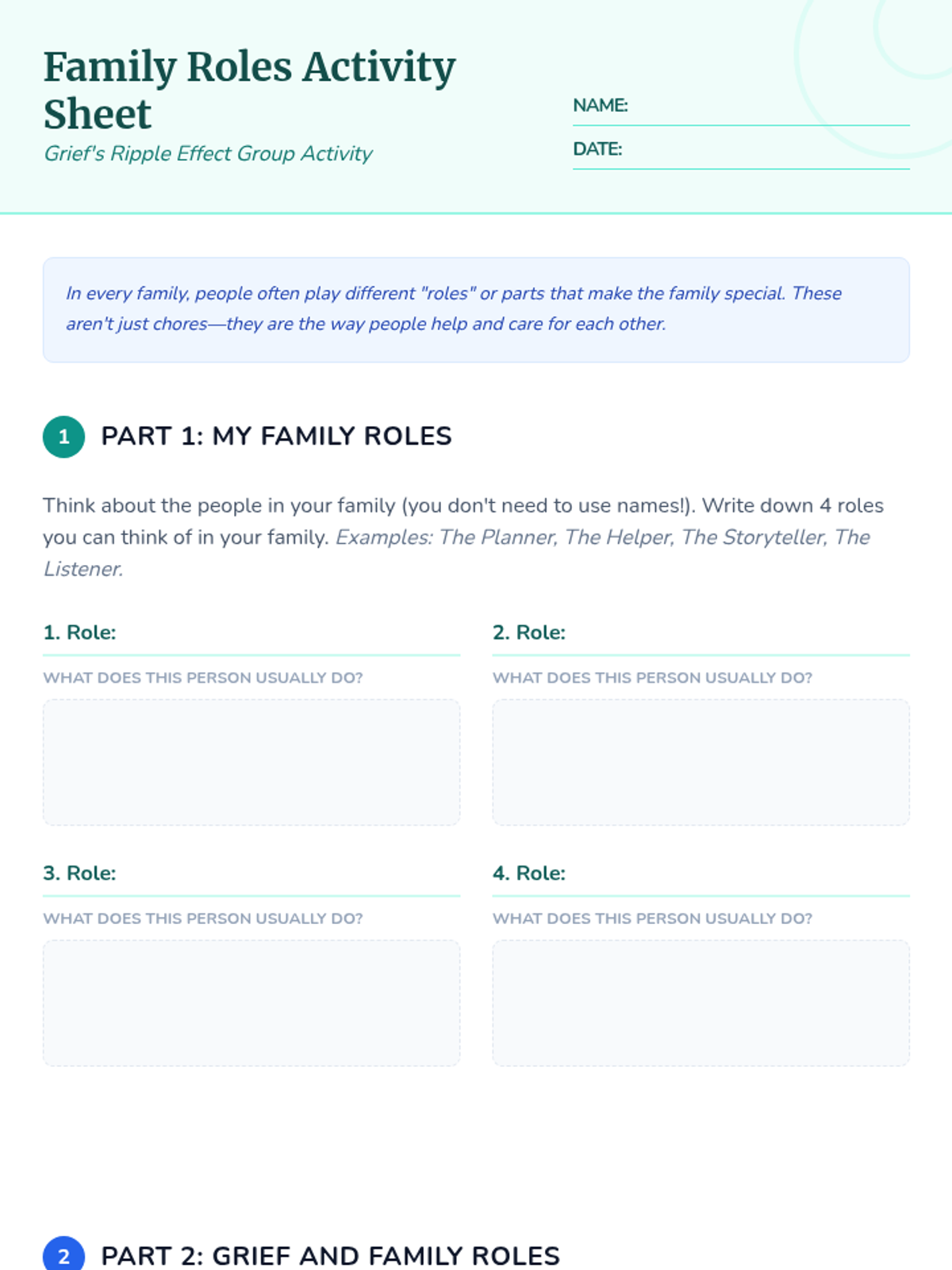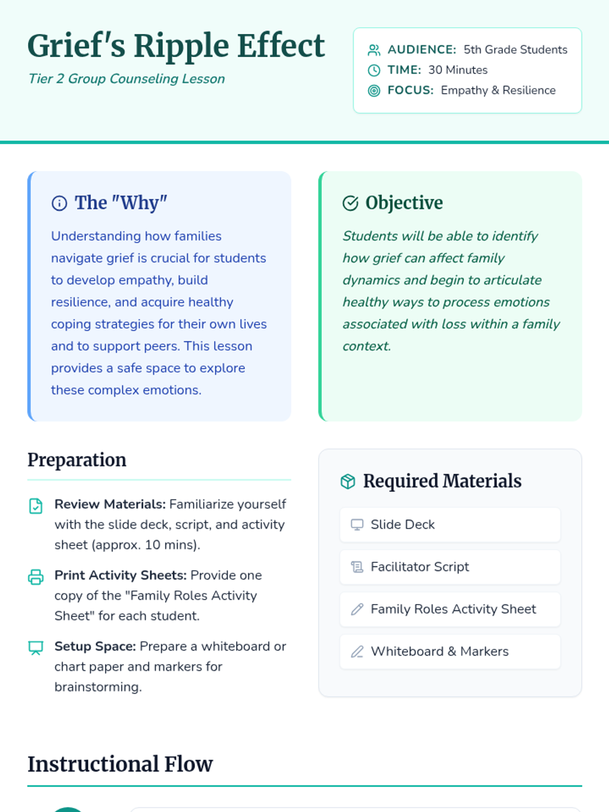 A Tier 2 counseling group lesson for 5th graders that explores the concept of family roles and how they are impacted by the 'ripple effect' of grief, focusing on empathy and healthy coping strategies.