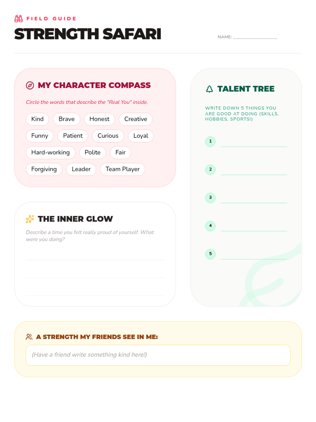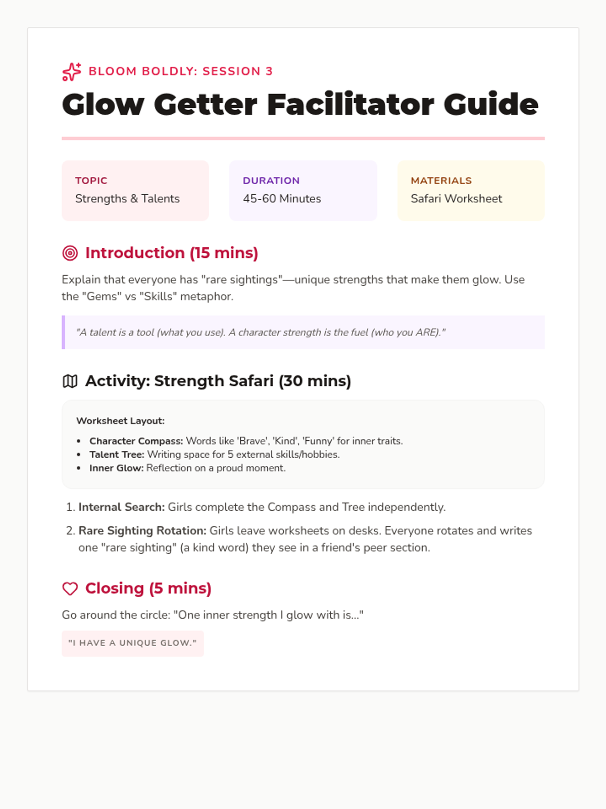 Focuses on identifying unique strengths, talents, and character traits that make each girl special.