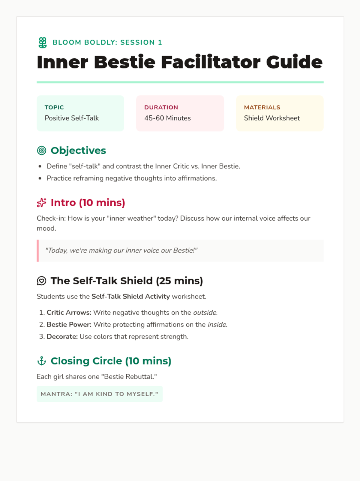Introduces the concept of 'self-talk' and teaches girls how to transform their inner critic into an inner cheerleader.