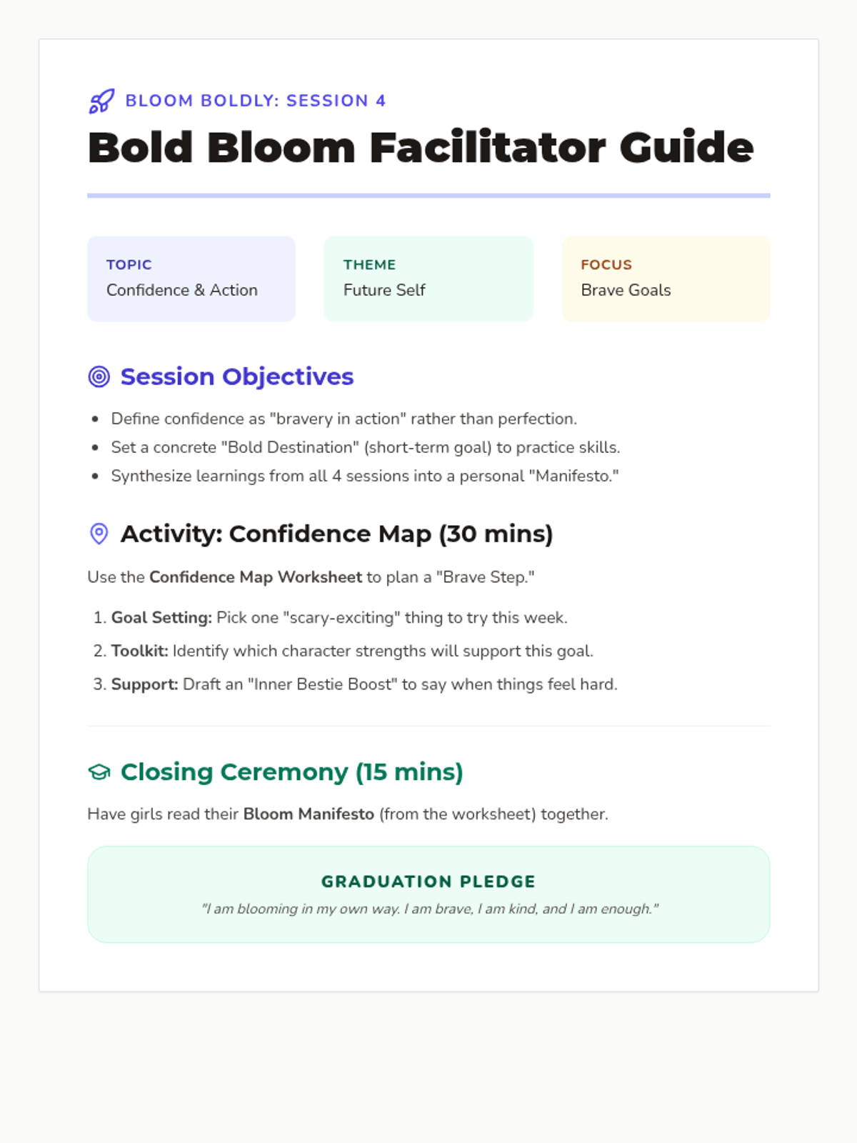 Synthesizes learning into actionable confidence and goal-setting for the future.