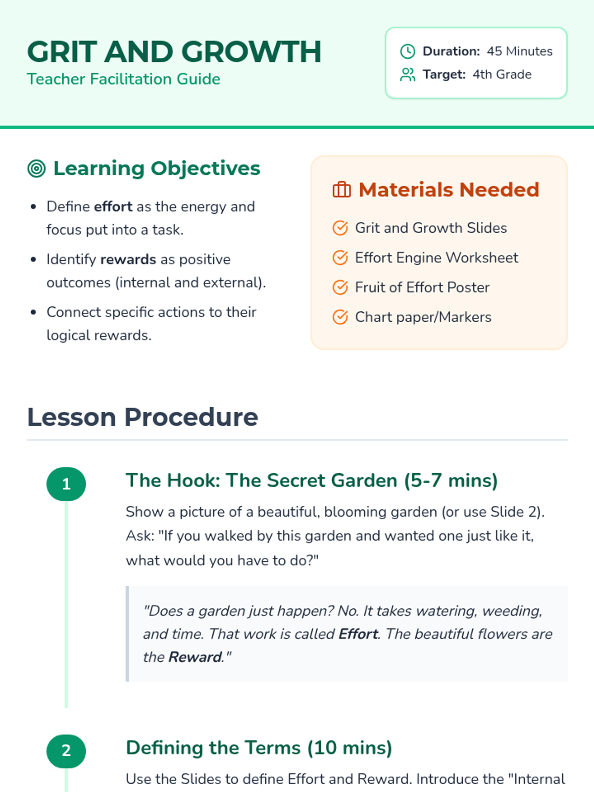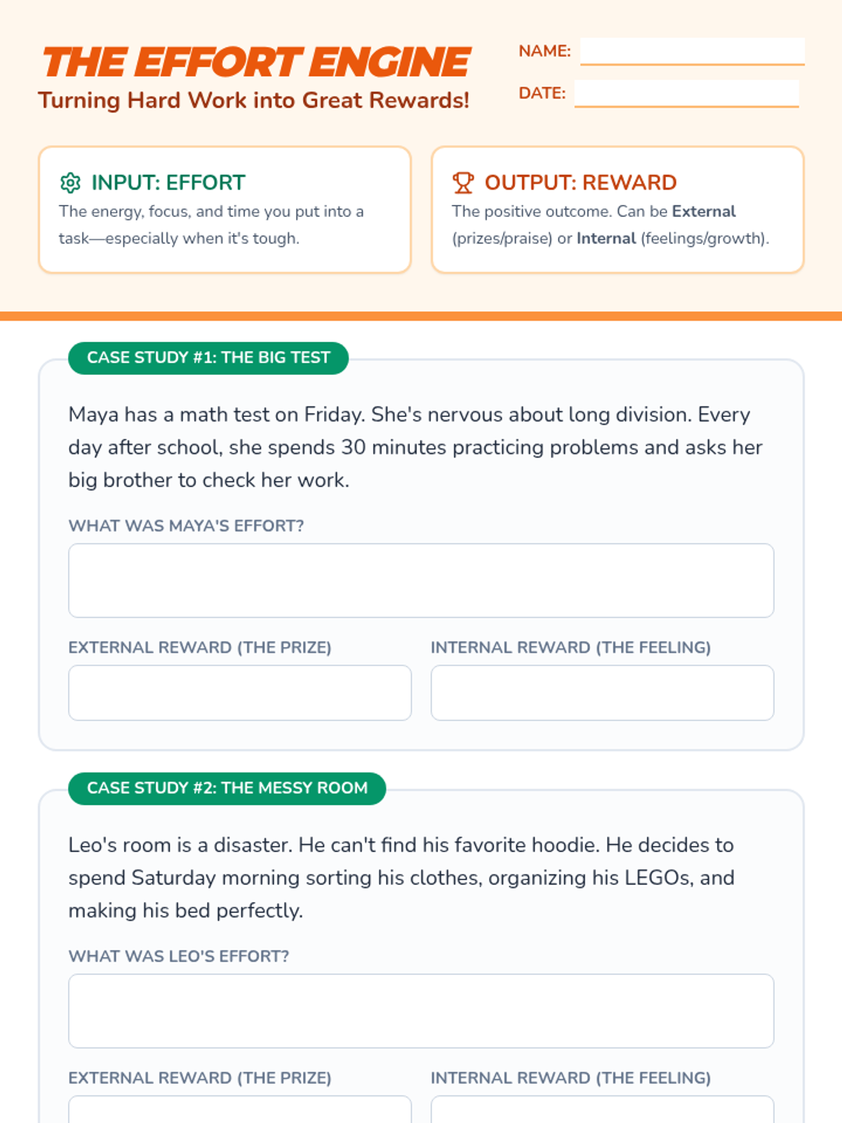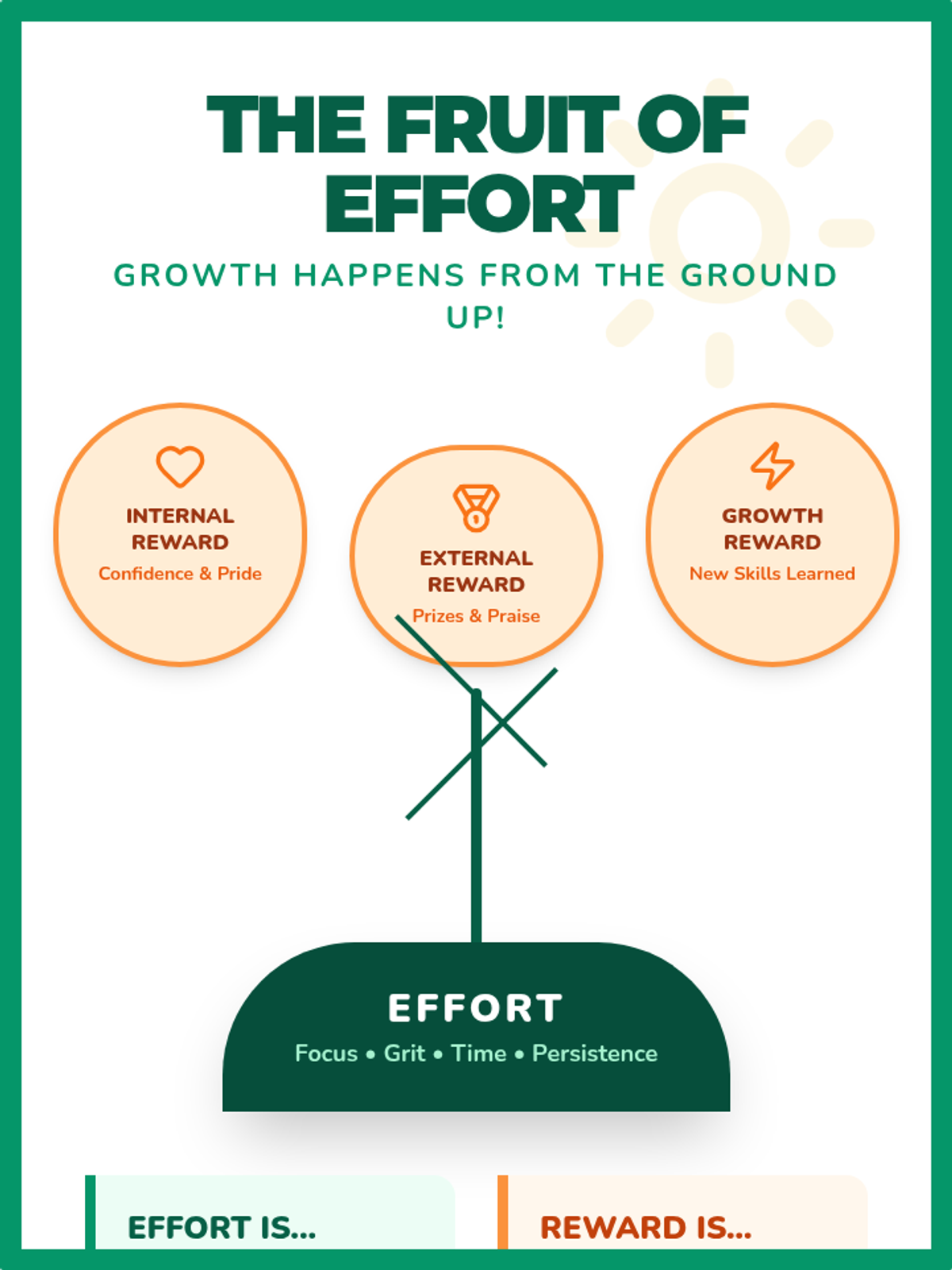 A lesson for 4th graders on the connection between hard work (effort) and the positive outcomes (rewards) that follow, emphasizing that rewards can be internal or external.