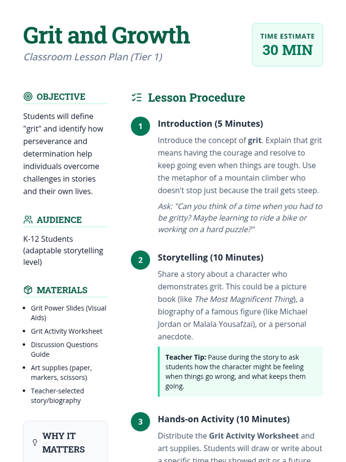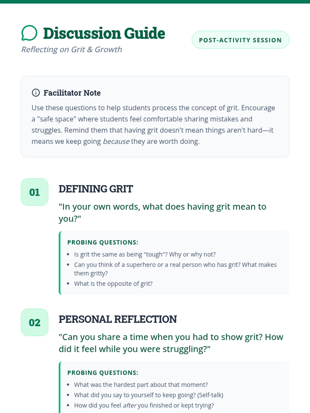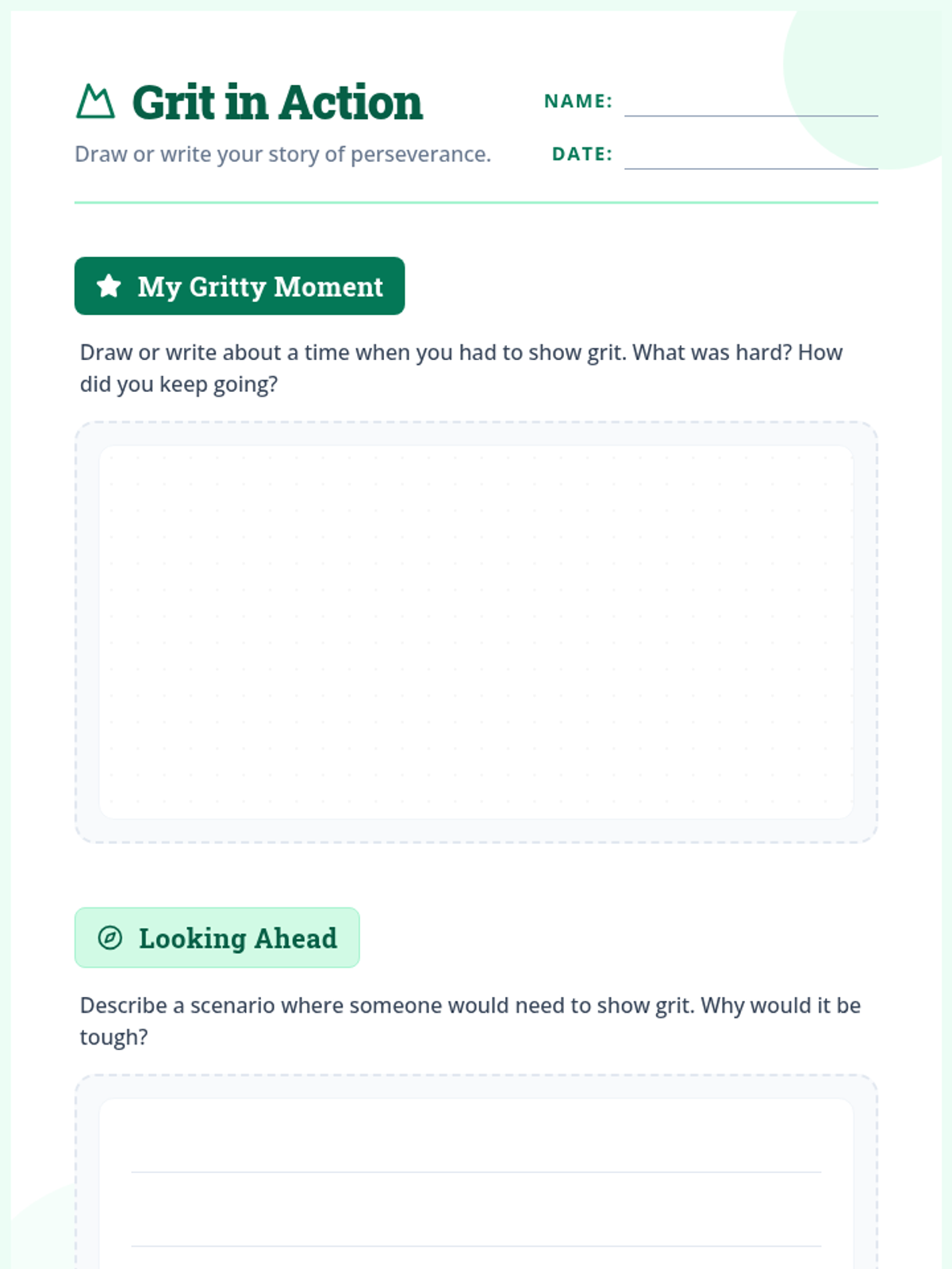 Students explore the concept of grit through storytelling, a hands-on drawing/writing activity, and reflective discussion. They learn to identify perseverance in themselves and others, building a foundation for resilience.