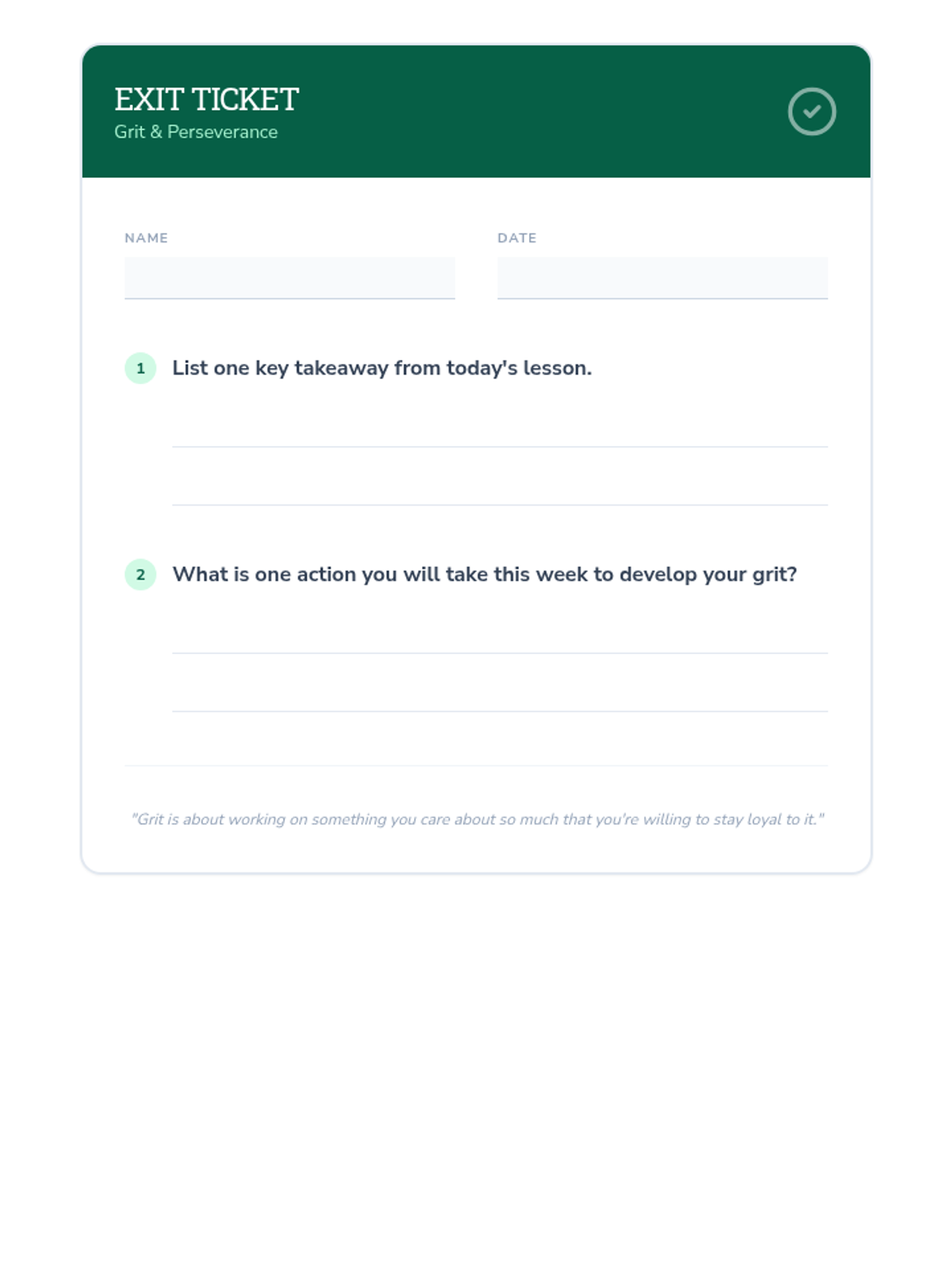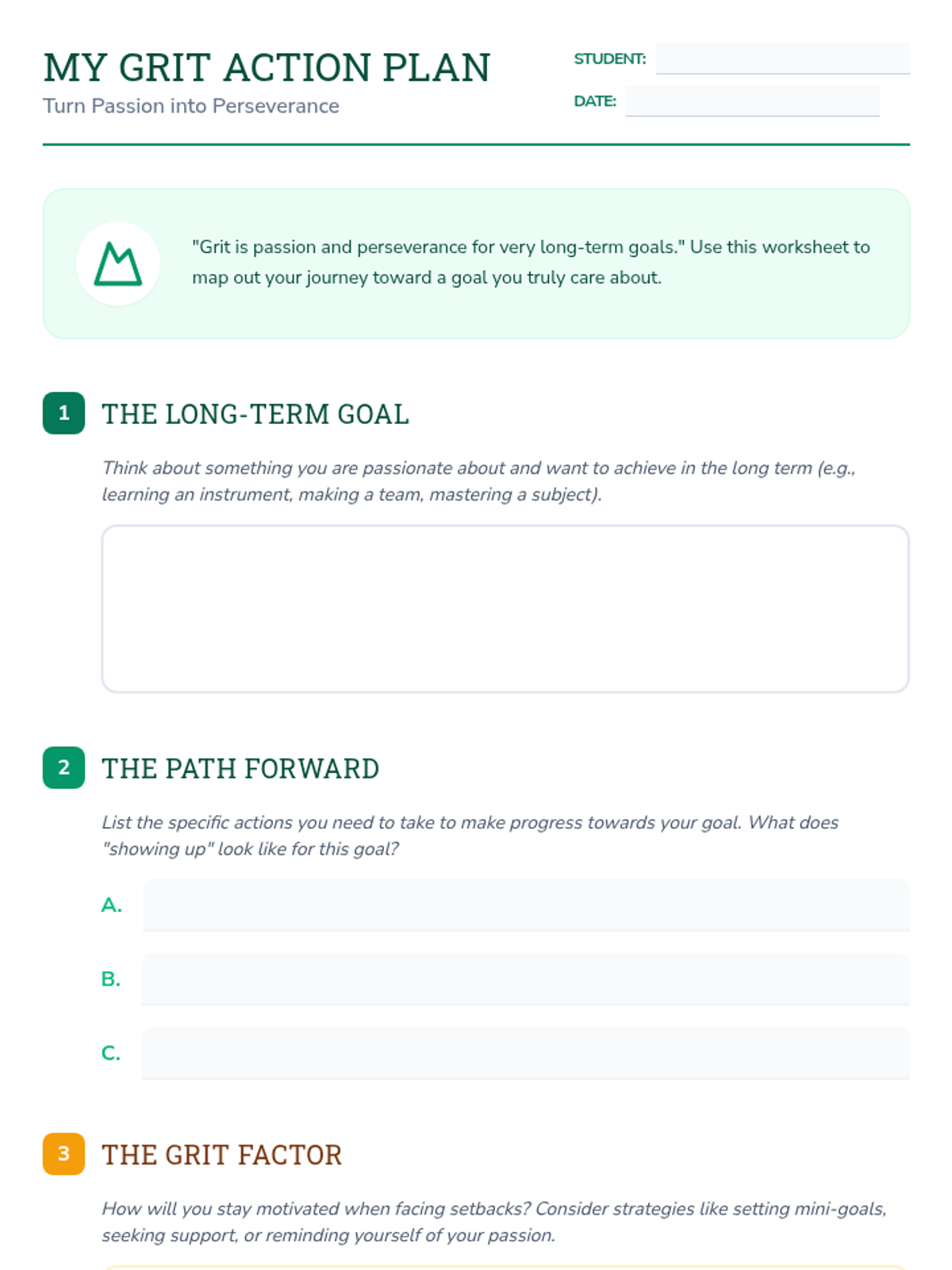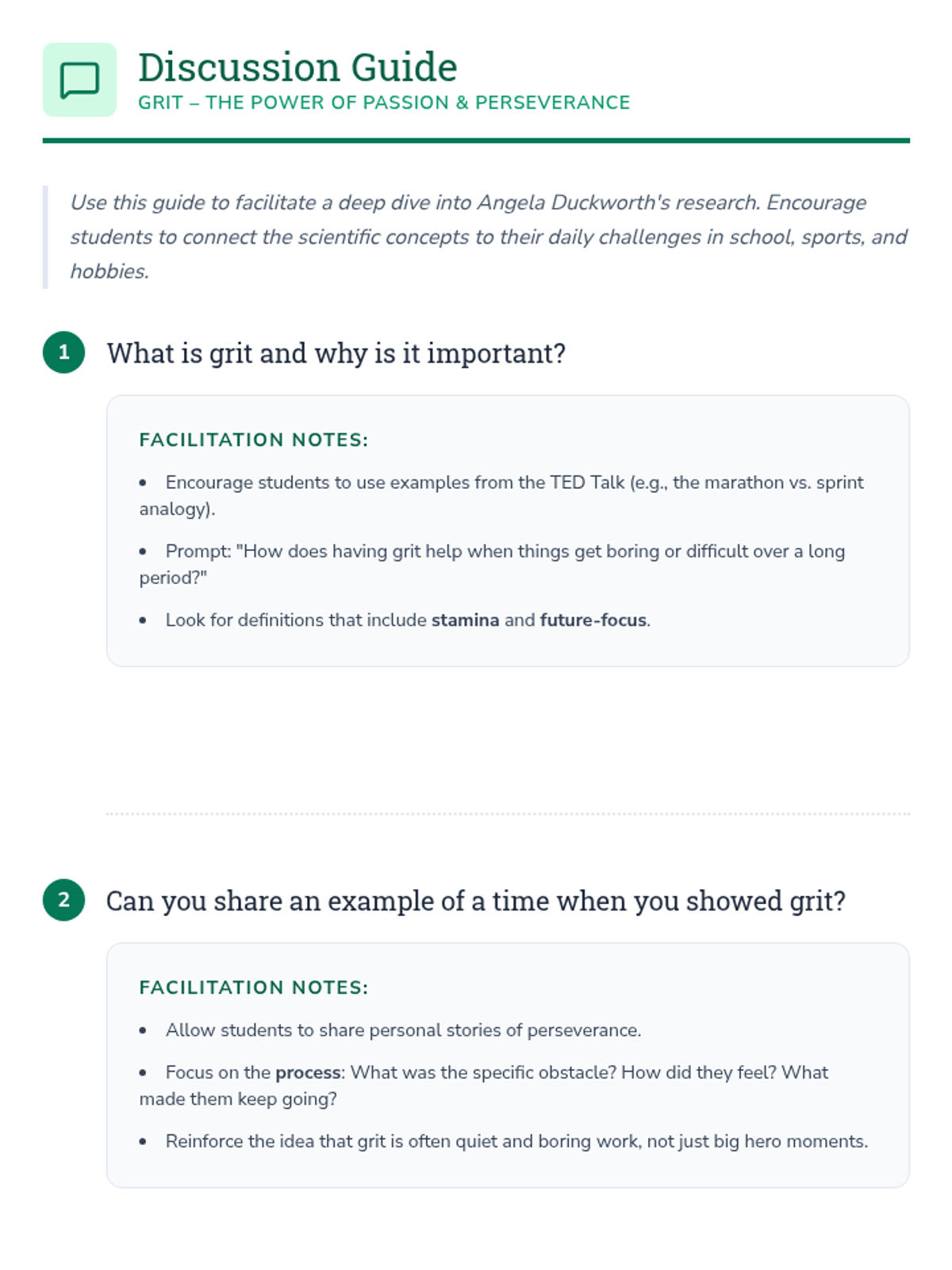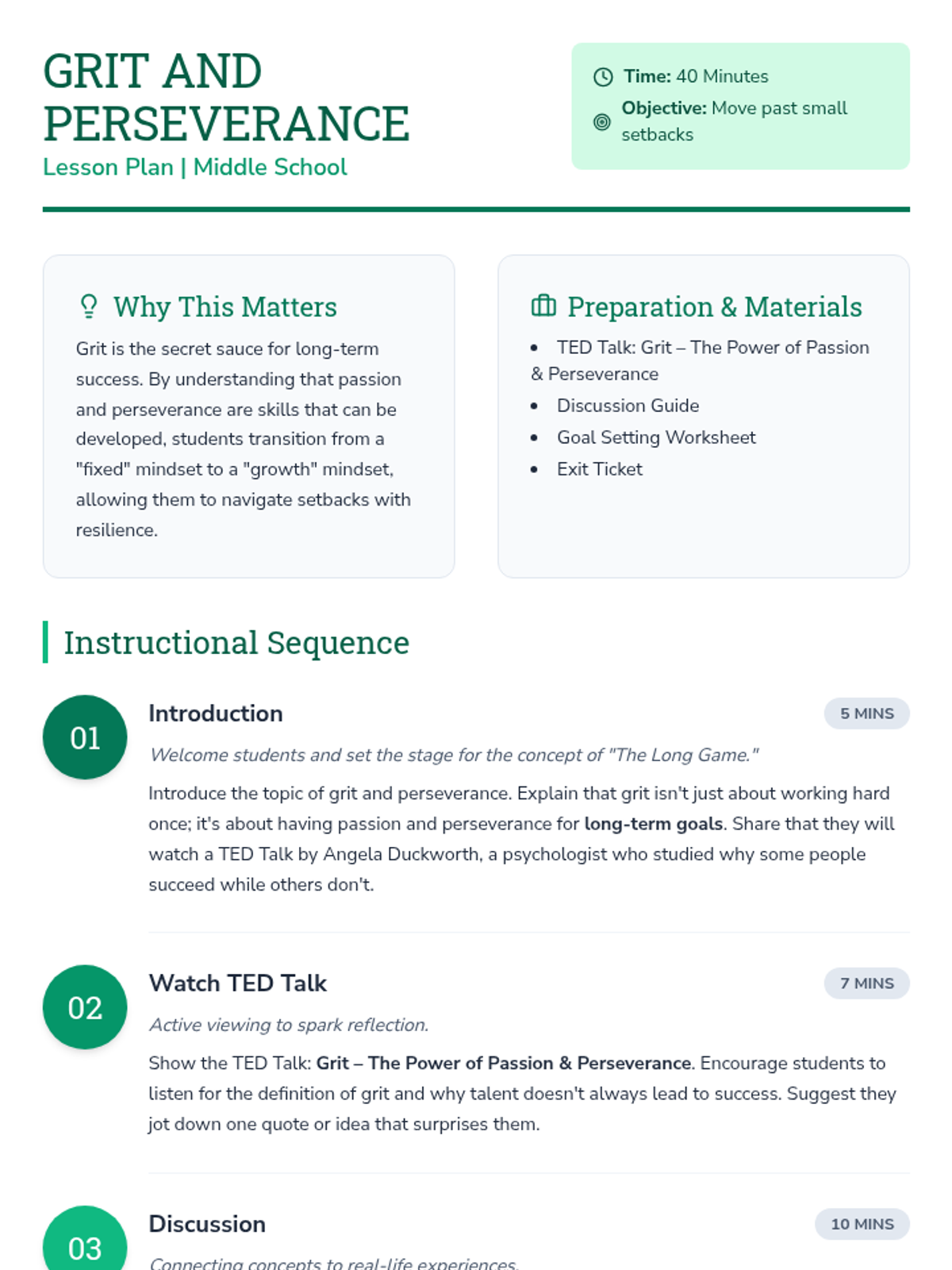 Students explore the concept of grit through Angela Duckworth's TED Talk, engage in reflective discussion, and create personalized action plans to build perseverance and a growth mindset.