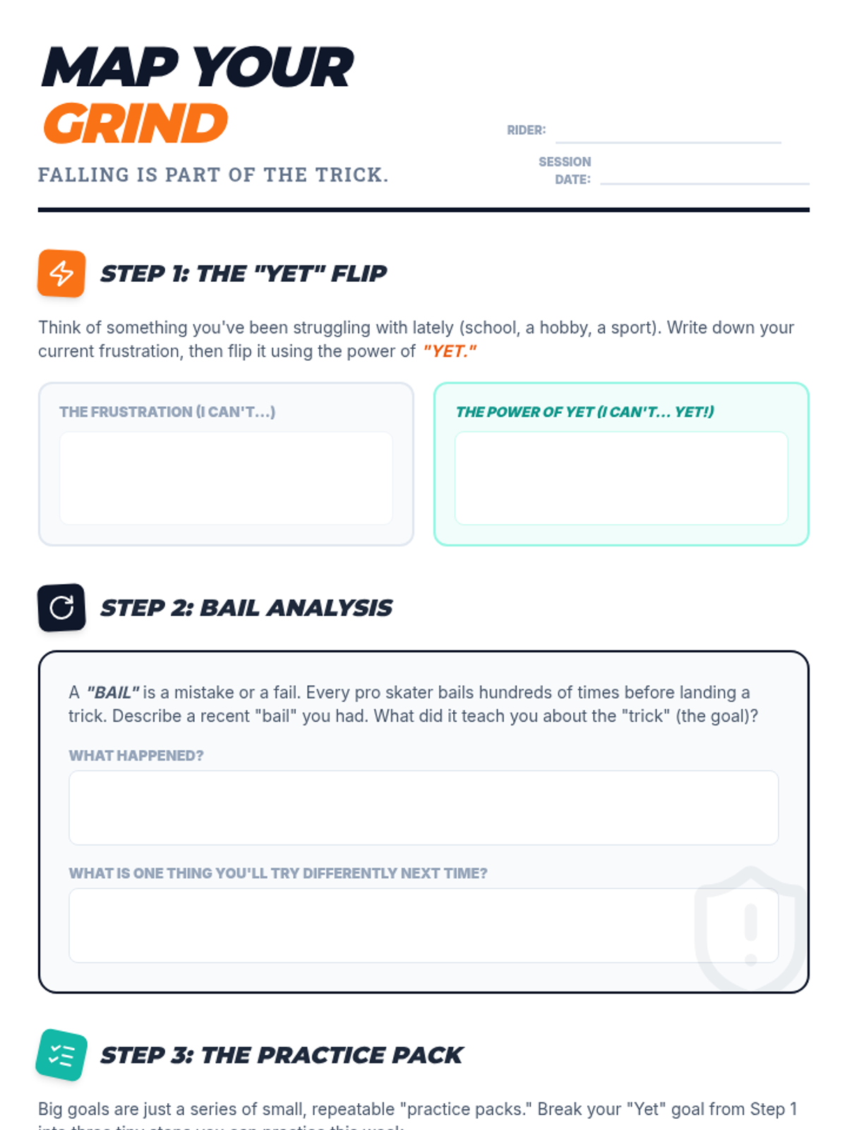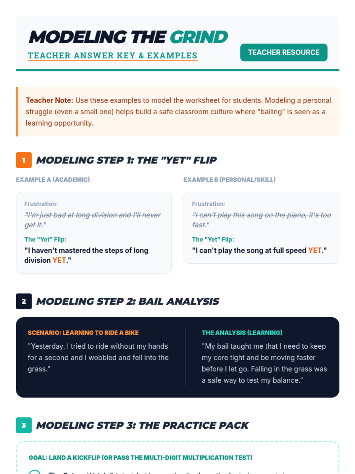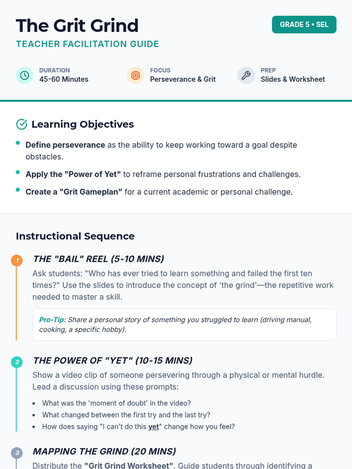 A high-energy lesson on perseverance and grit using a 'Grit Grind' skateboard theme to help 5th graders understand that failure is a necessary part of growth. Students will learn the power of 'yet' and how to build resilience through challenges.