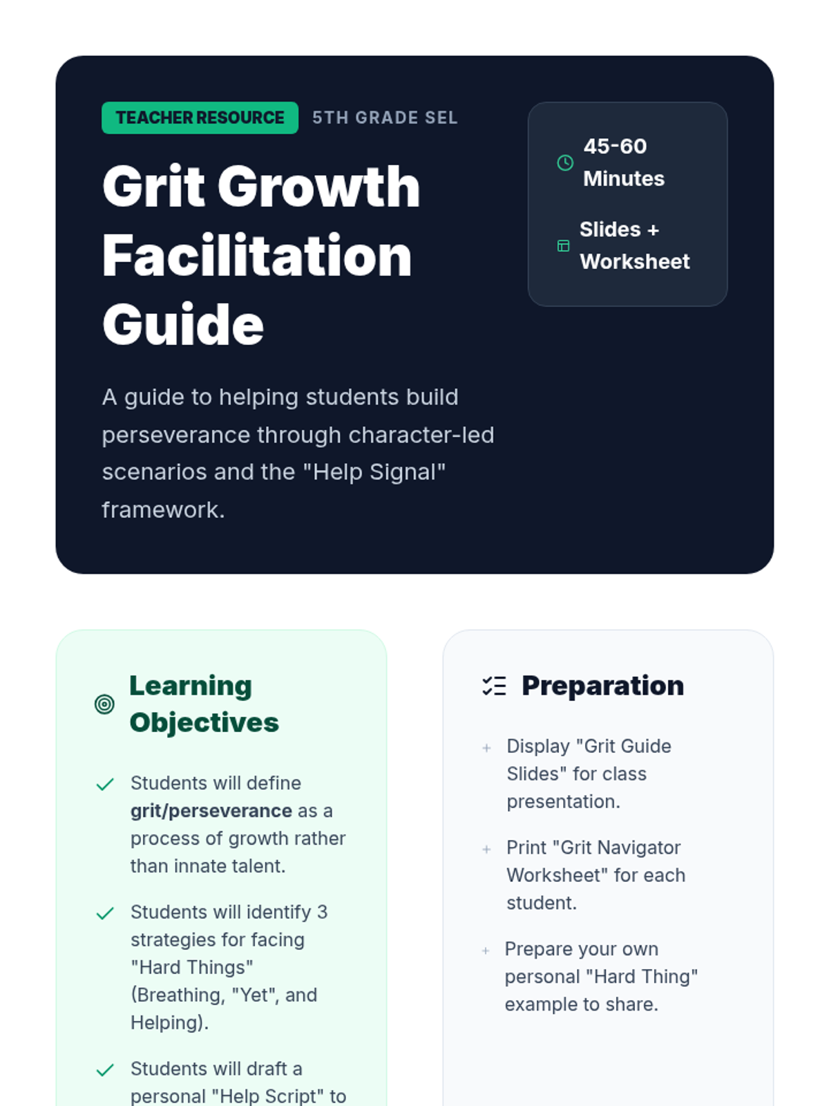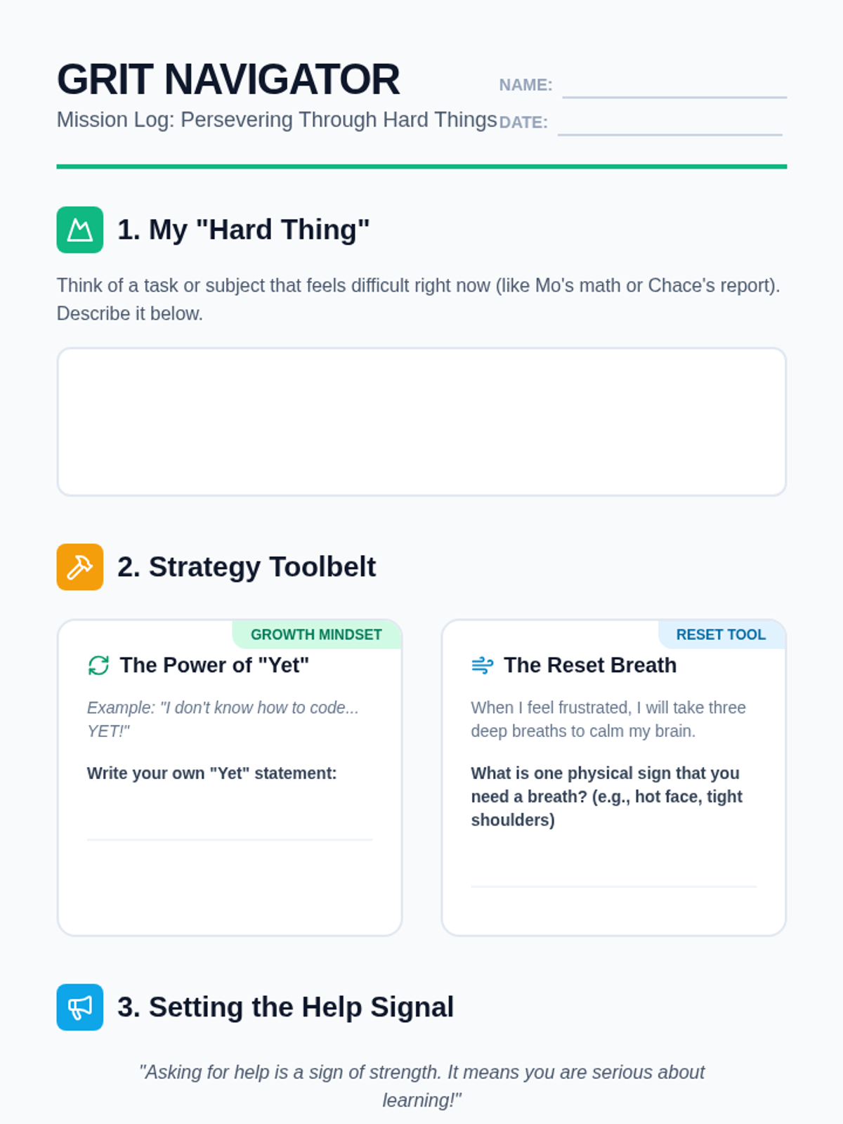 A social-emotional learning lesson for 5th graders focused on perseverance, growth mindset, and the importance of asking for help when facing difficult challenges. Featuring relatable scenarios involving three students: AJ, Chace, and Mo.