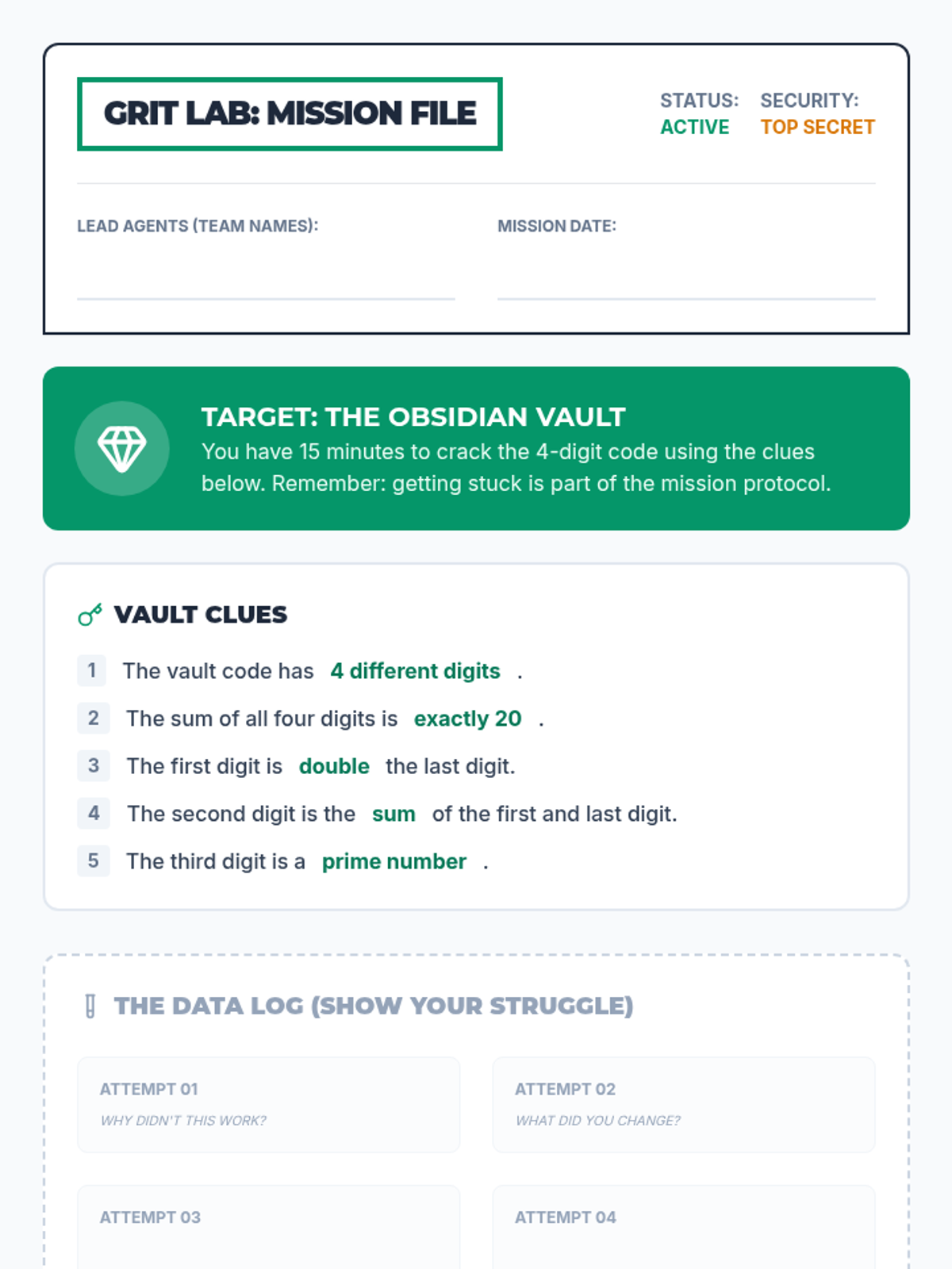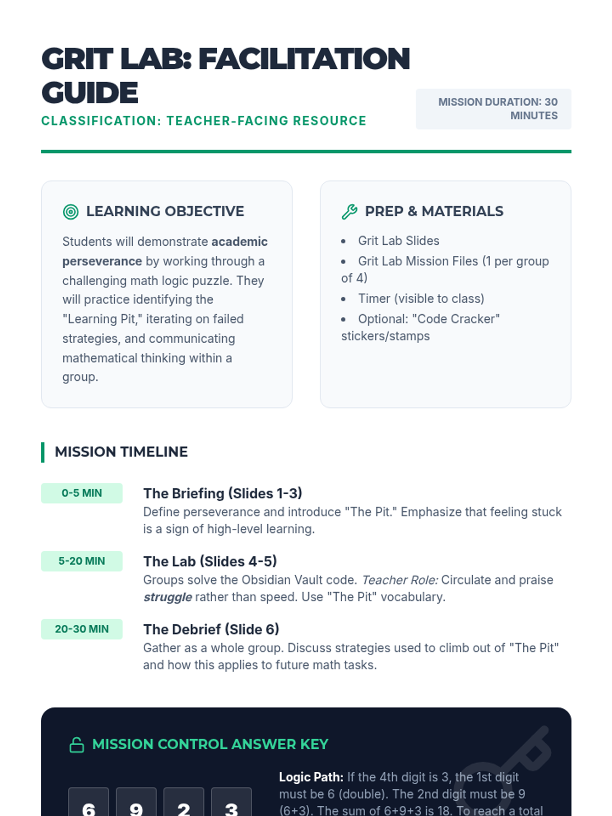 A 30-minute lesson focused on academic perseverance and productive struggle. Students work cooperatively to solve a complex math puzzle, learning that 'getting stuck' is a natural part of the learning process.