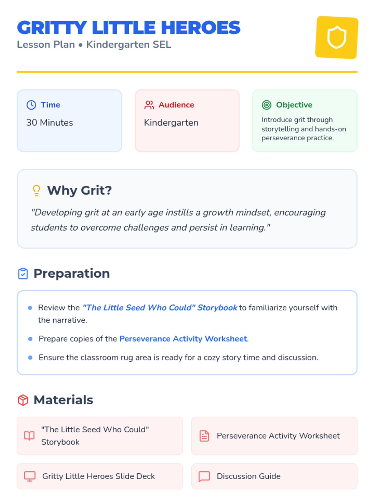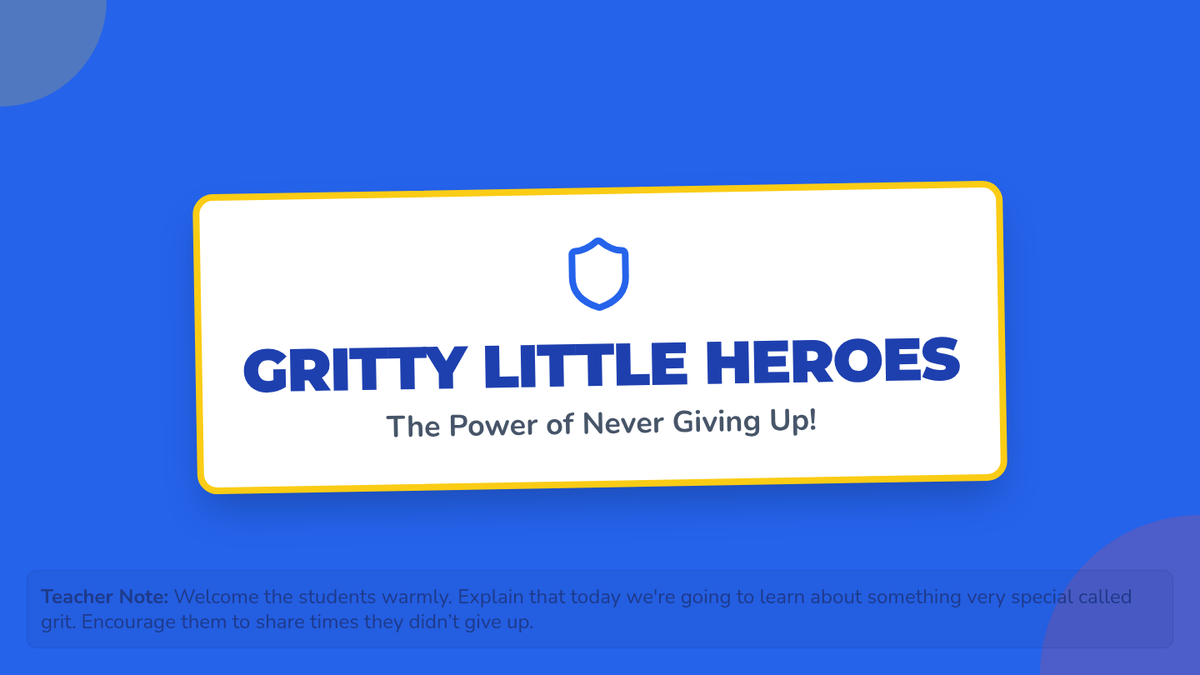 This lesson introduces kindergarten students to the concept of grit, helping them understand perseverance and resilience through engaging stories and activities. By learning about grit, students will develop a growth mindset that encourages them to keep trying even when things are challenging.
