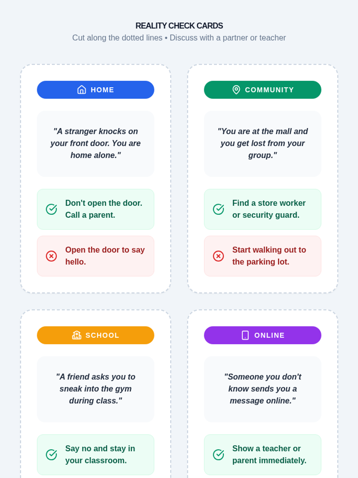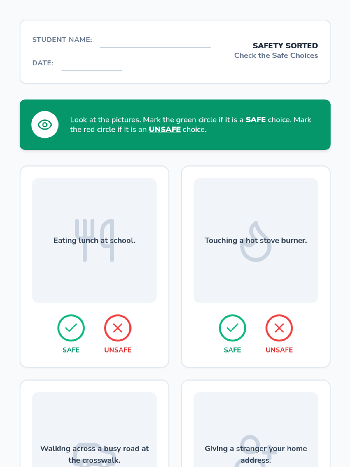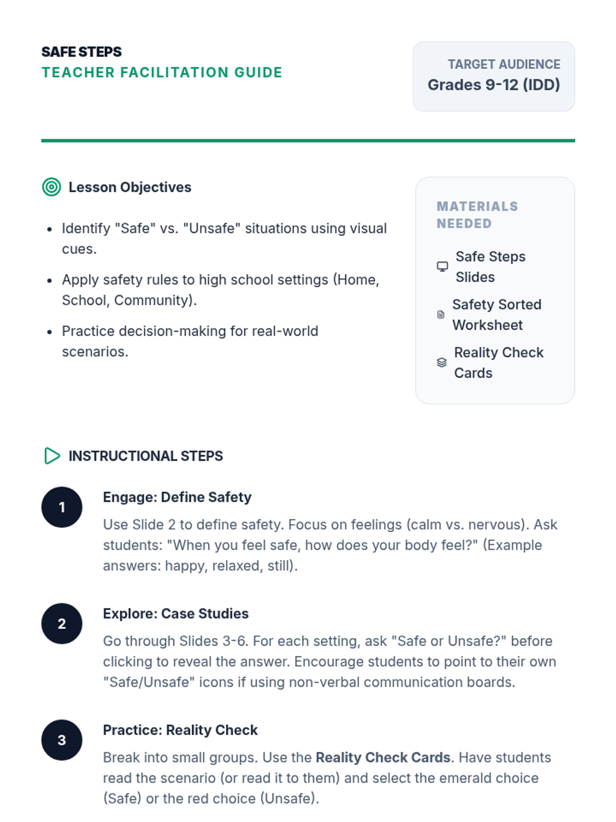 A comprehensive lesson focused on identifying safe and unsafe situations across home, school, and community settings, designed for high school students with IDD using visual supports and age-appropriate scenarios.