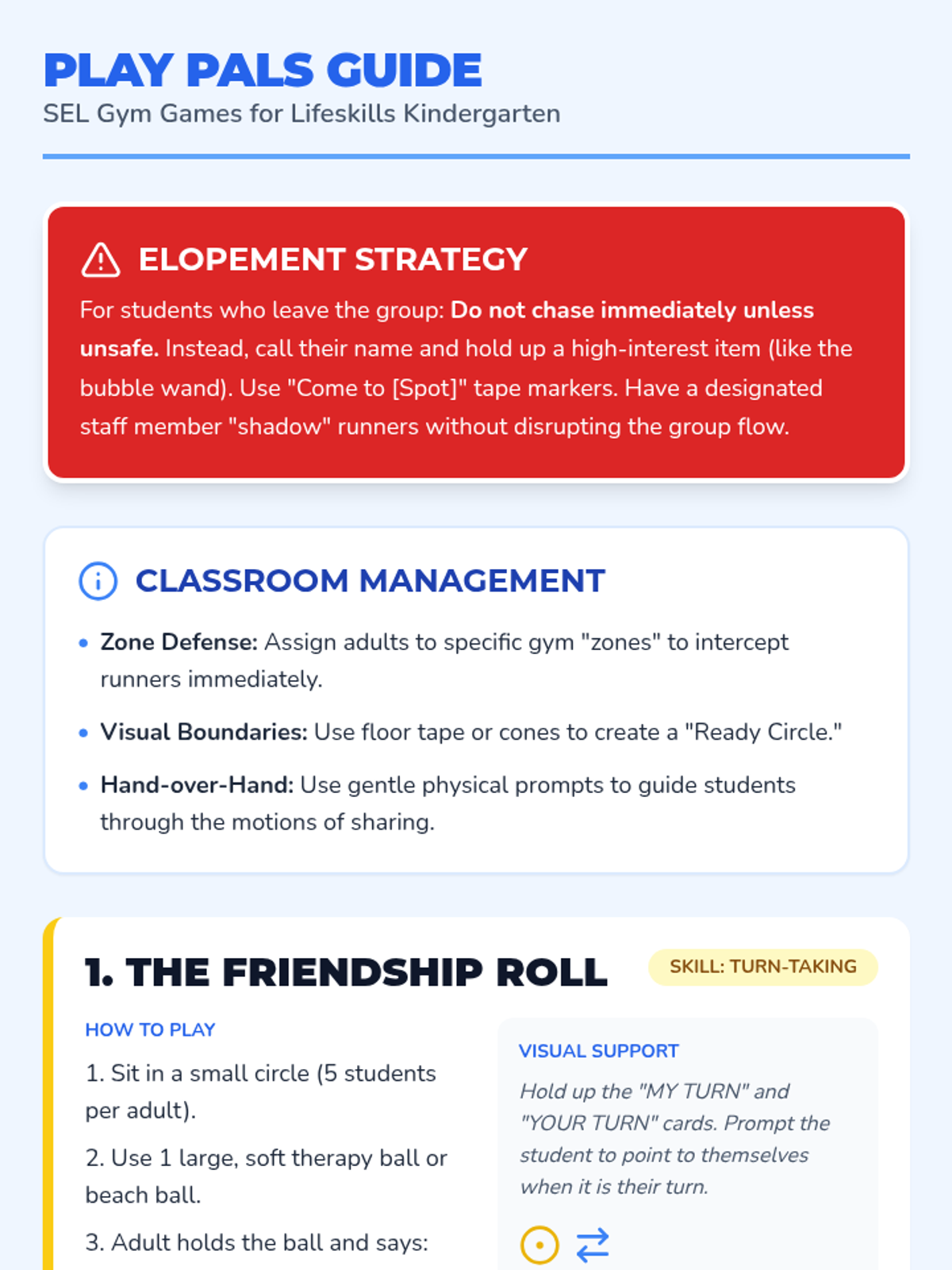 A gym-based lesson for lifeskills kindergartners focusing on foundational social-emotional skills through movement and simple play. The lesson includes high-visibility visual supports and low-complexity games designed to minimize elopement and maximize engagement.
