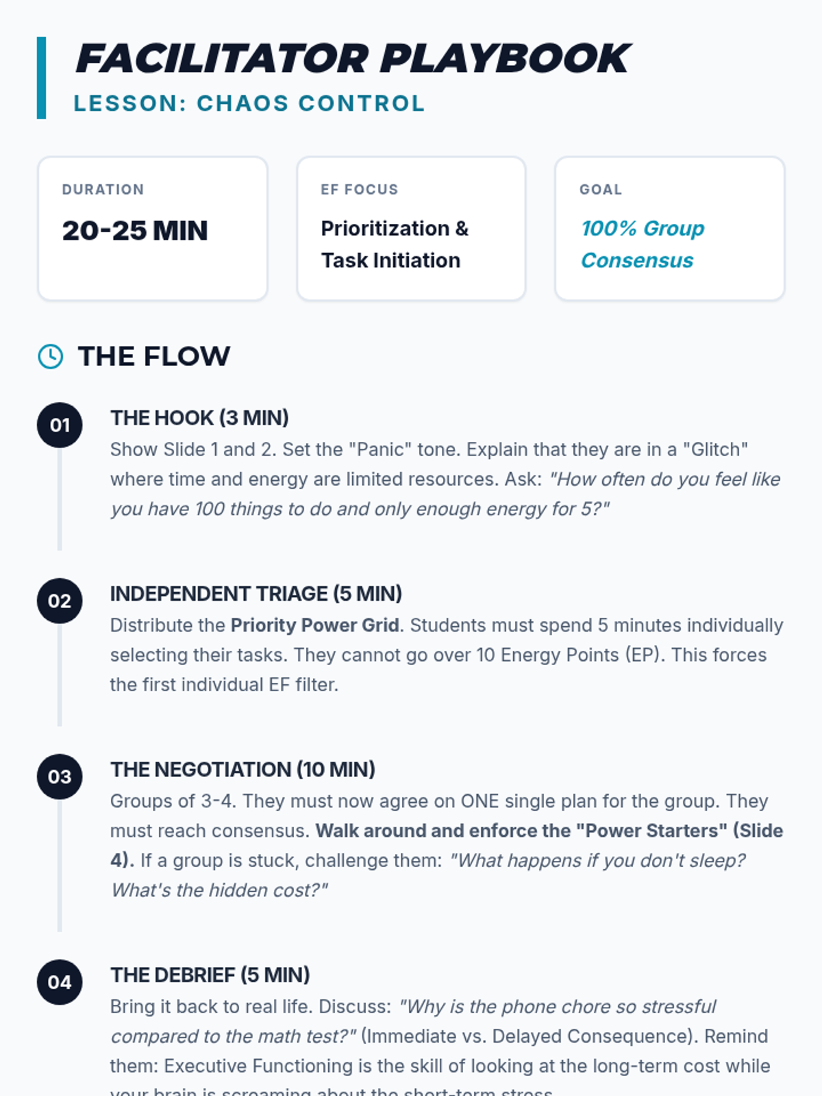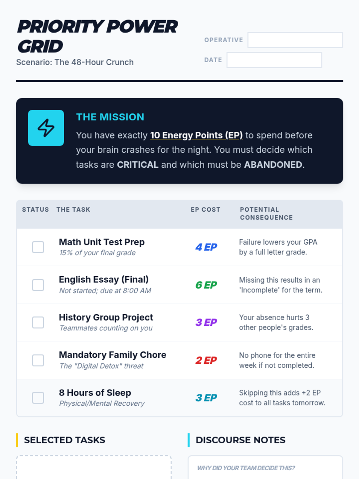 A 20-25 minute high-intensity mini-lesson where students must negotiate and prioritize competing tasks during a high-stress academic scenario.