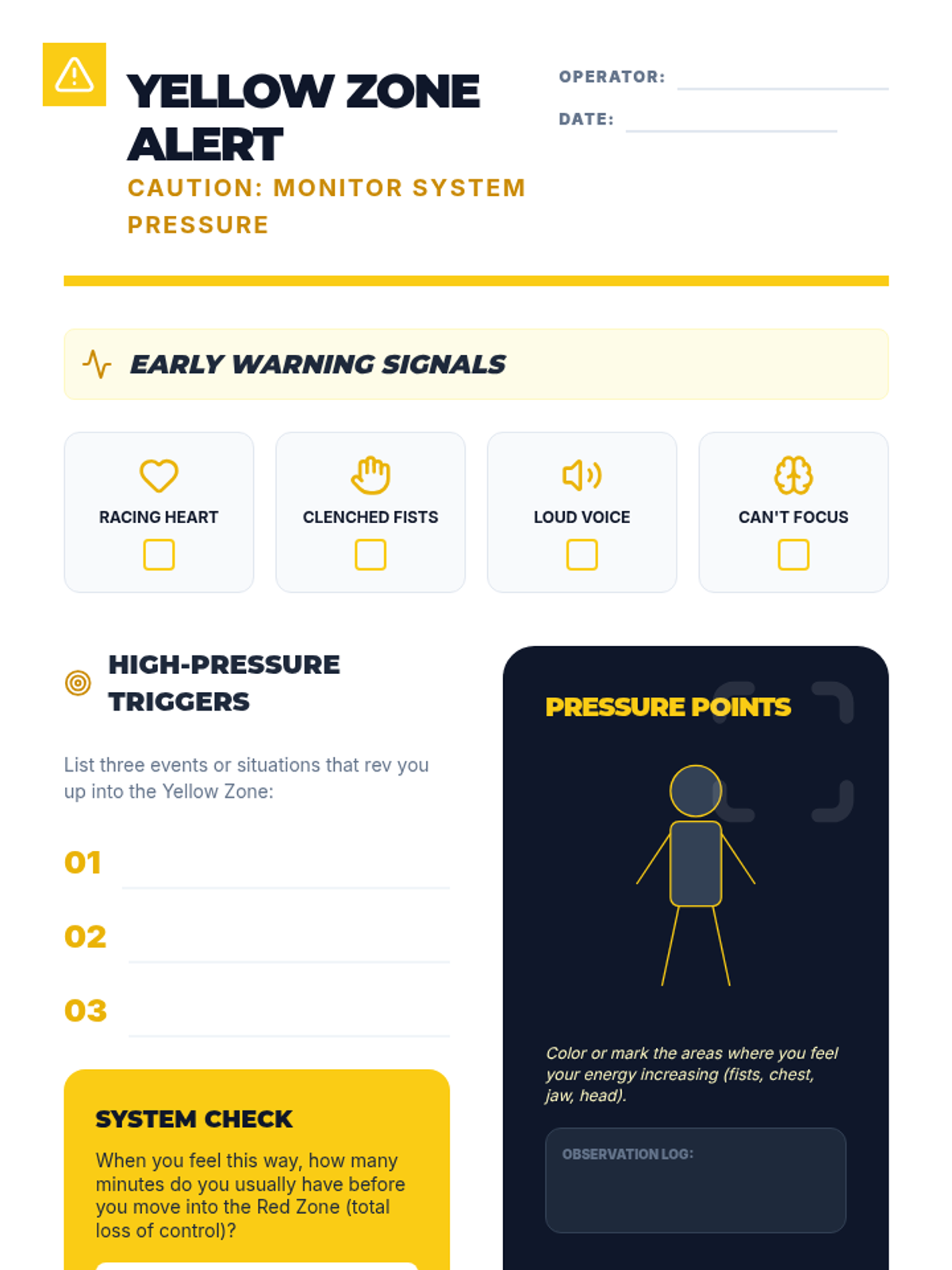Explores the Yellow Zone (frustrated, anxious, silly, wiggly) by mapping physical sensations and identifying 'Yellow Light' warning signs and 'Brake' strategies.