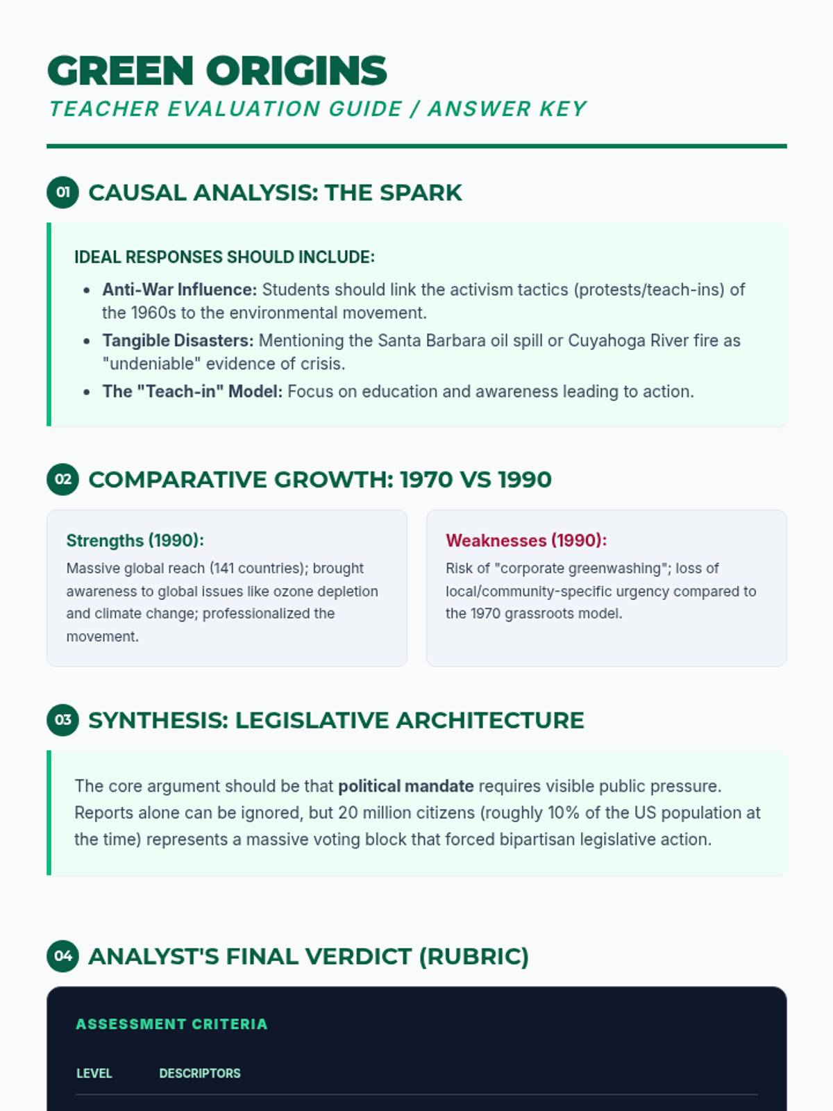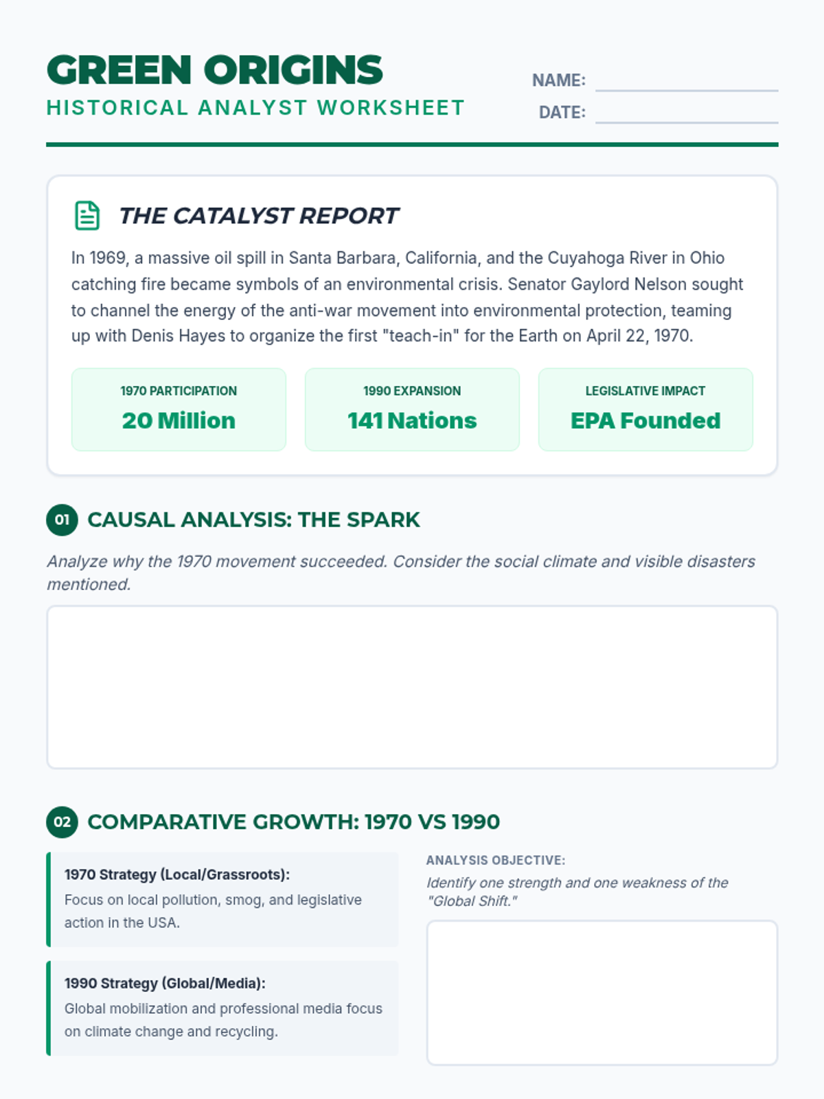 A lesson exploring the socio-political origins of Earth Day, focusing on the 1970 movement and its evolution into a global phenomenon. Students analyze historical catalysts and the impact of environmental advocacy.